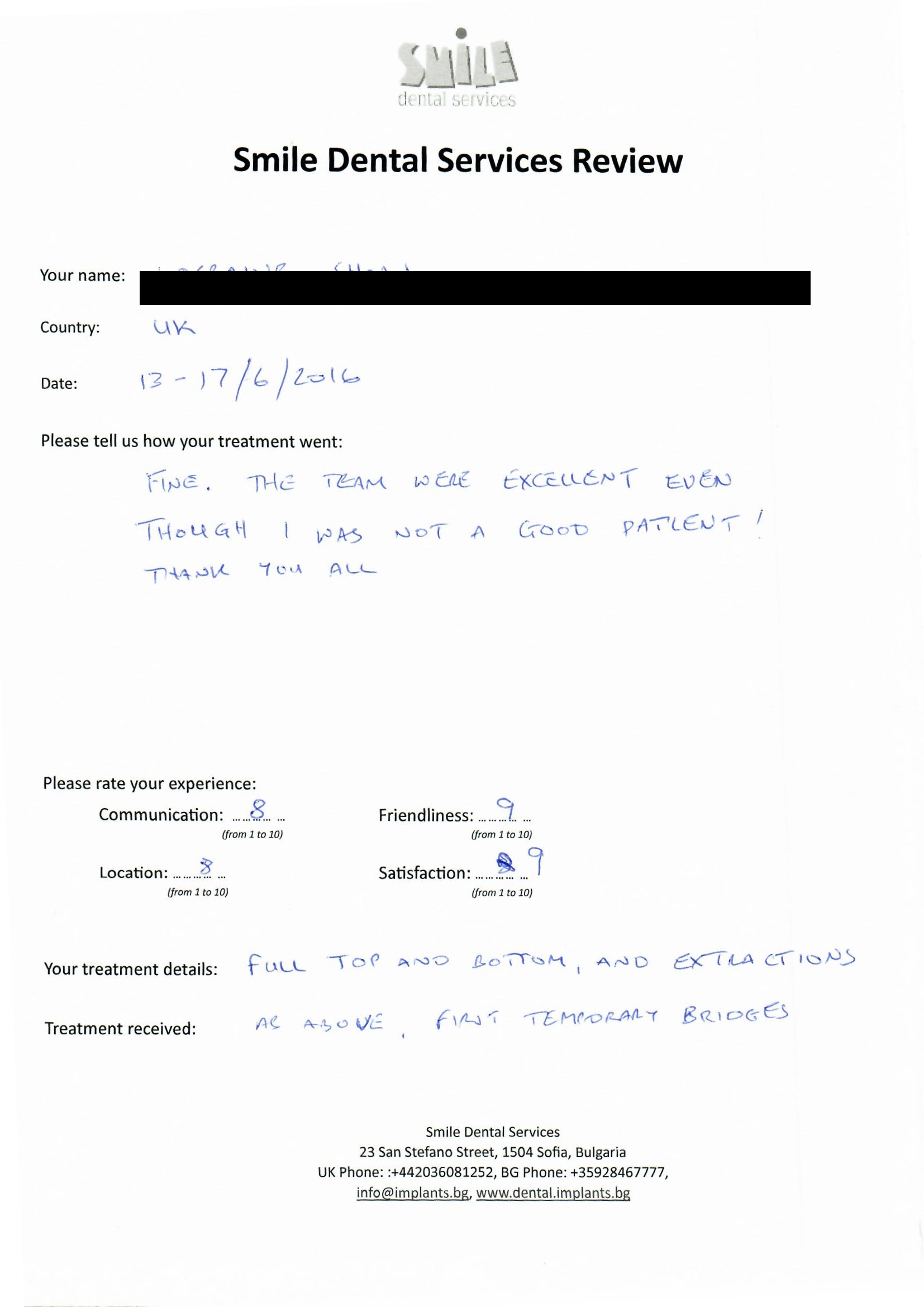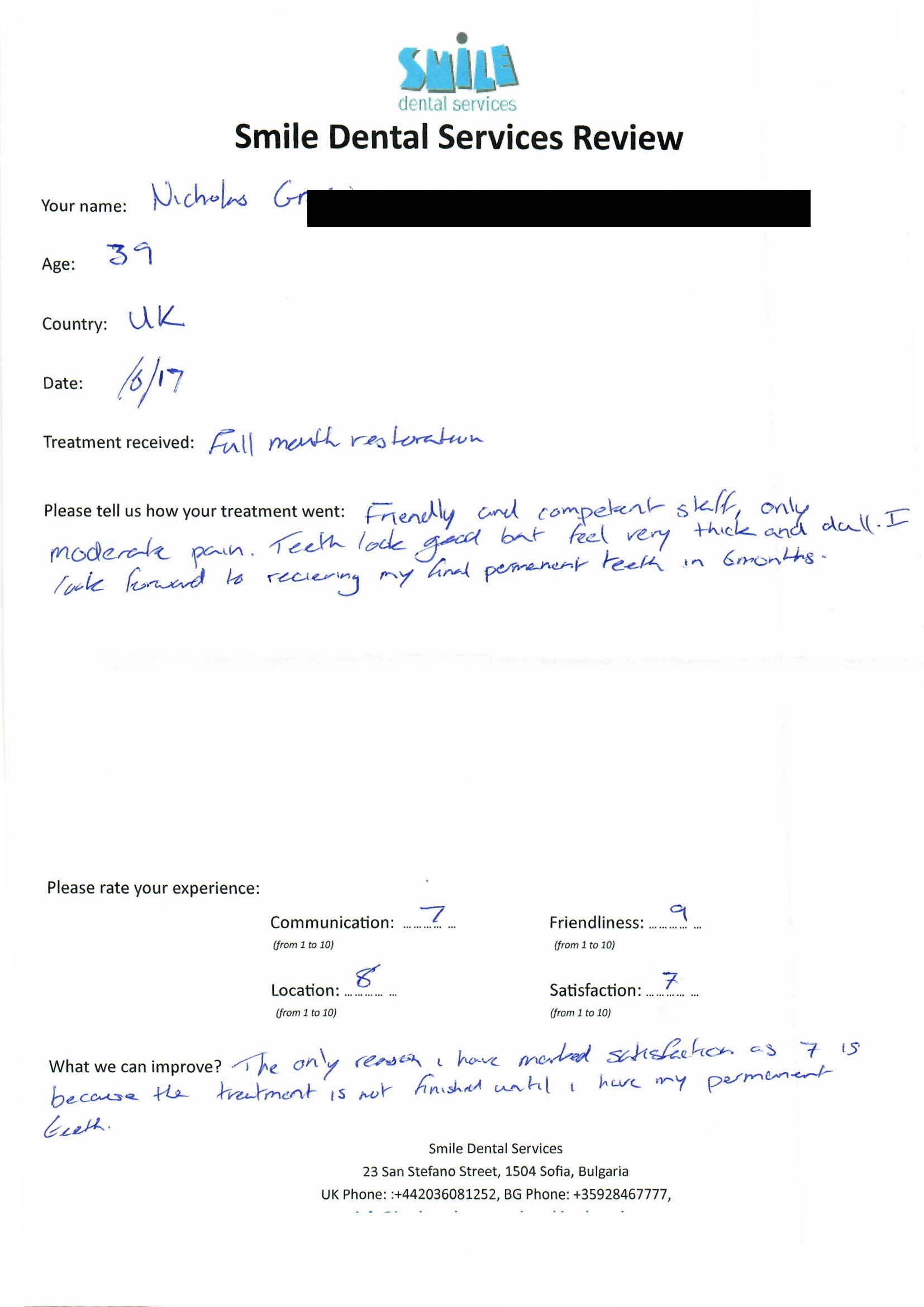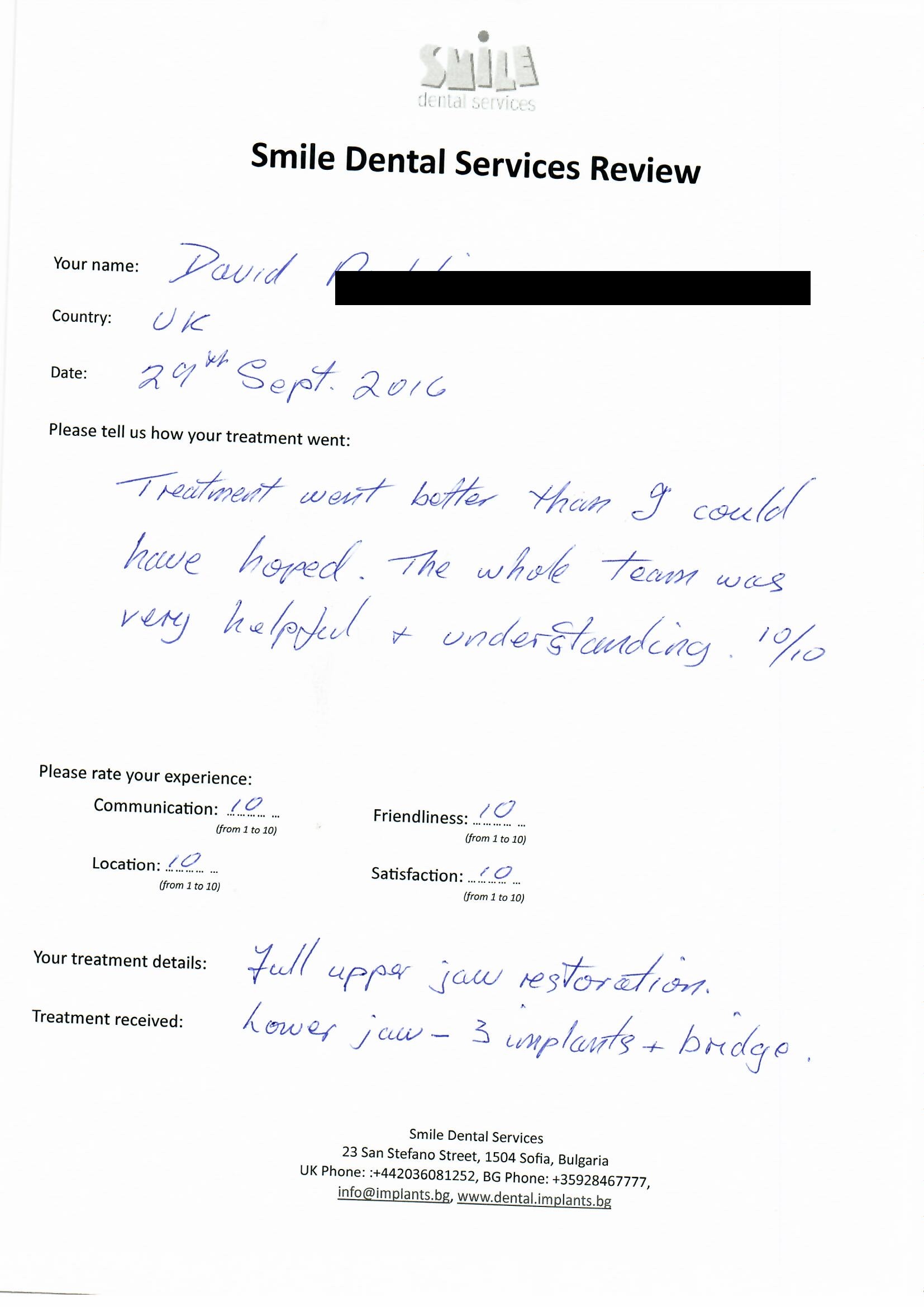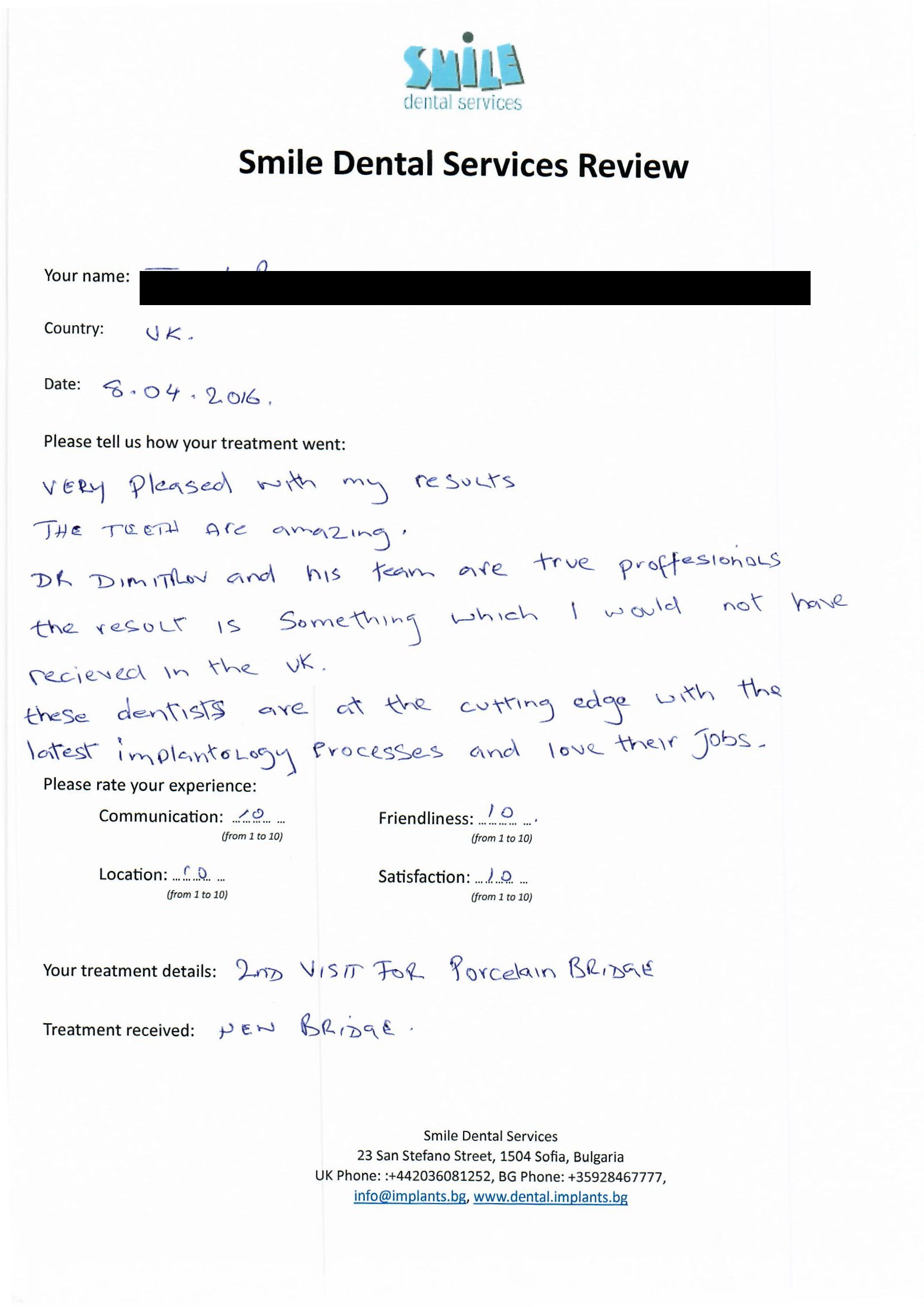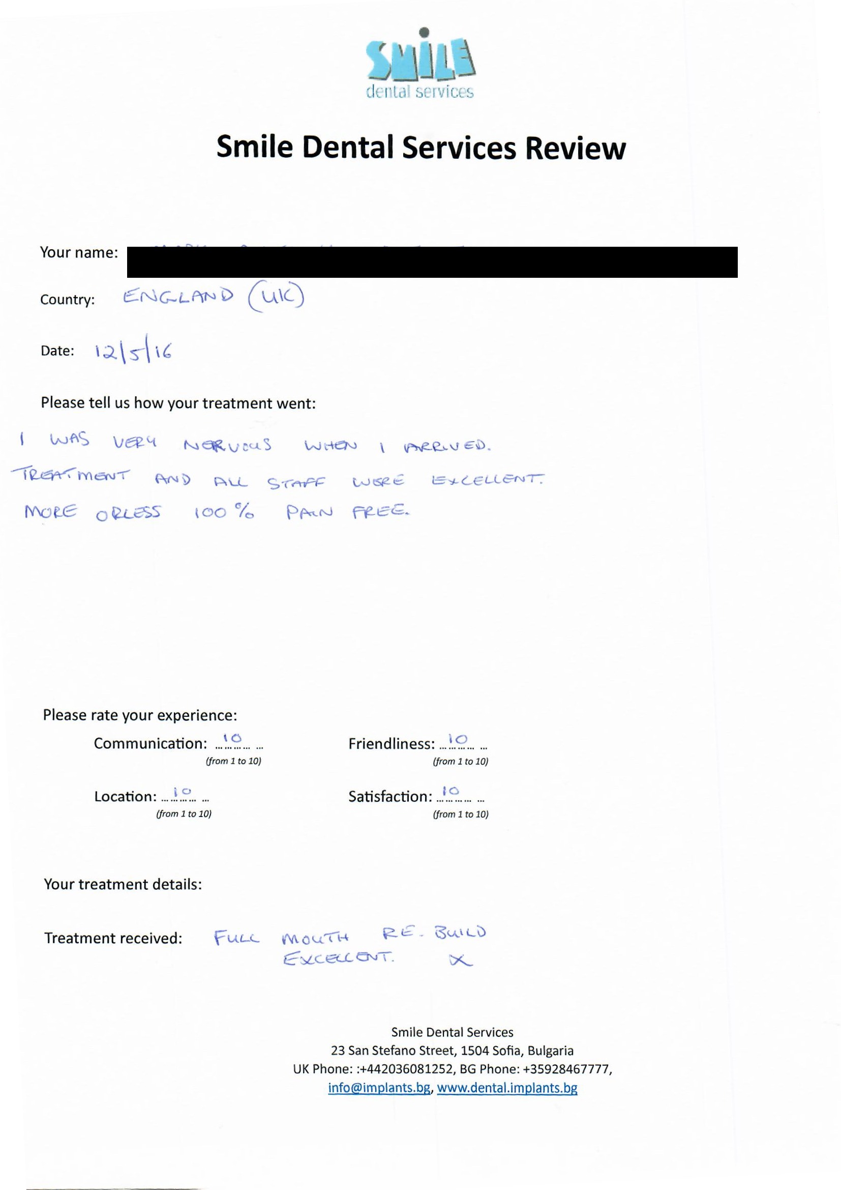 From booking my treatment till now the whole experience has been great. I suffered with poor teeth since I was a kid, dentists in the UK didn't offer much help or trust. Loads of people asked my why I was going to Bulgaria for treatment, I guess the result and the smooth handling of my case by yourself and your team are why. Are there things you could improve, yes.