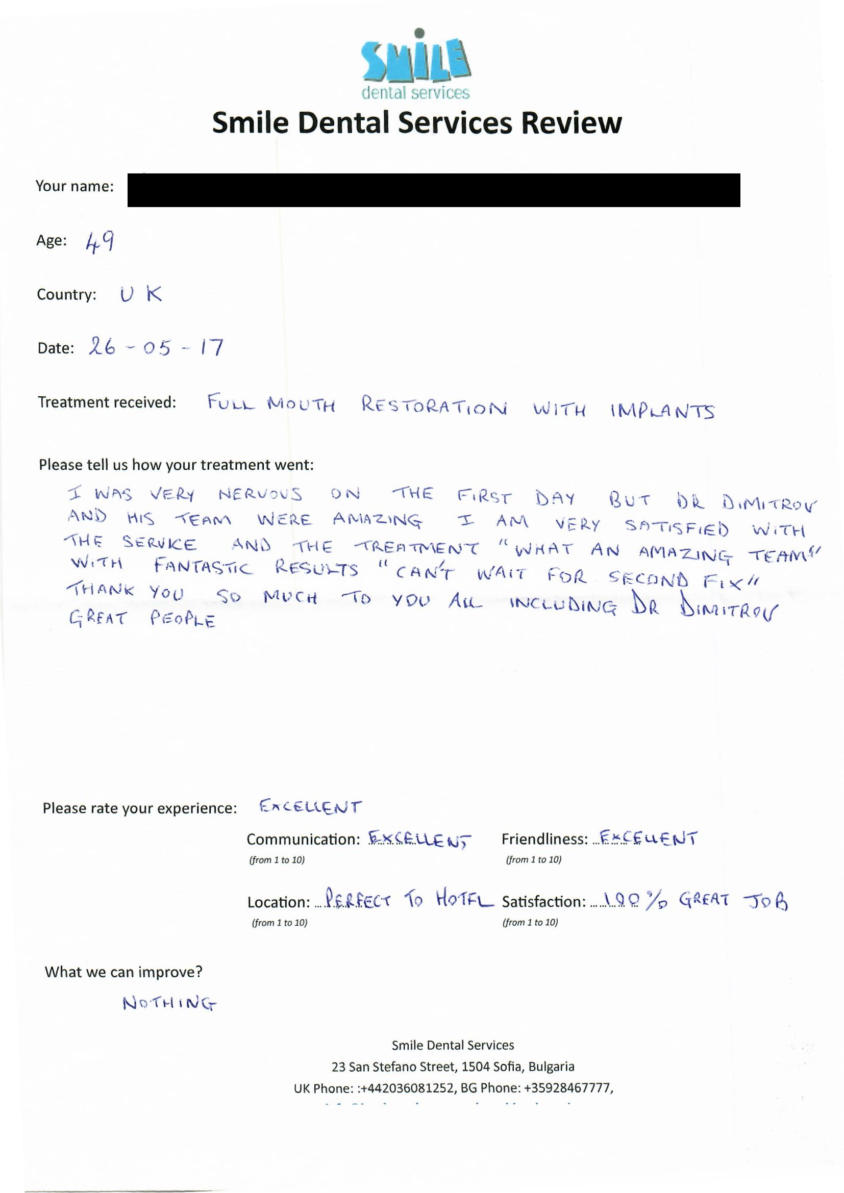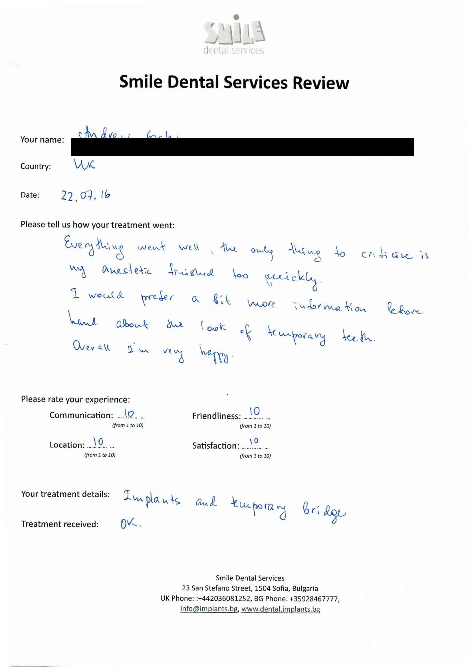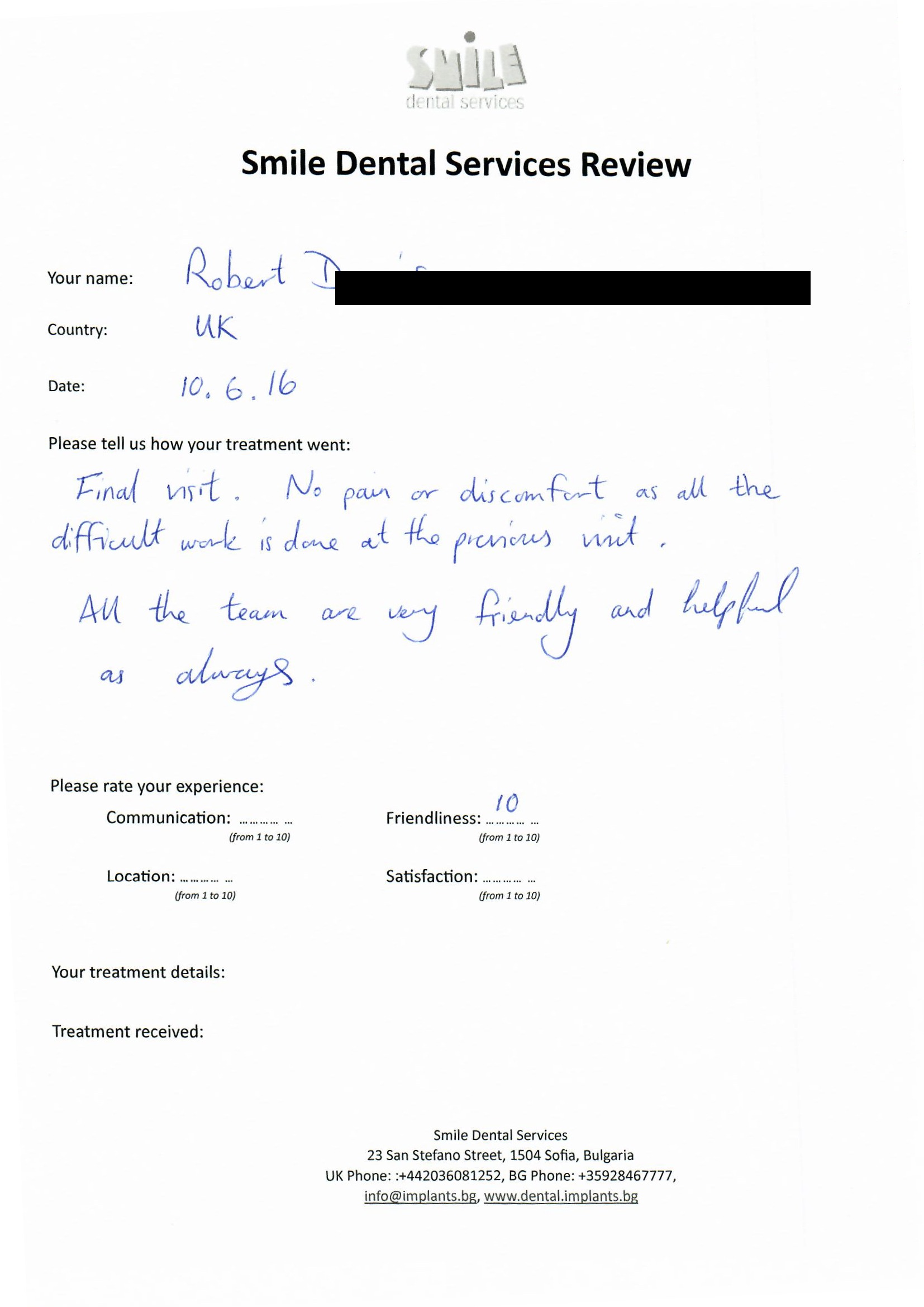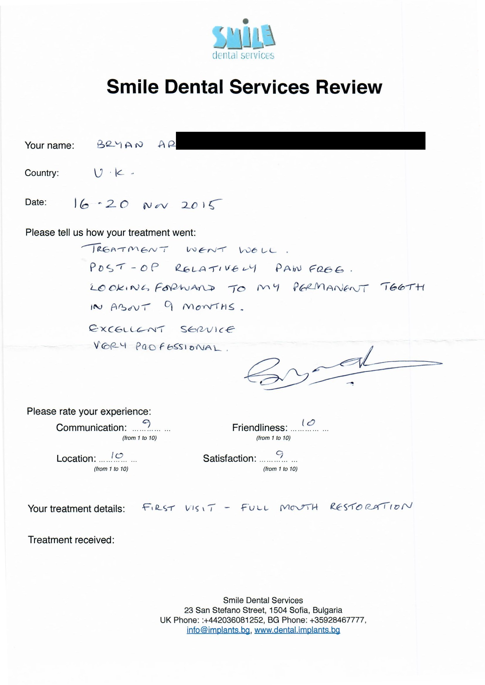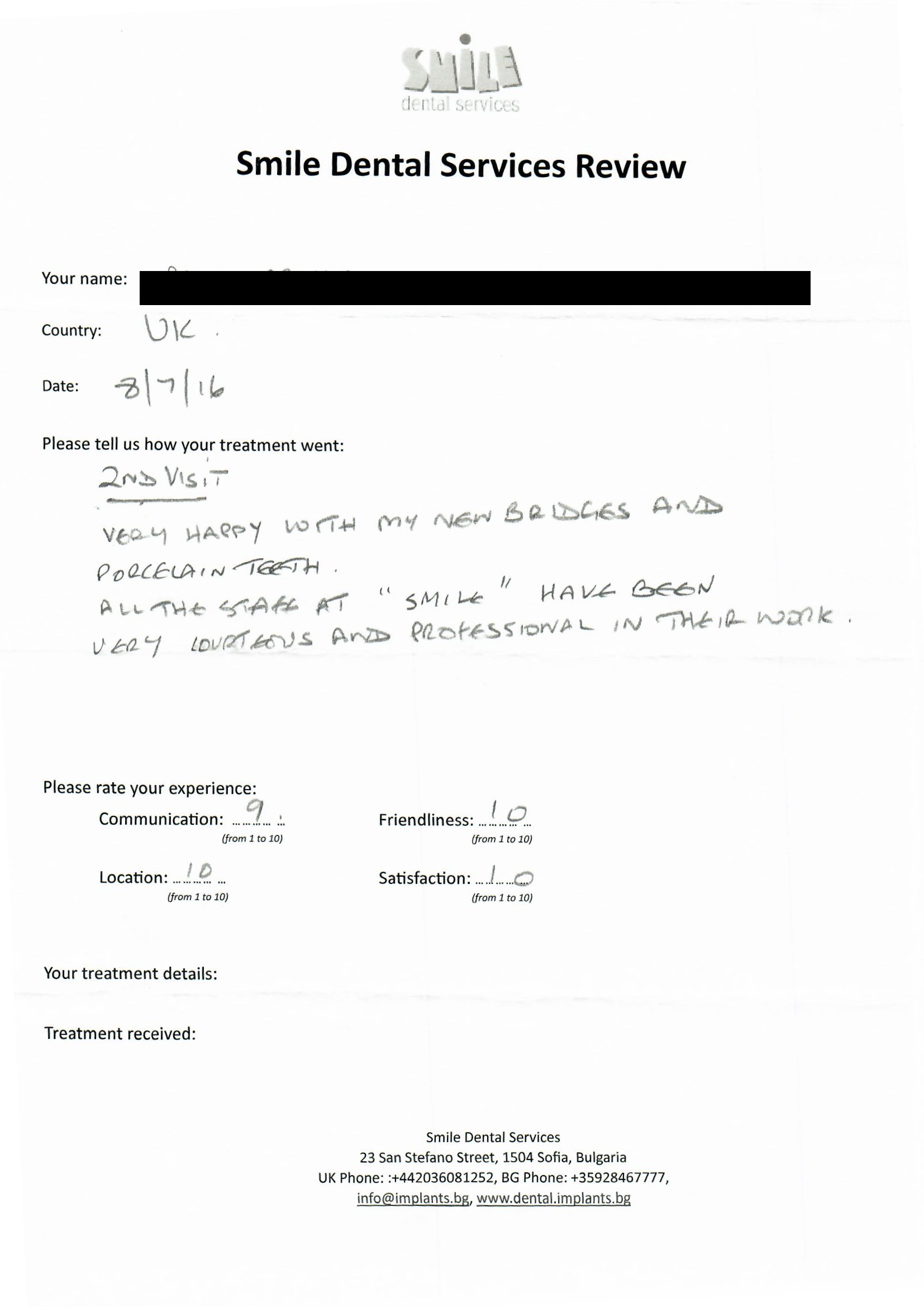 From booking my treatment till now the whole experience has been great. I suffered with poor teeth since I was a kid, dentists in the UK didn't offer much help or trust. Loads of people asked my why I was going to Bulgaria for treatment, I guess the result and the smooth handling of my case by yourself and your team are why. Are there things you could improve, yes.