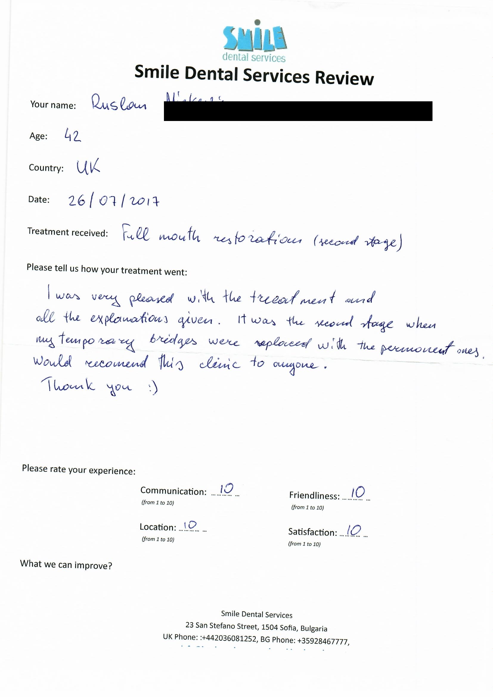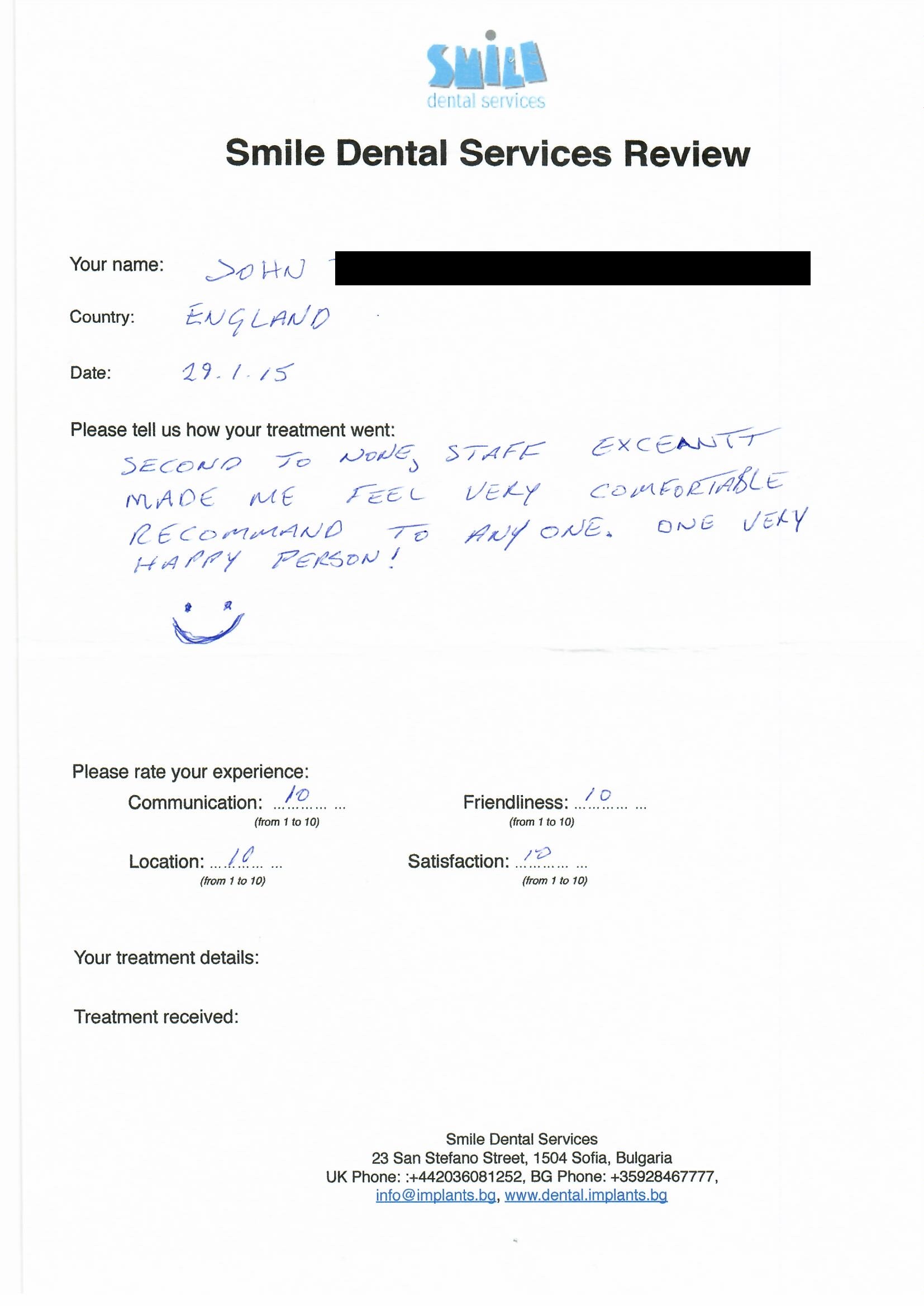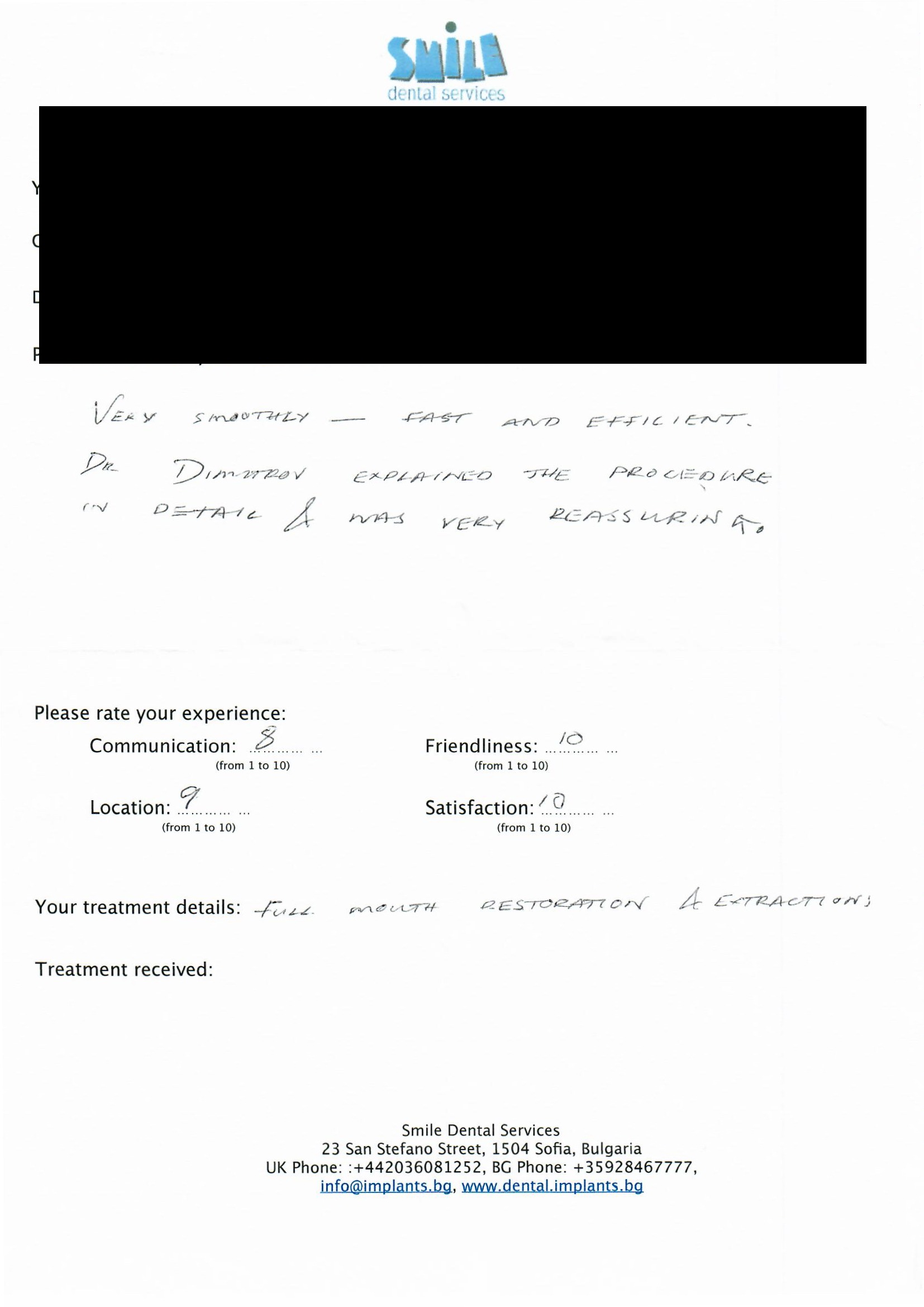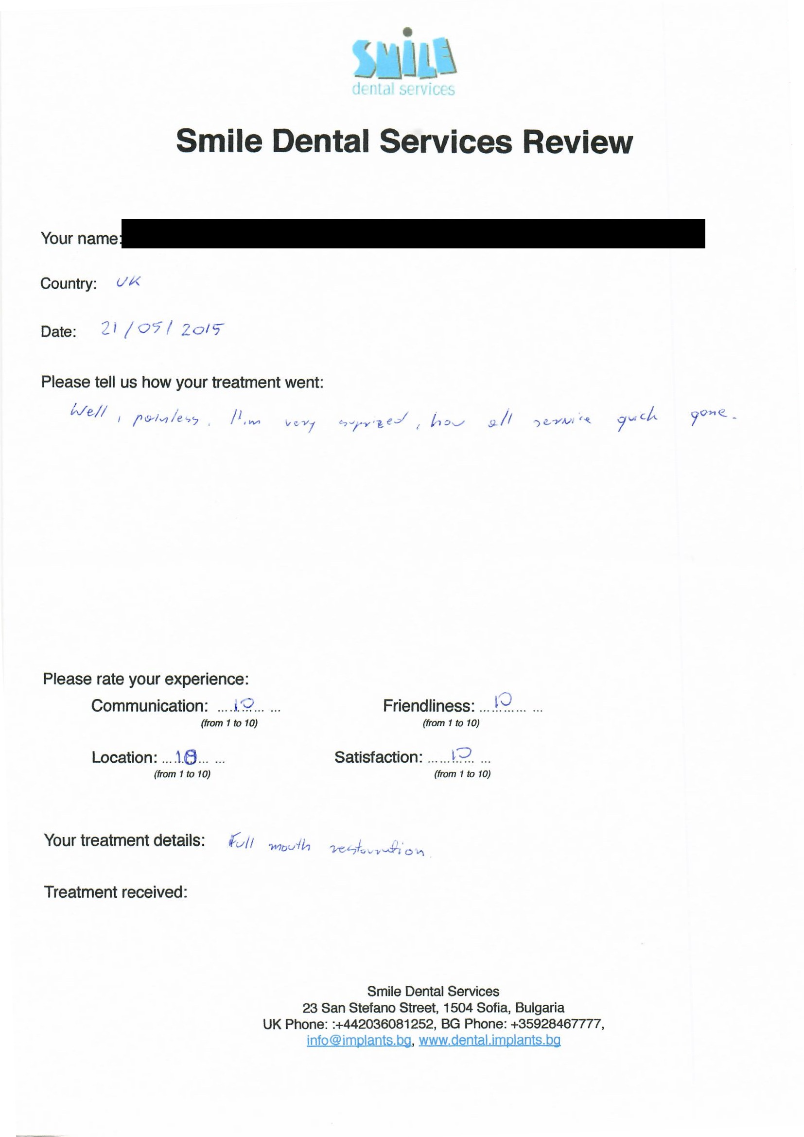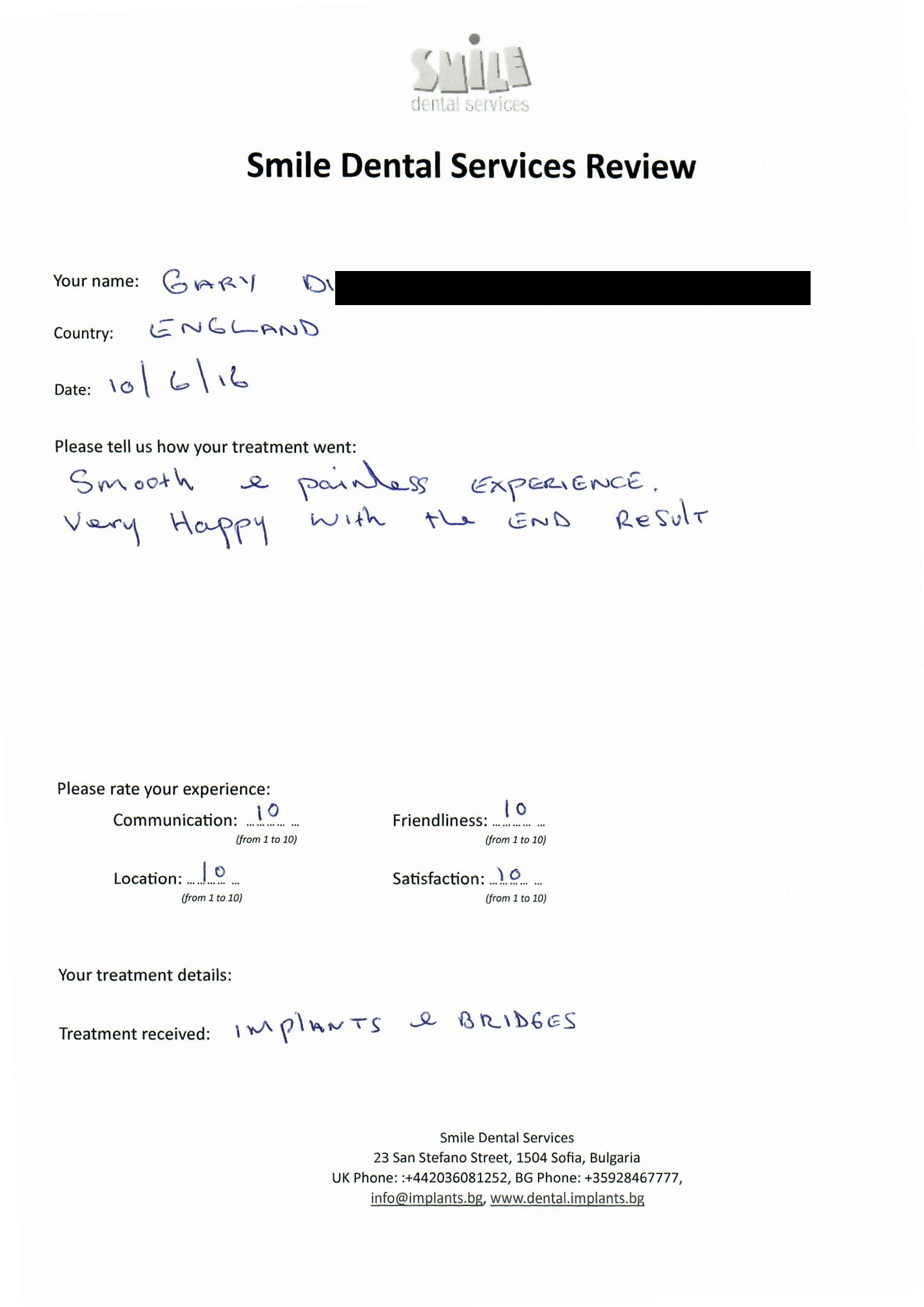 From booking my treatment till now the whole experience has been great. I suffered with poor teeth since I was a kid, dentists in the UK didn't offer much help or trust. Loads of people asked my why I was going to Bulgaria for treatment, I guess the result and the smooth handling of my case by yourself and your team are why. Are there things you could improve, yes.