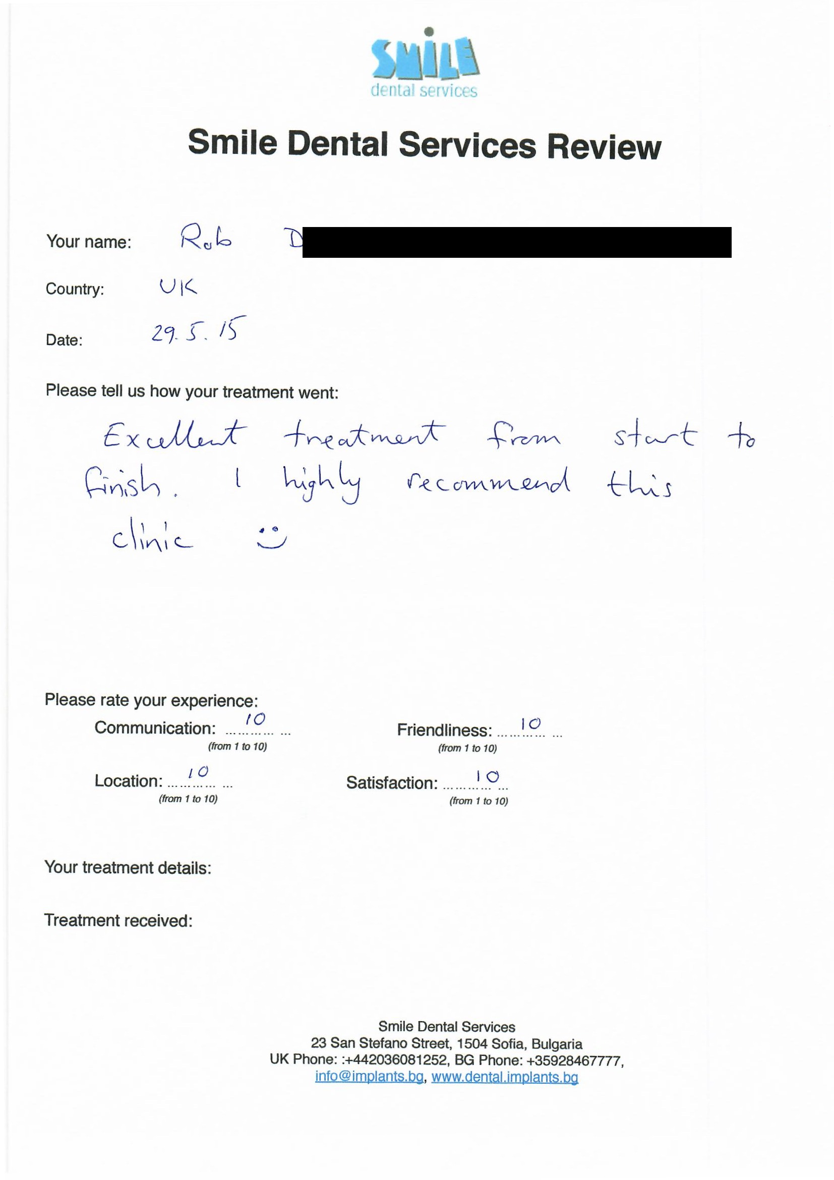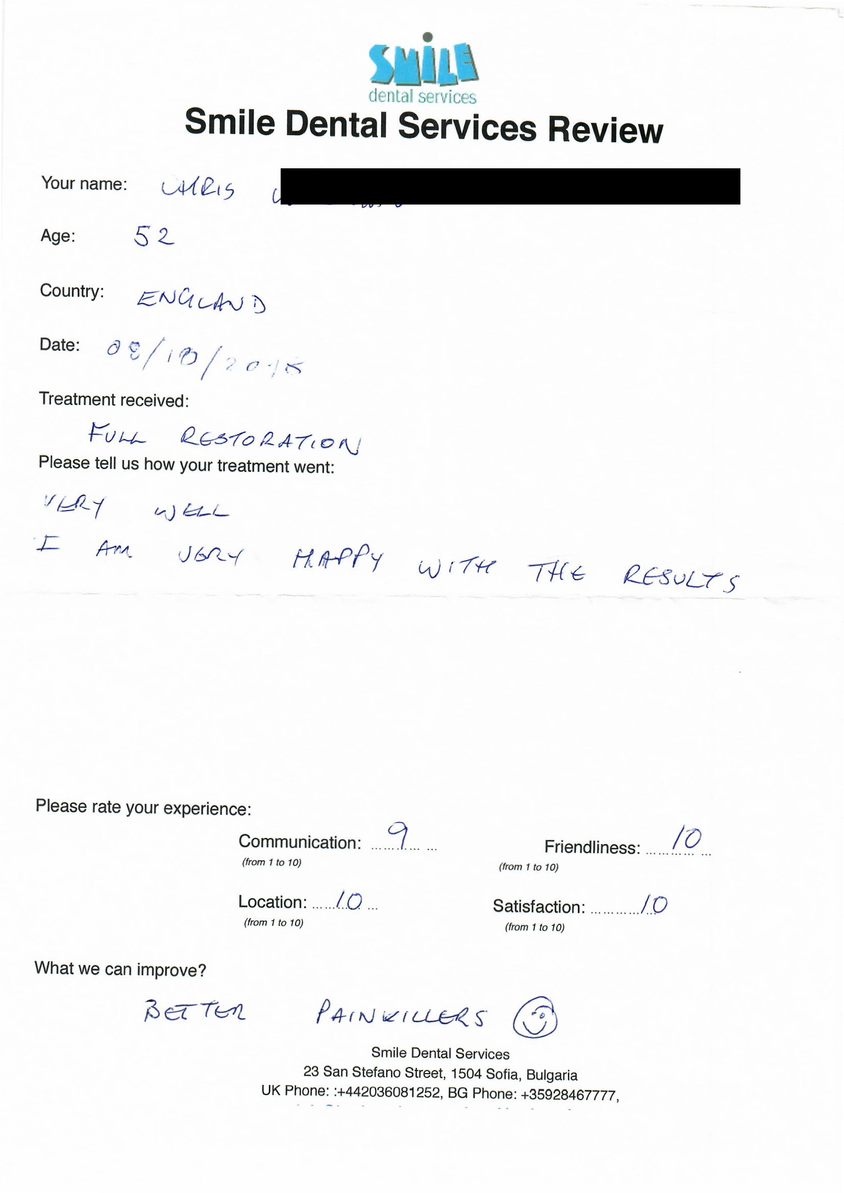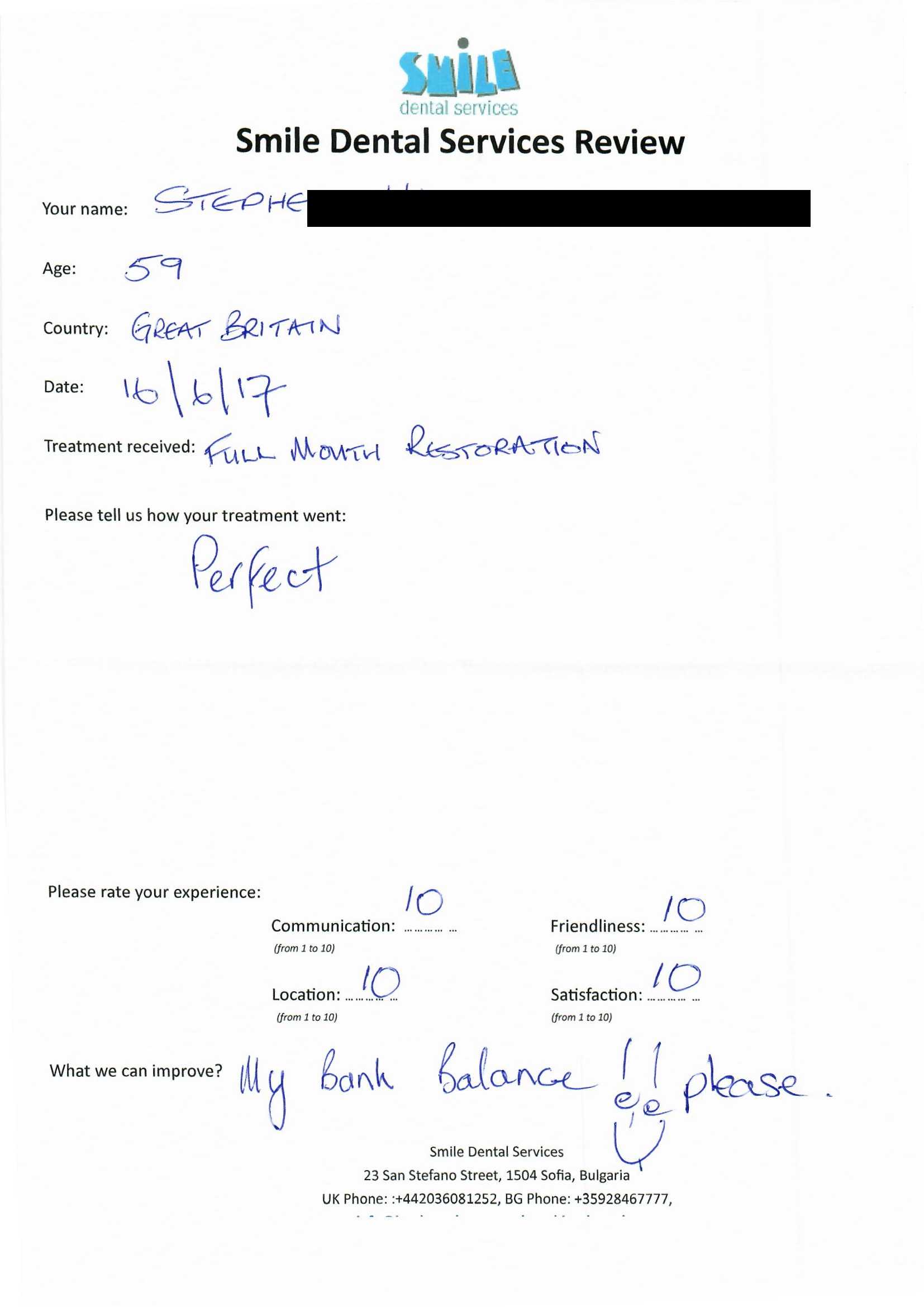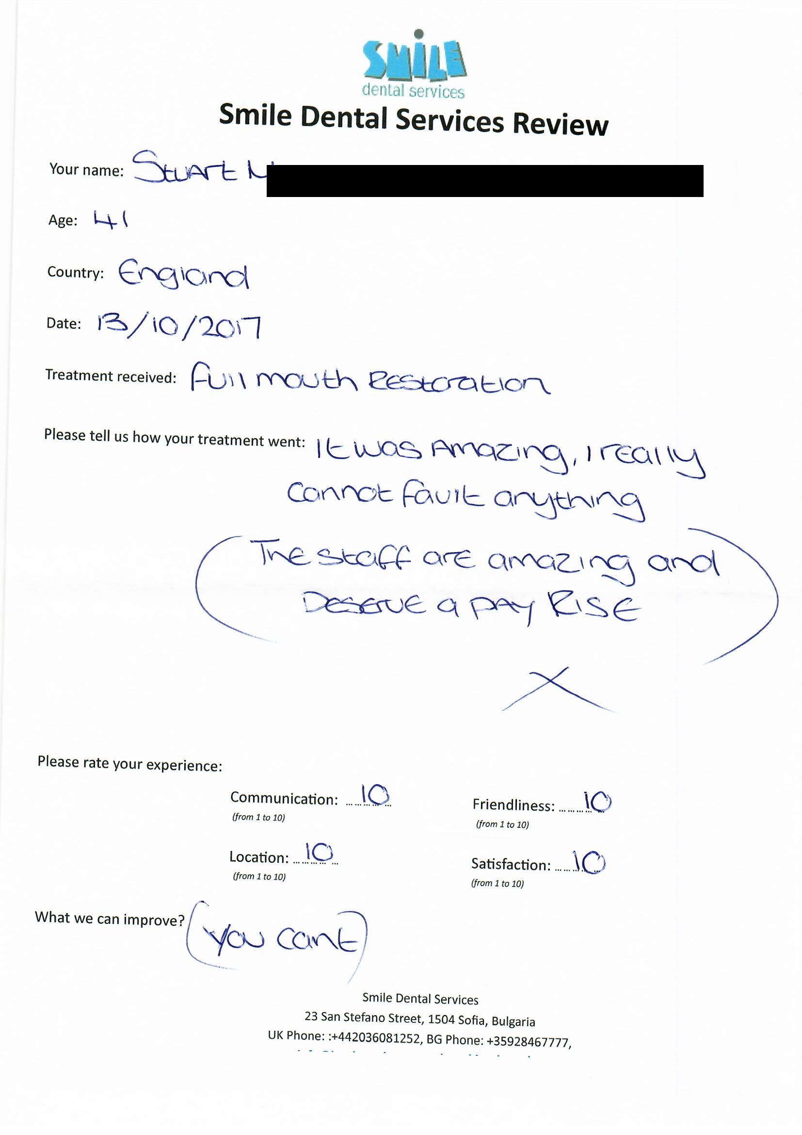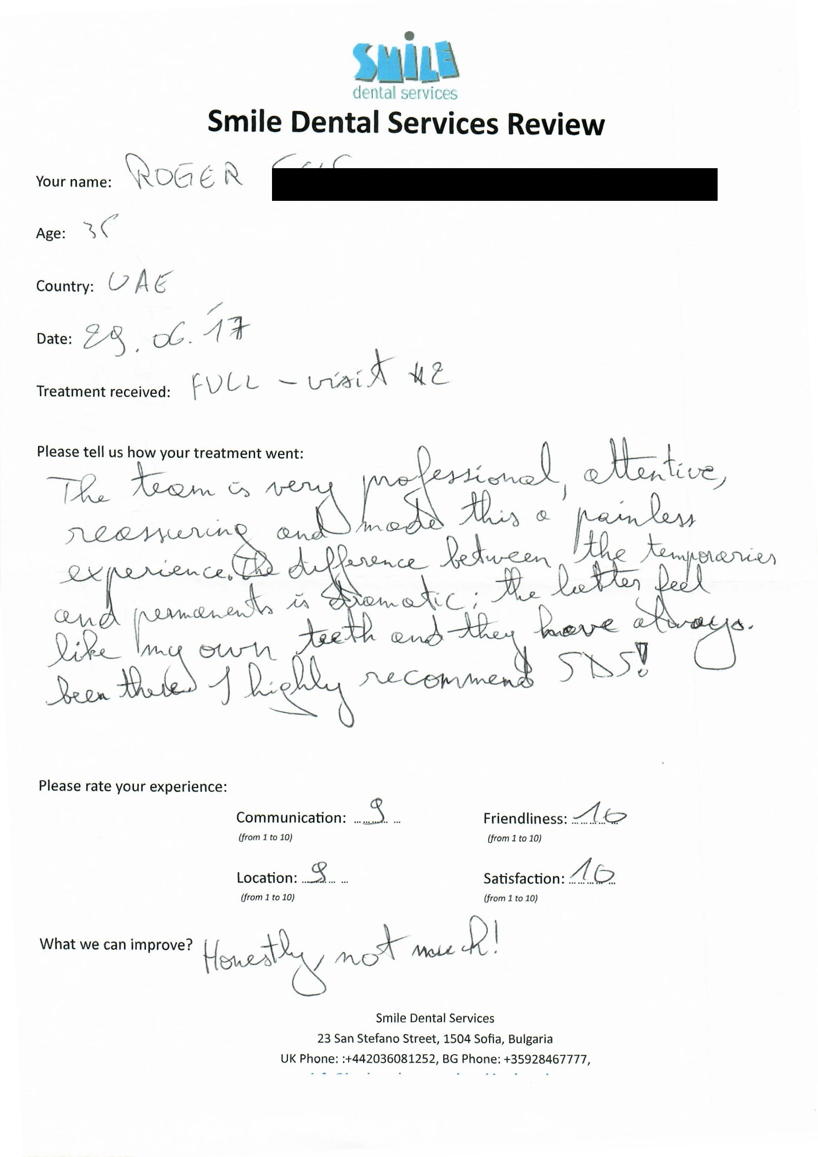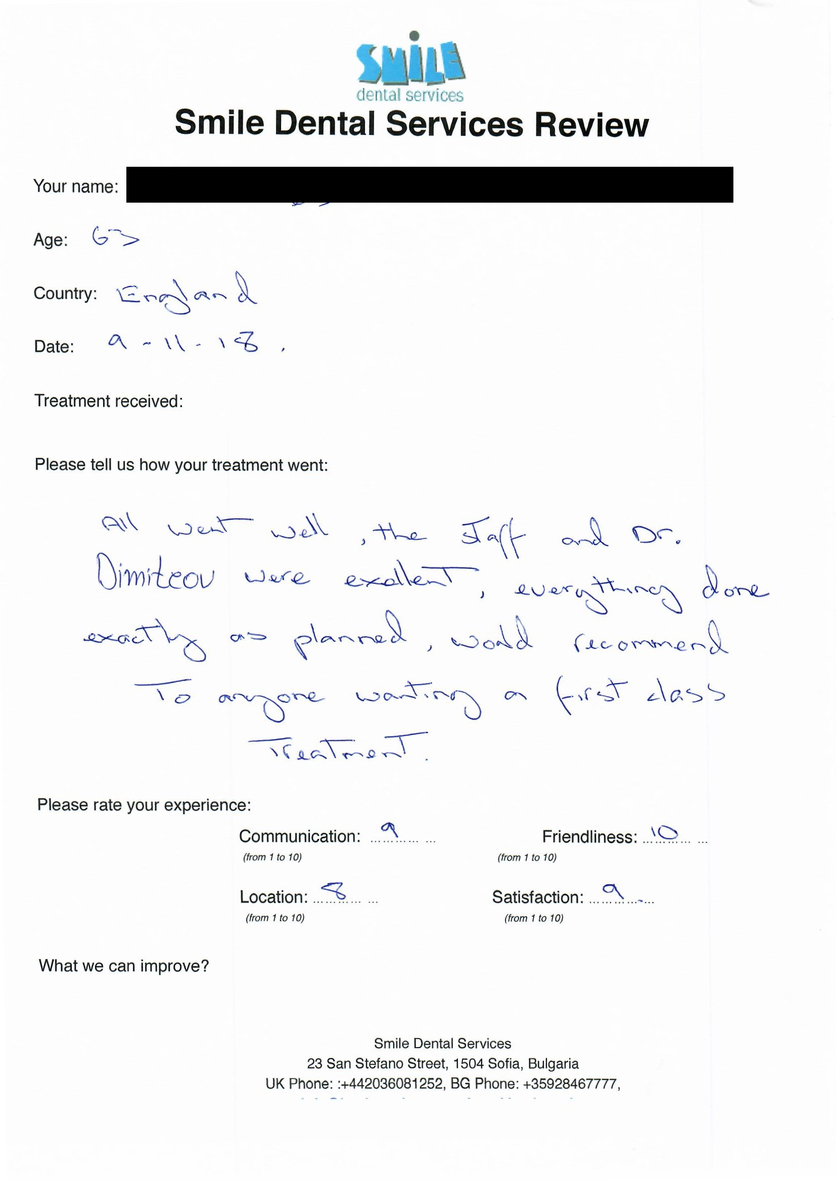 From booking my treatment till now the whole experience has been great. I suffered with poor teeth since I was a kid, dentists in the UK didn't offer much help or trust. Loads of people asked my why I was going to Bulgaria for treatment, I guess the result and the smooth handling of my case by yourself and your team are why. Are there things you could improve, yes.