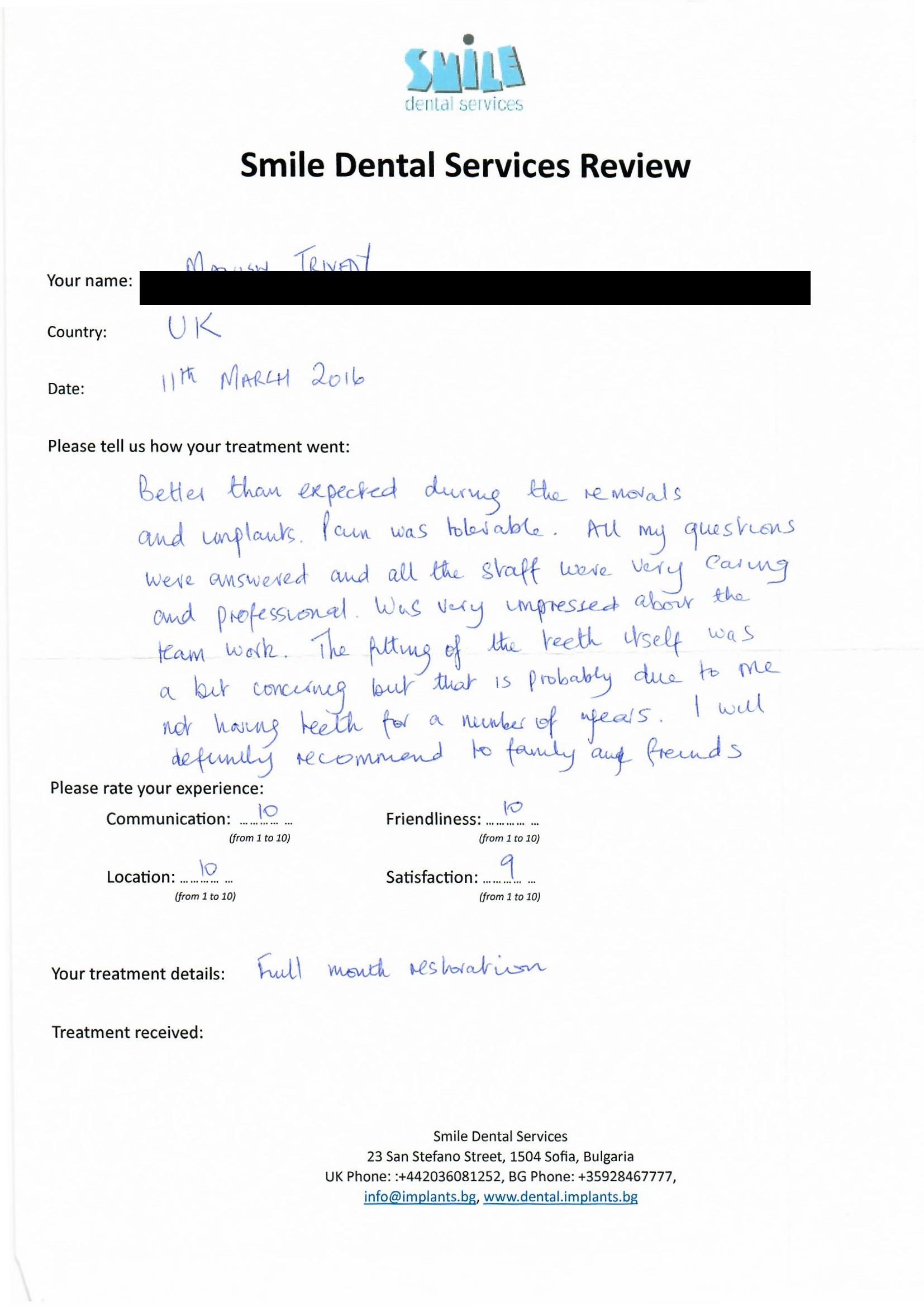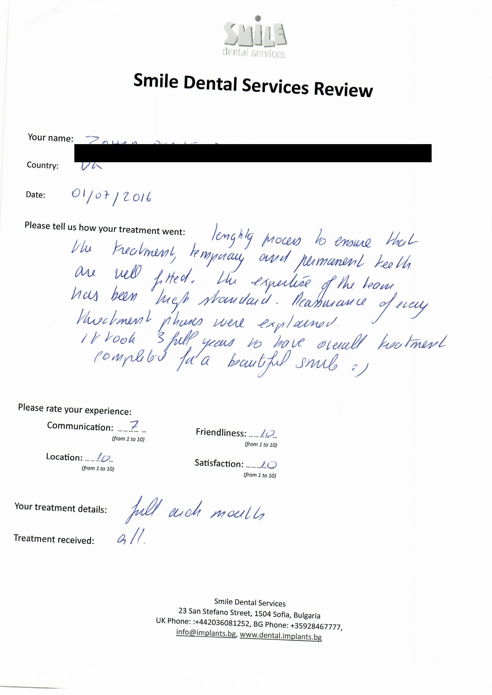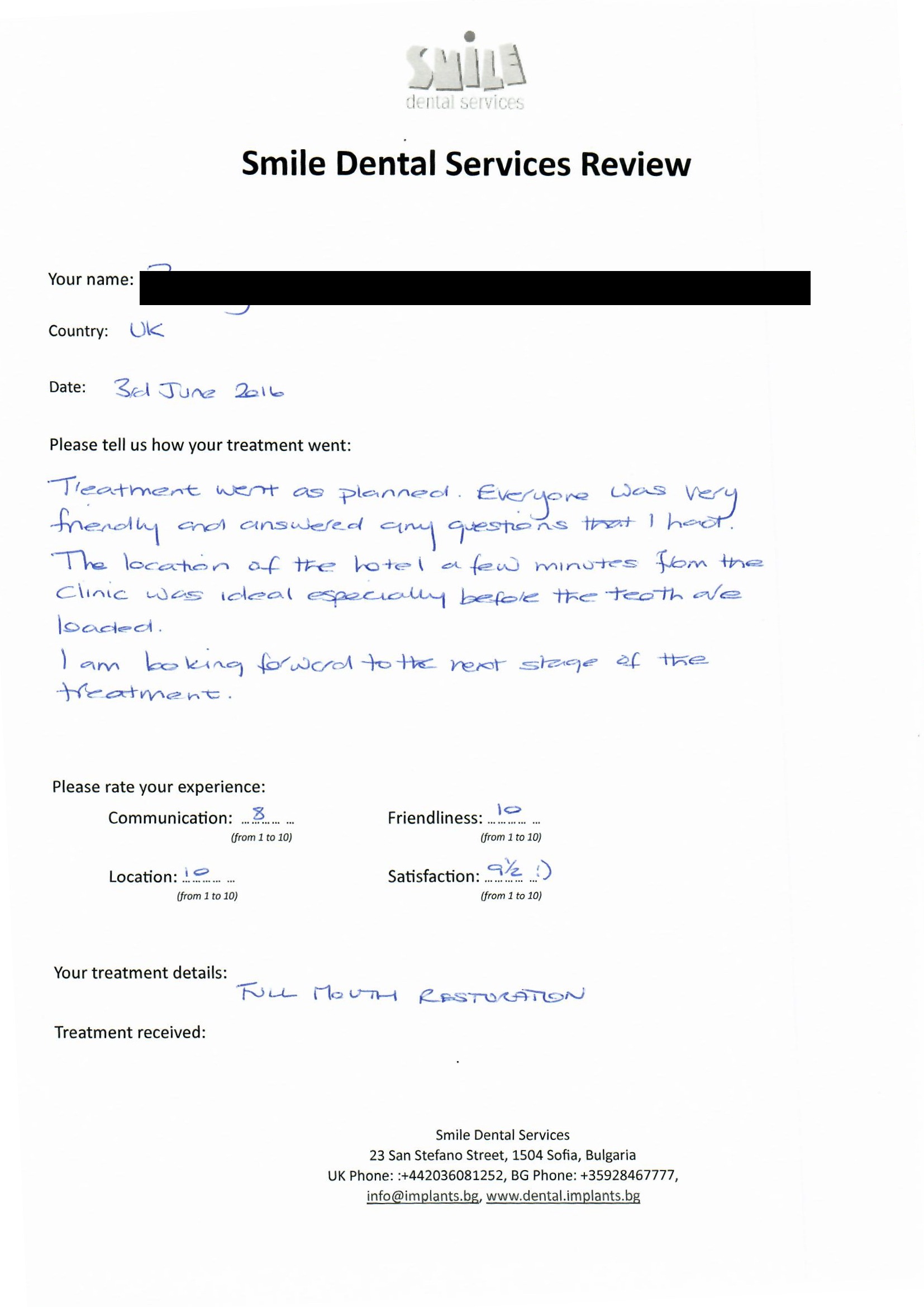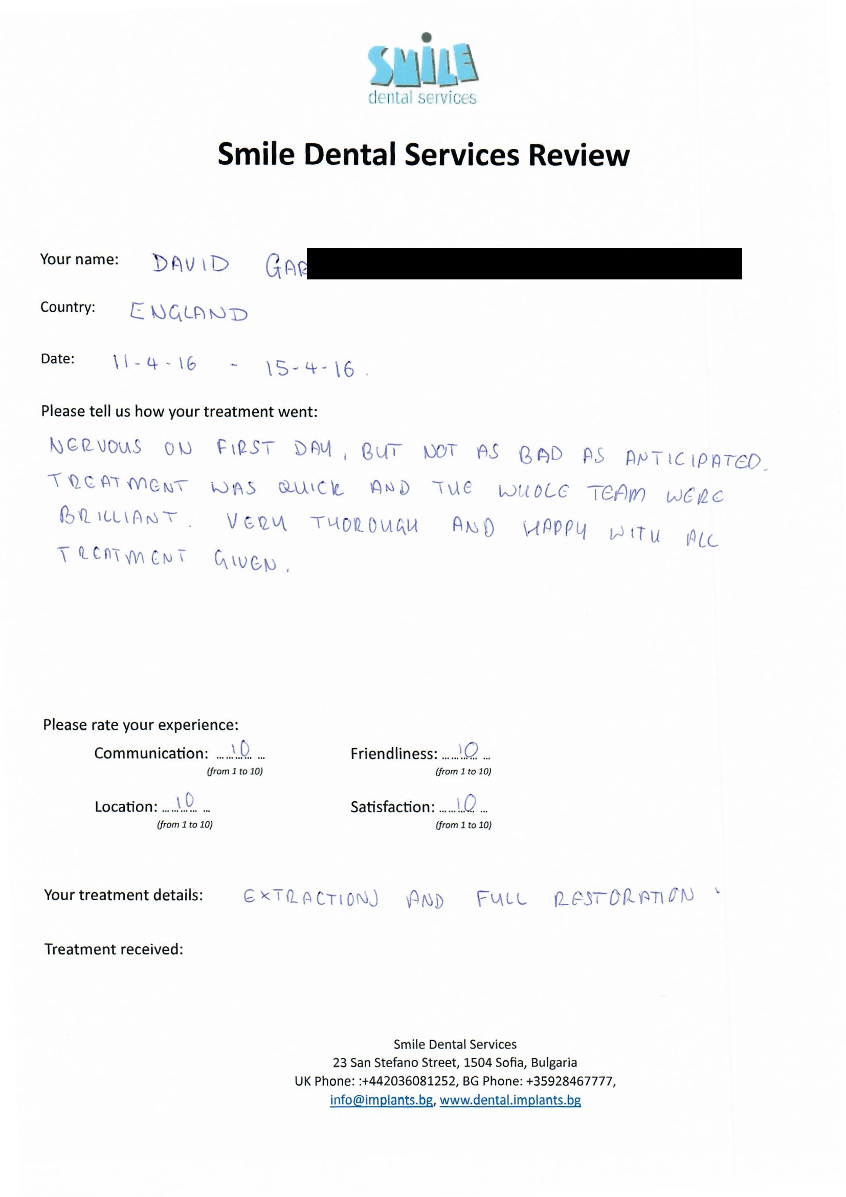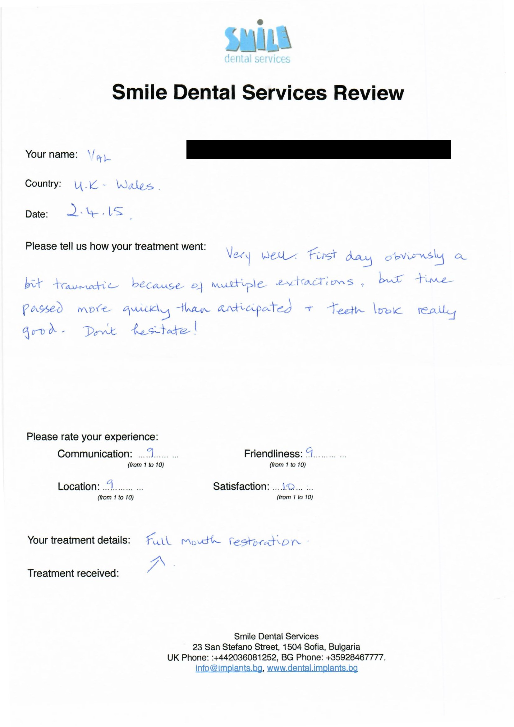 From booking my treatment till now the whole experience has been great. I suffered with poor teeth since I was a kid, dentists in the UK didn't offer much help or trust. Loads of people asked my why I was going to Bulgaria for treatment, I guess the result and the smooth handling of my case by yourself and your team are why. Are there things you could improve, yes.