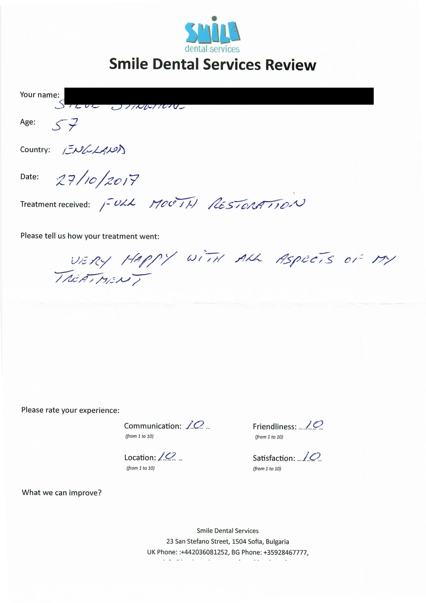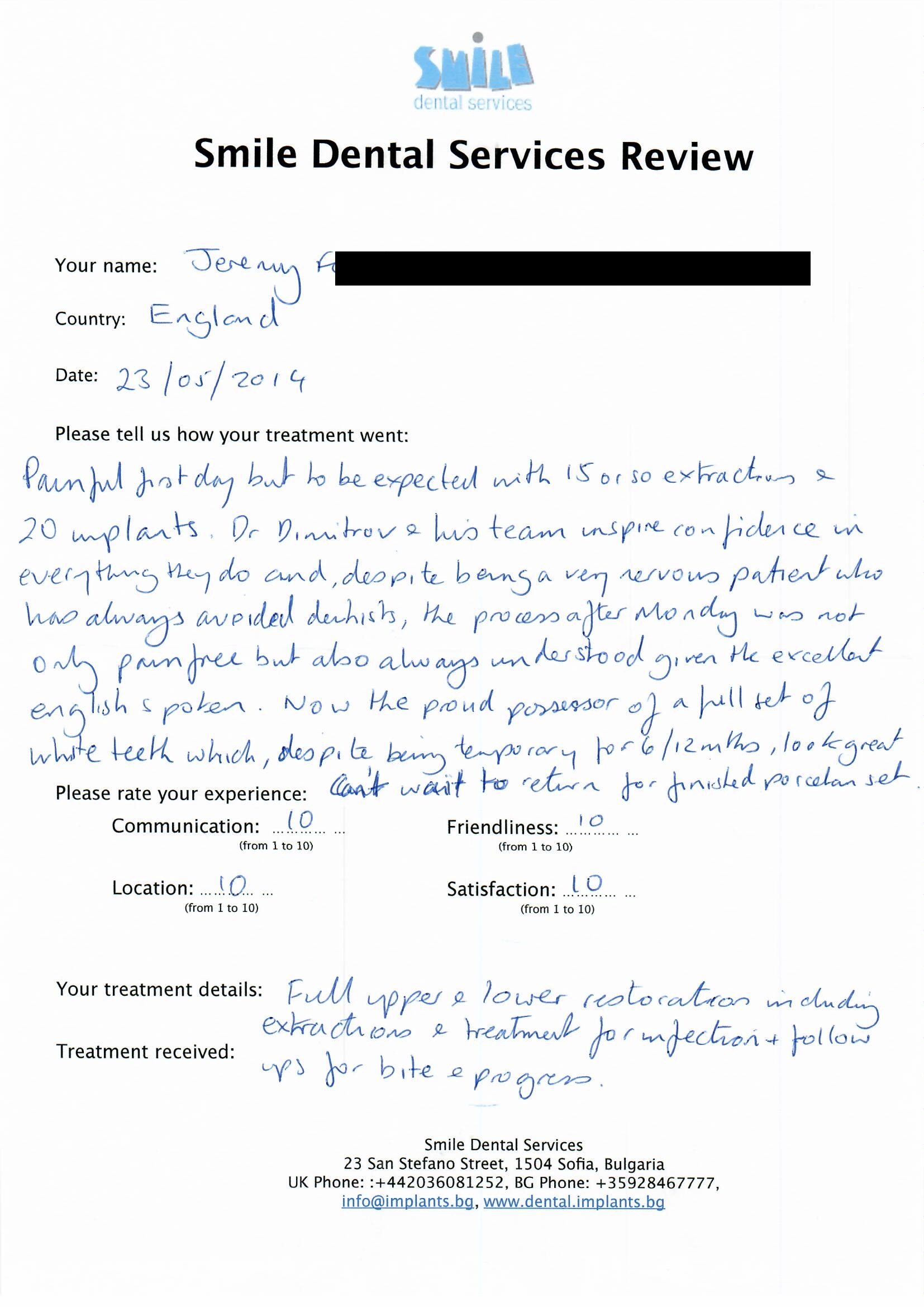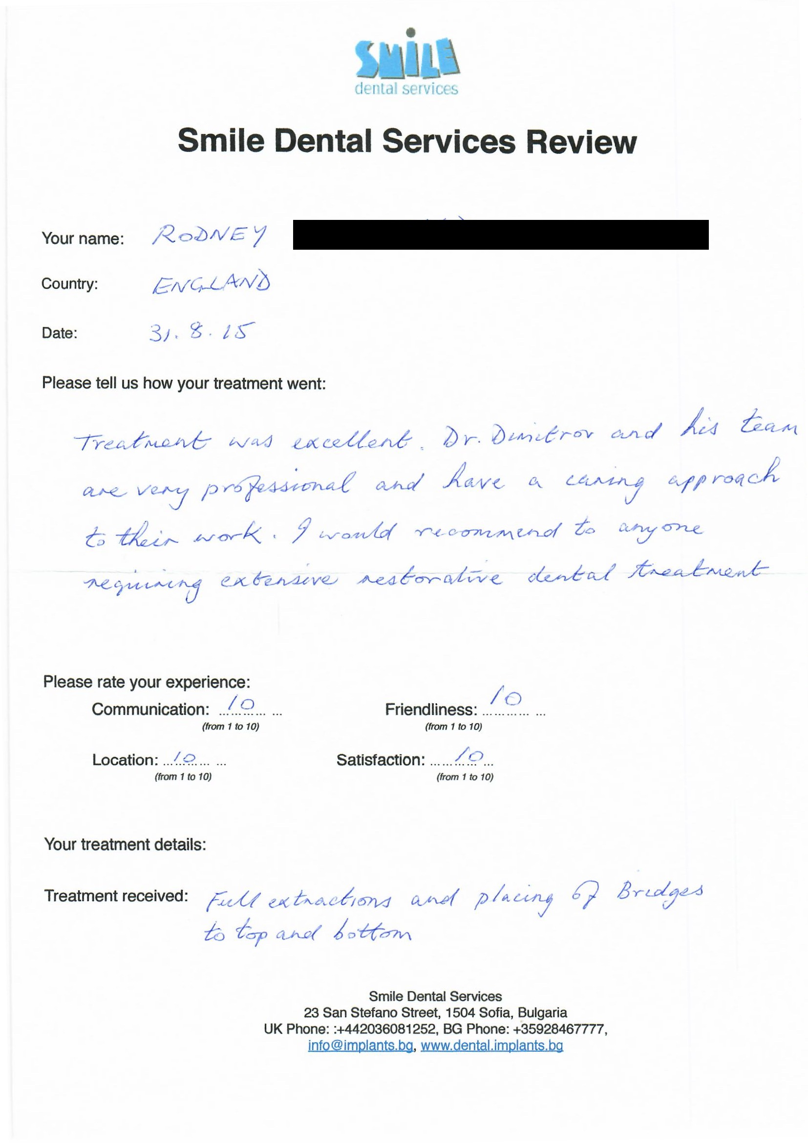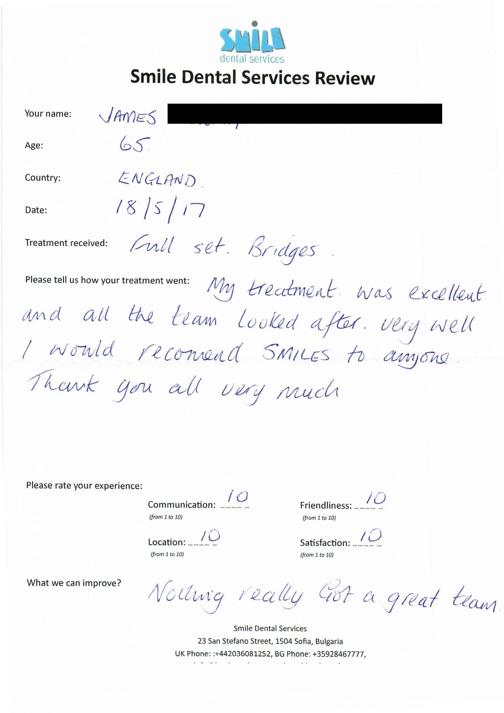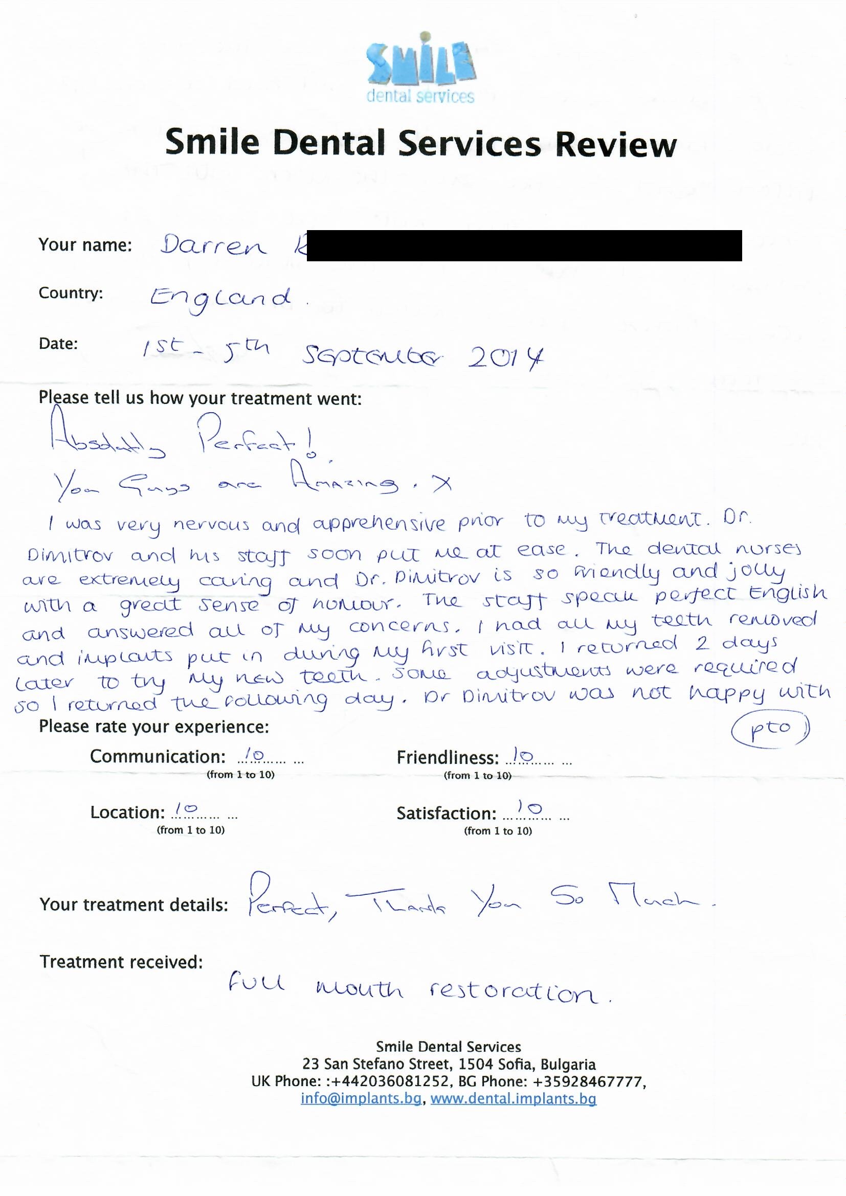From booking my treatment till now the whole experience has been great. I suffered with poor teeth since I was a kid, dentists in the UK didn't offer much help or trust. Loads of people asked my why I was going to Bulgaria for treatment, I guess the result and the smooth handling of my case by yourself and your team are why. Are there things you could improve, yes.