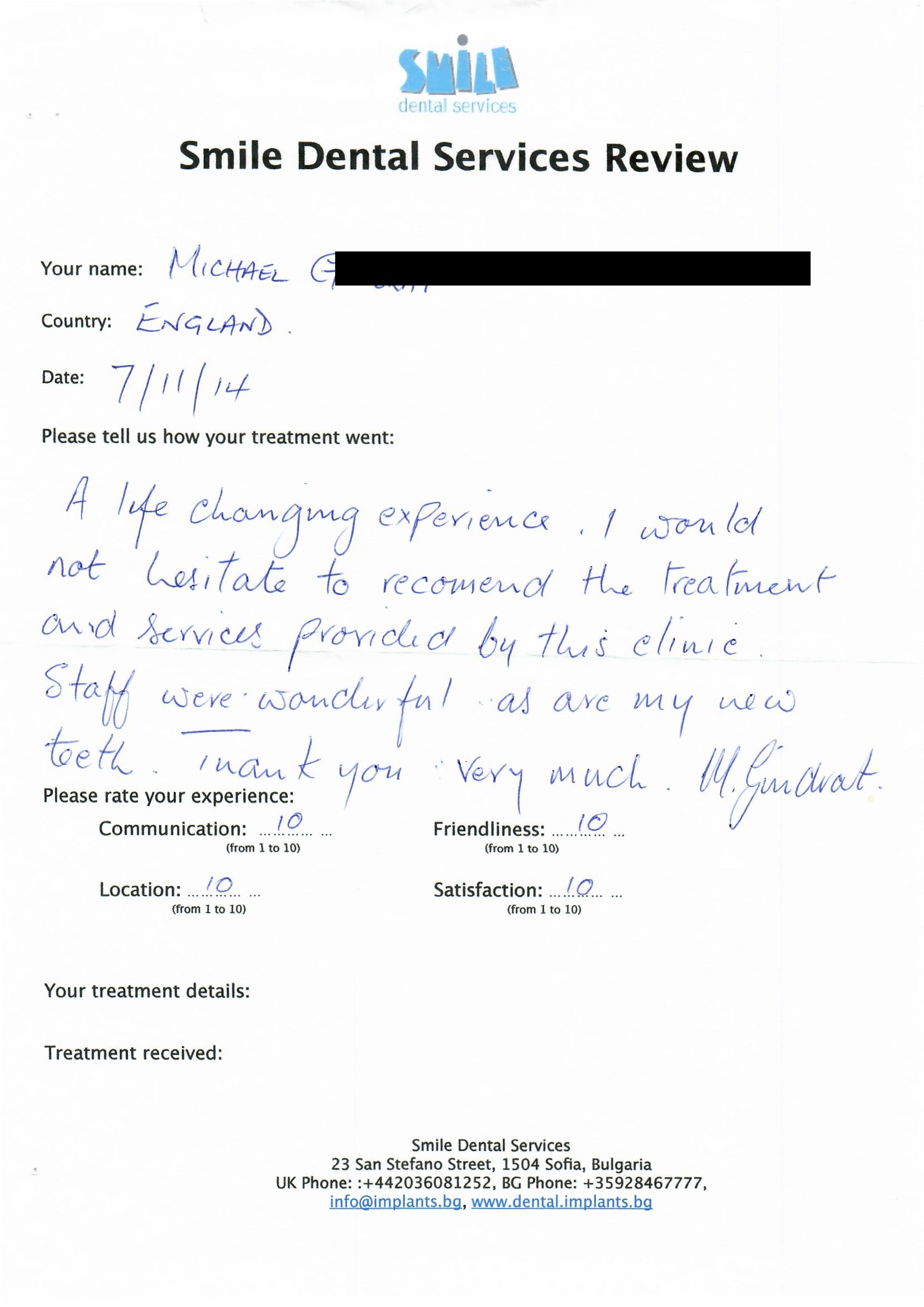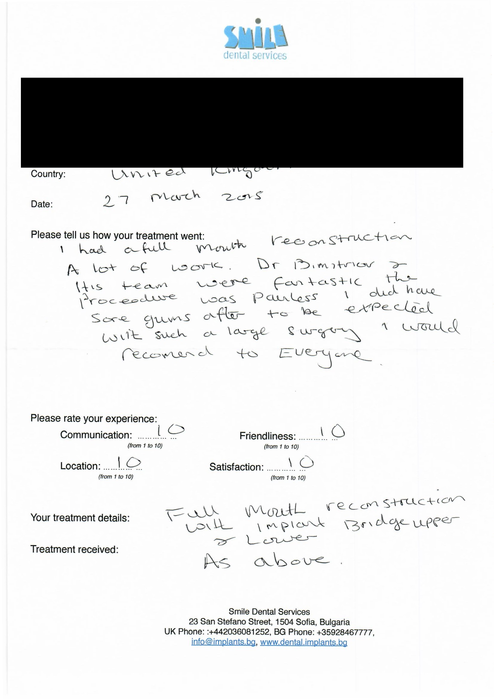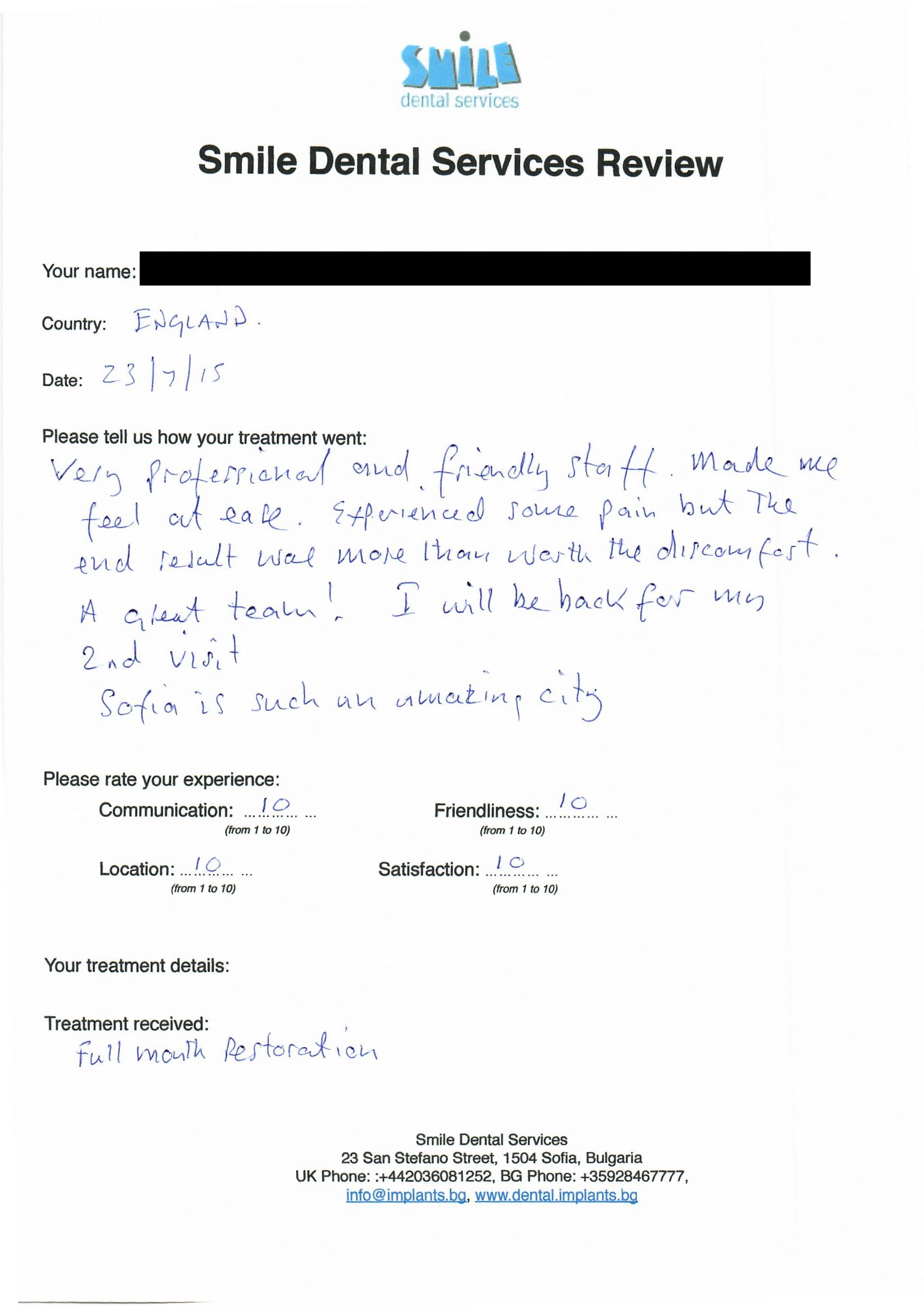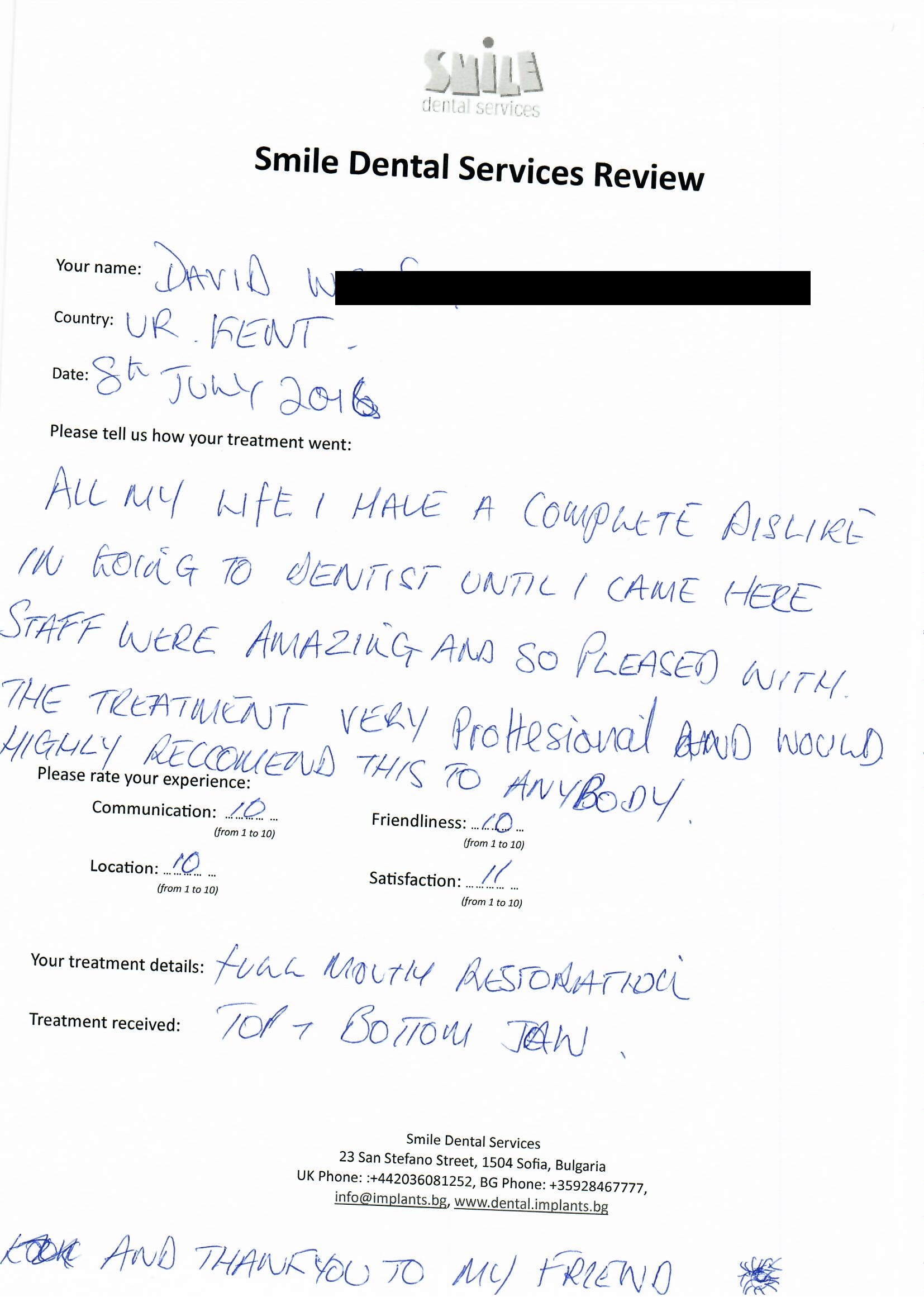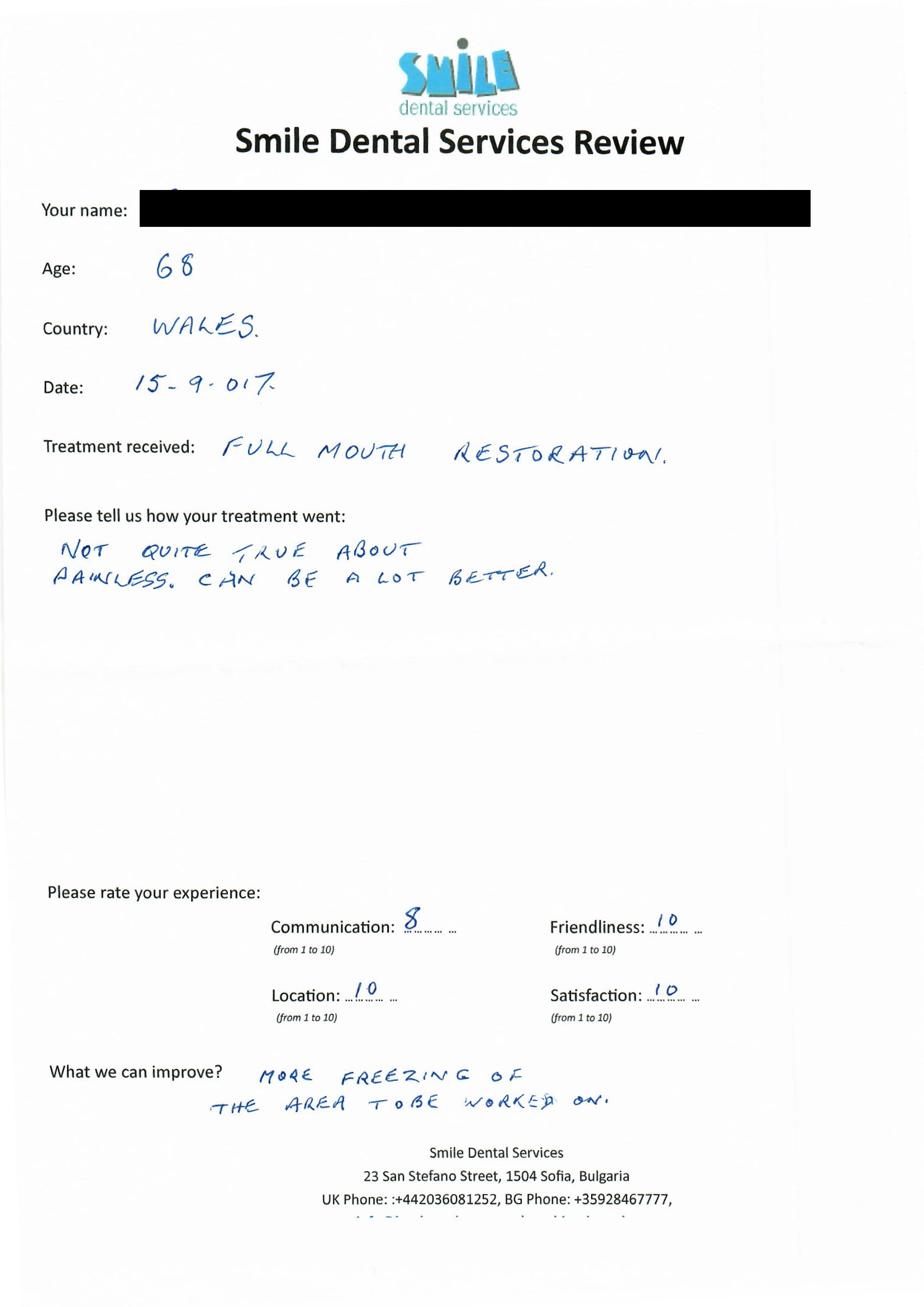 From booking my treatment till now the whole experience has been great. I suffered with poor teeth since I was a kid, dentists in the UK didn't offer much help or trust. Loads of people asked my why I was going to Bulgaria for treatment, I guess the result and the smooth handling of my case by yourself and your team are why. Are there things you could improve, yes.