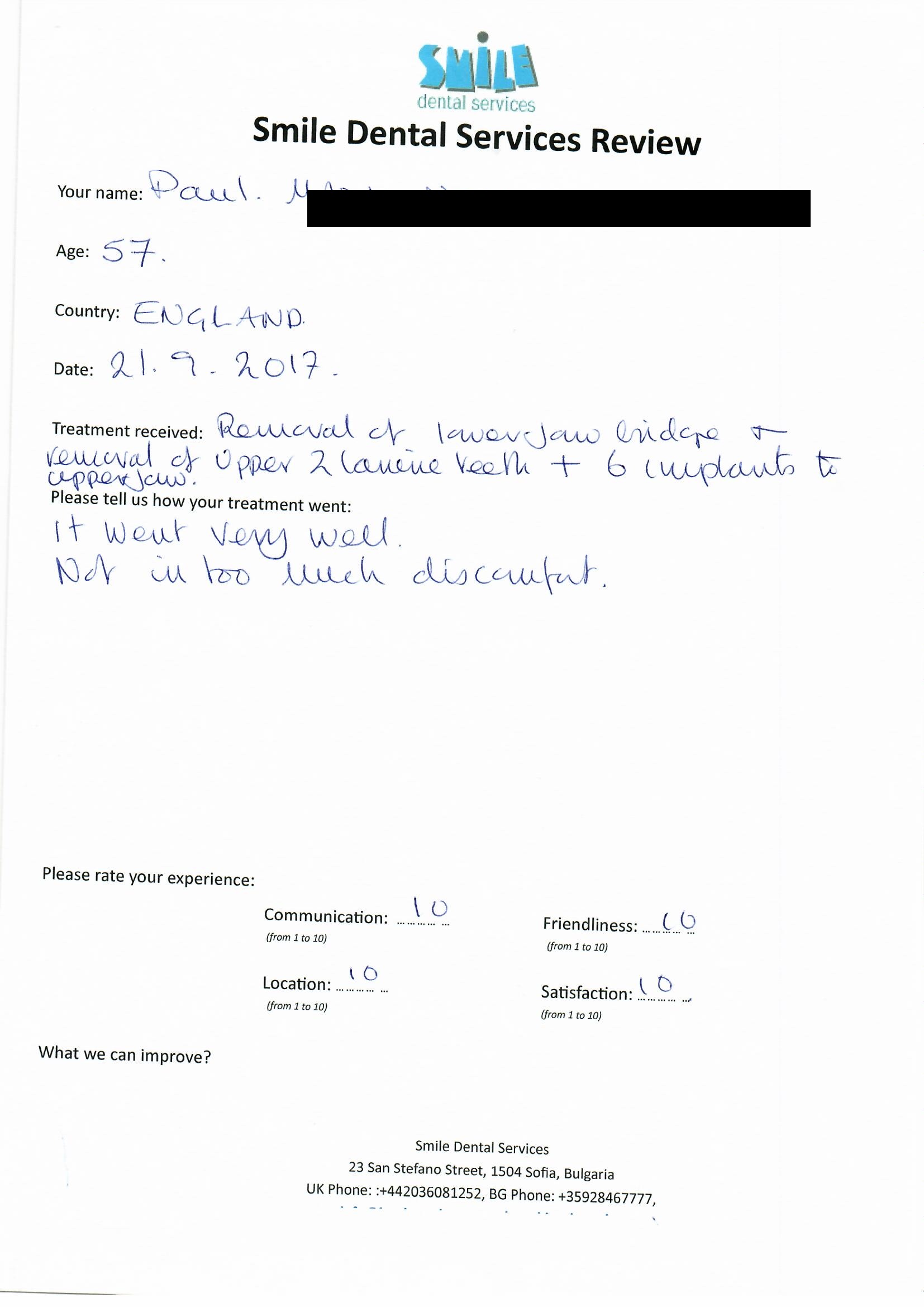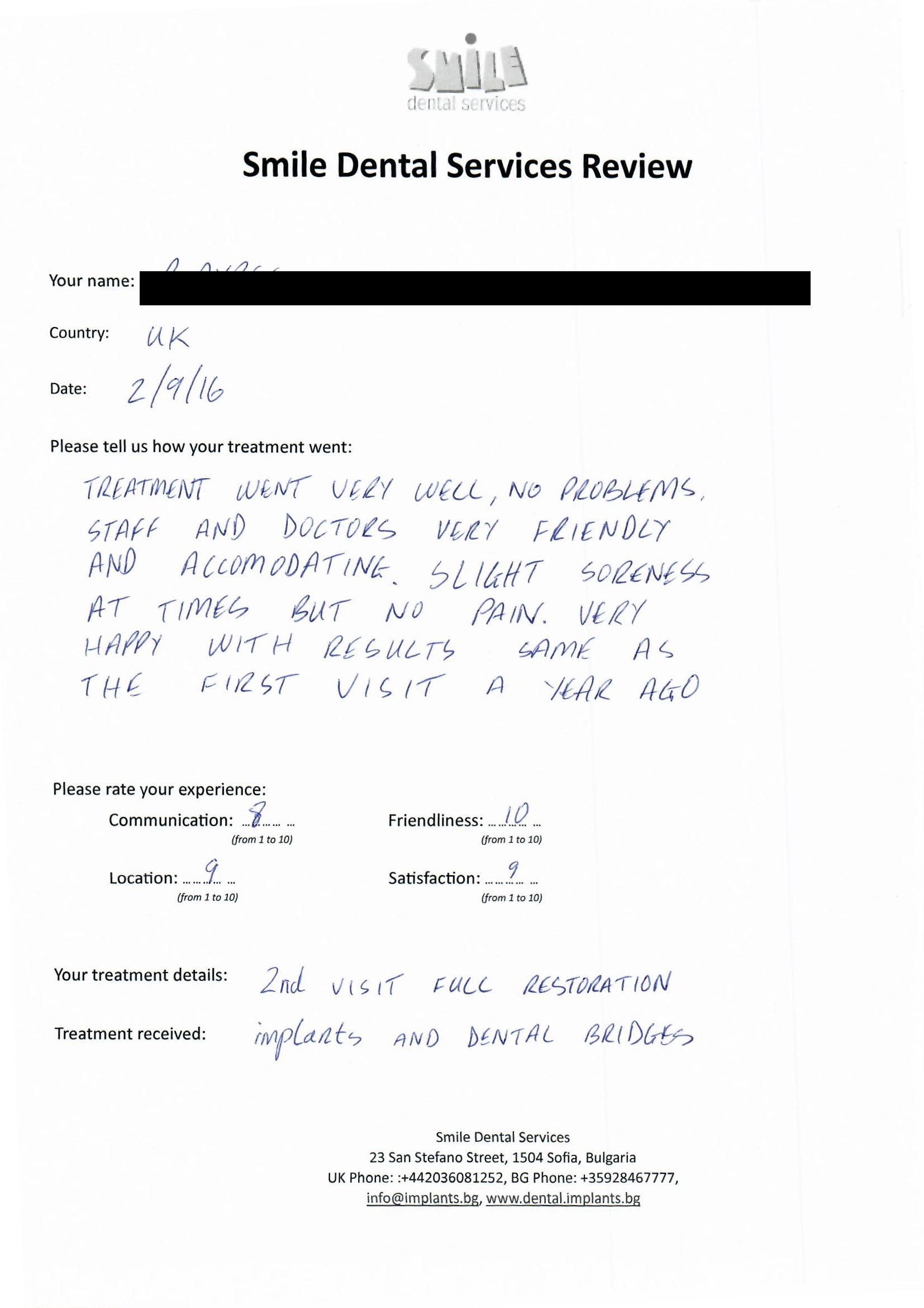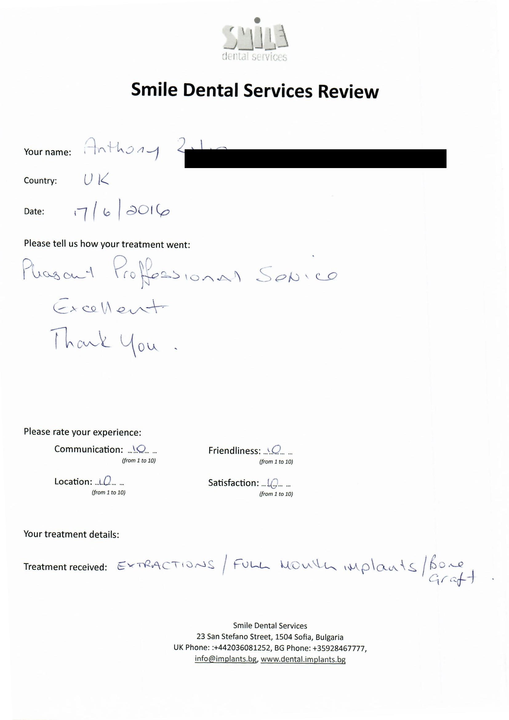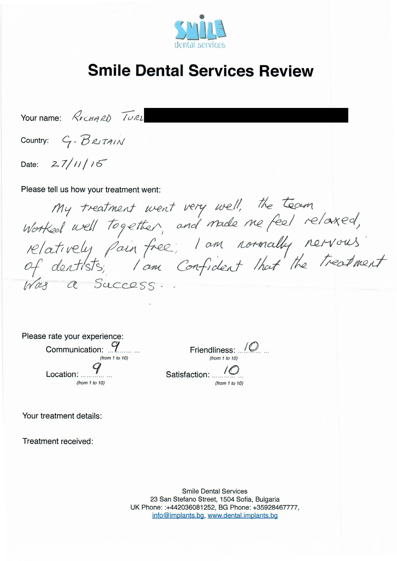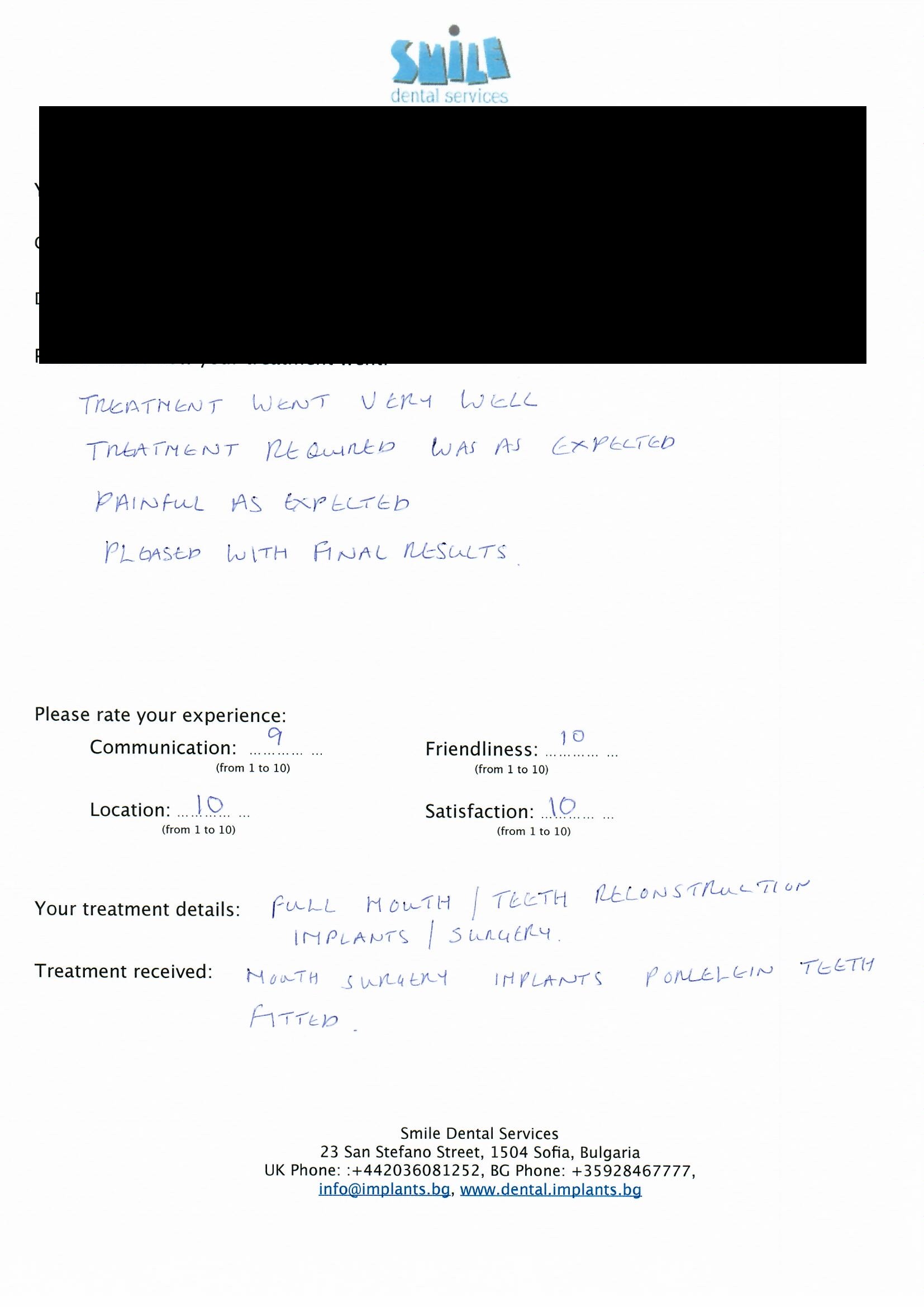 From booking my treatment till now the whole experience has been great. I suffered with poor teeth since I was a kid, dentists in the UK didn't offer much help or trust. Loads of people asked my why I was going to Bulgaria for treatment, I guess the result and the smooth handling of my case by yourself and your team are why. Are there things you could improve, yes.