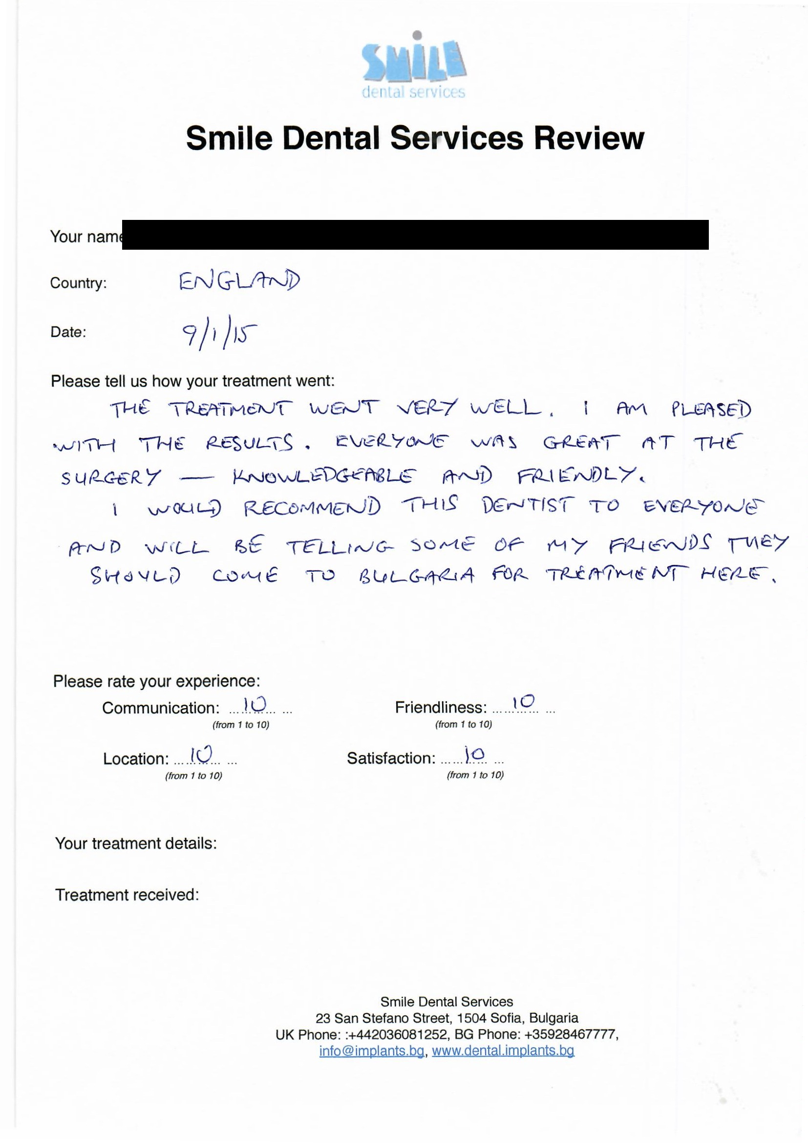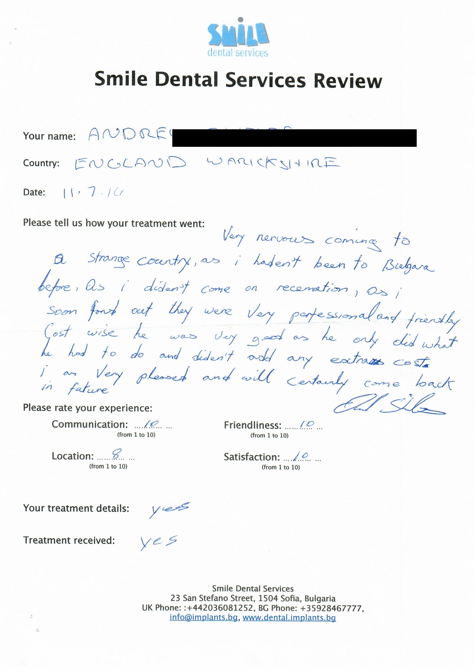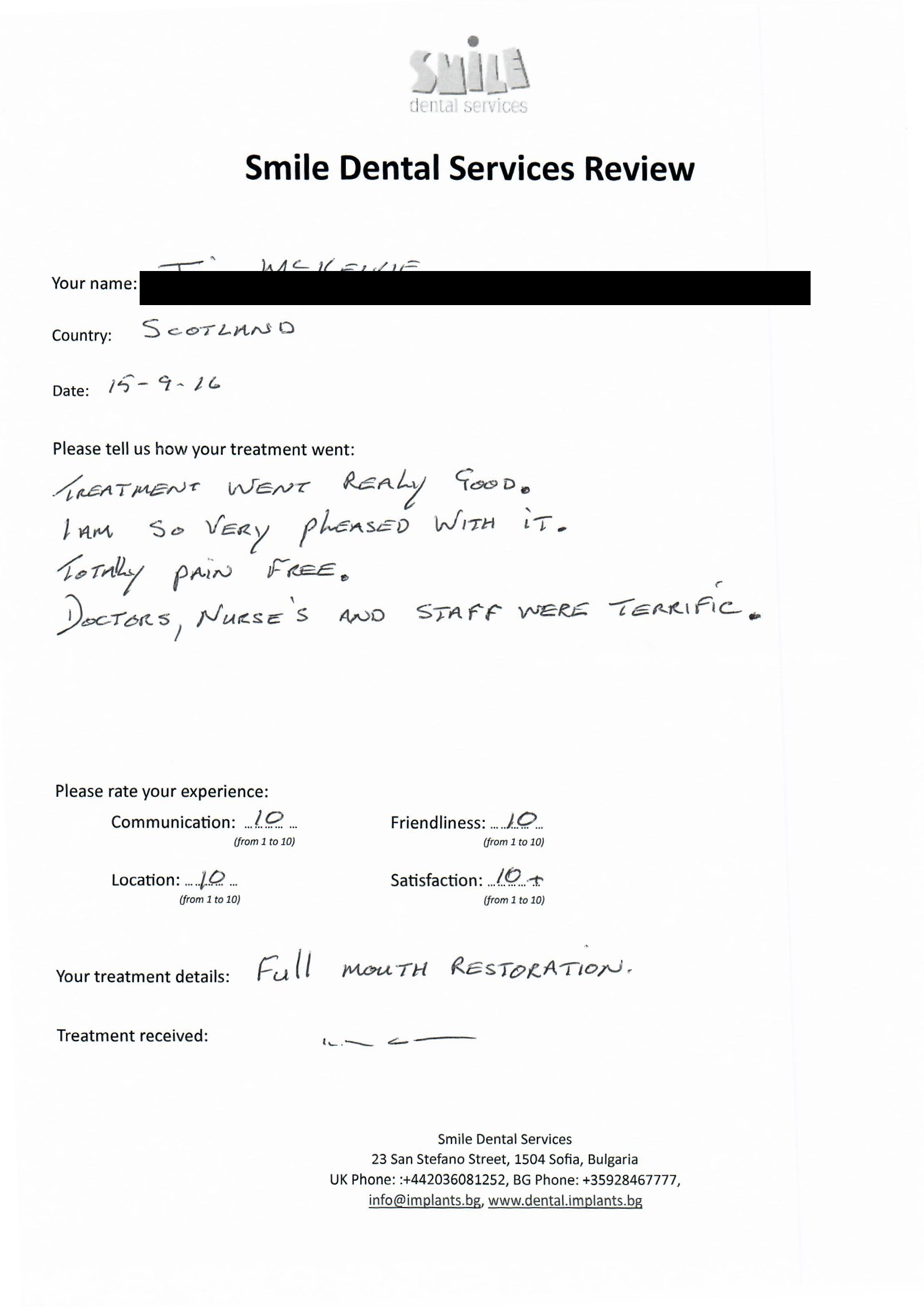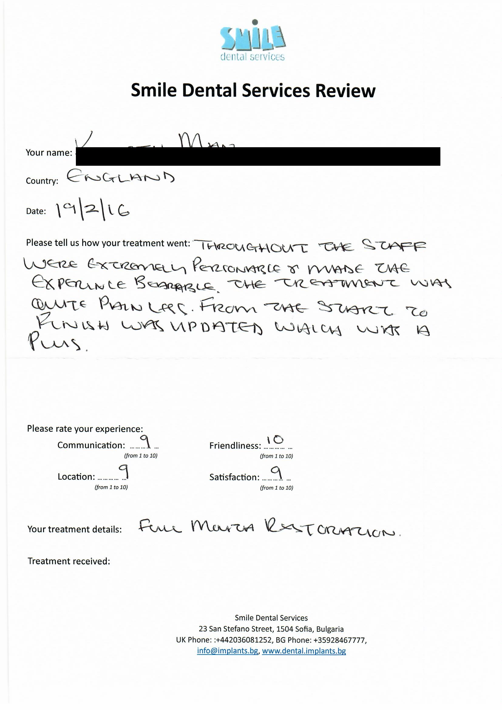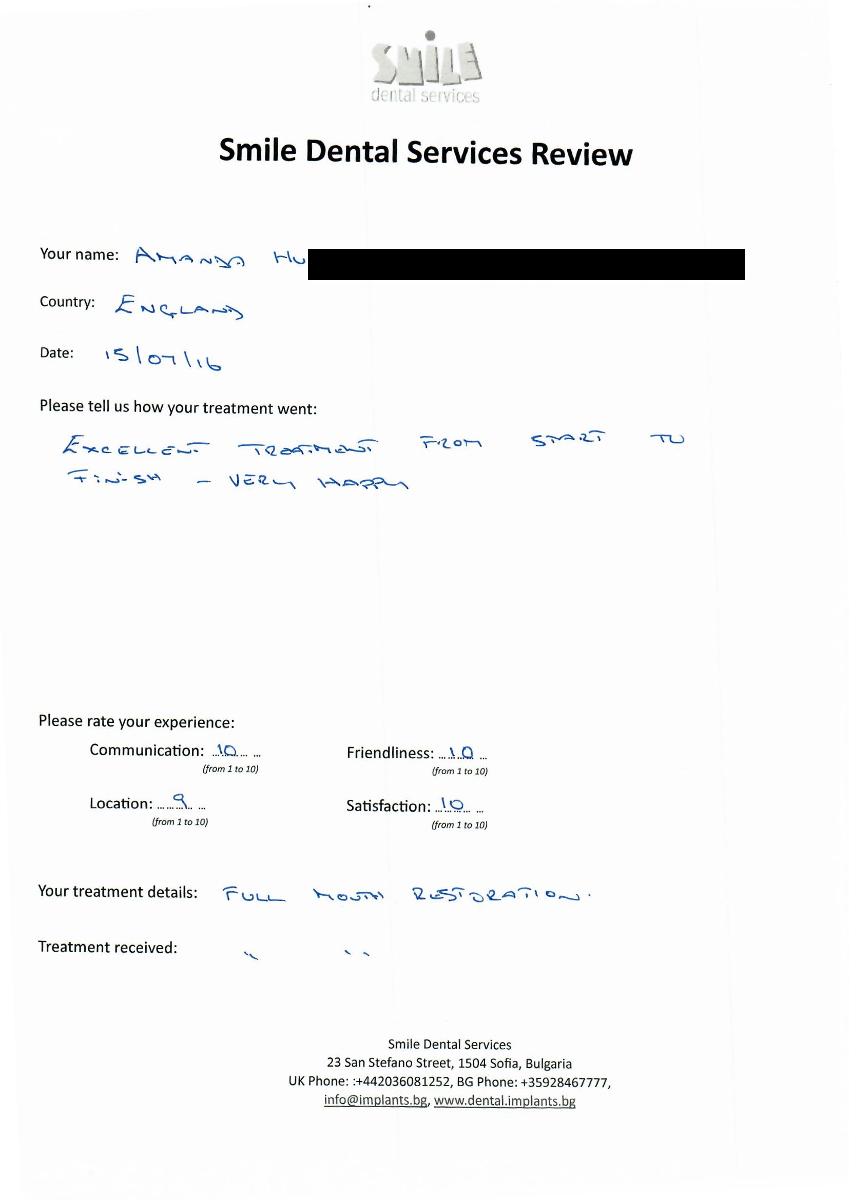 From booking my treatment till now the whole experience has been great. I suffered with poor teeth since I was a kid, dentists in the UK didn't offer much help or trust. Loads of people asked my why I was going to Bulgaria for treatment, I guess the result and the smooth handling of my case by yourself and your team are why. Are there things you could improve, yes.