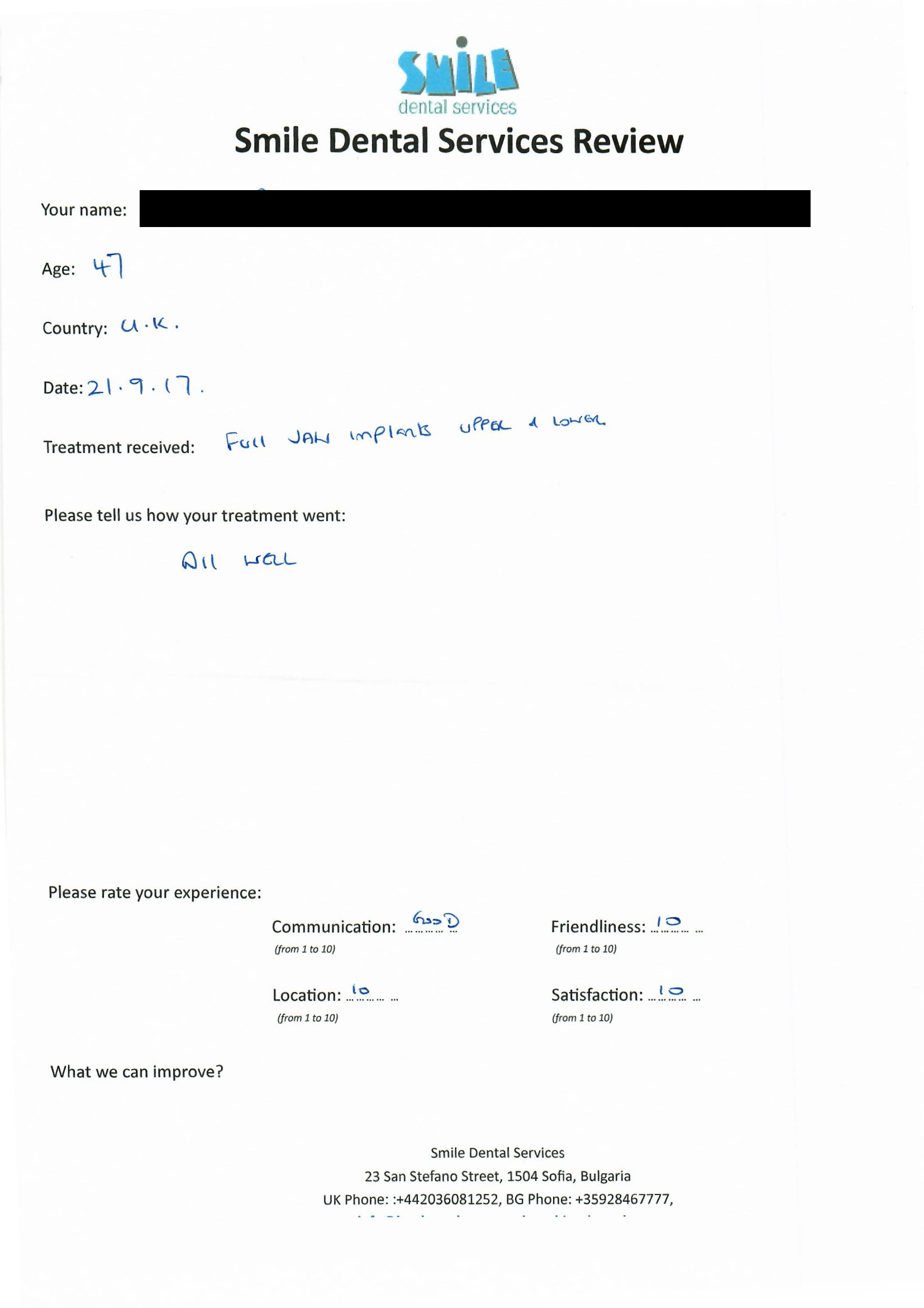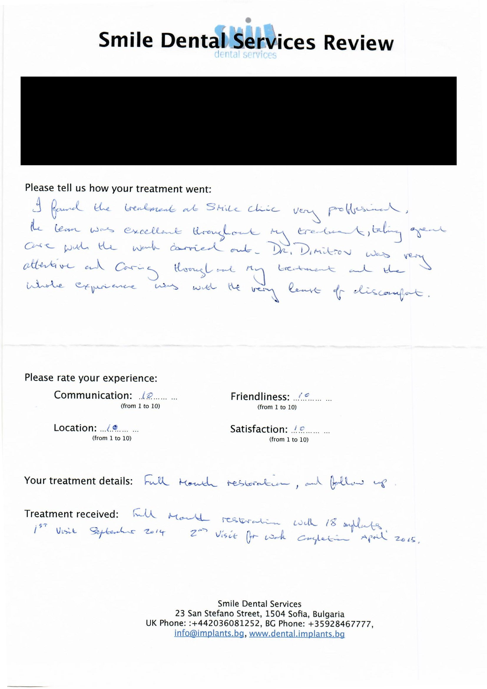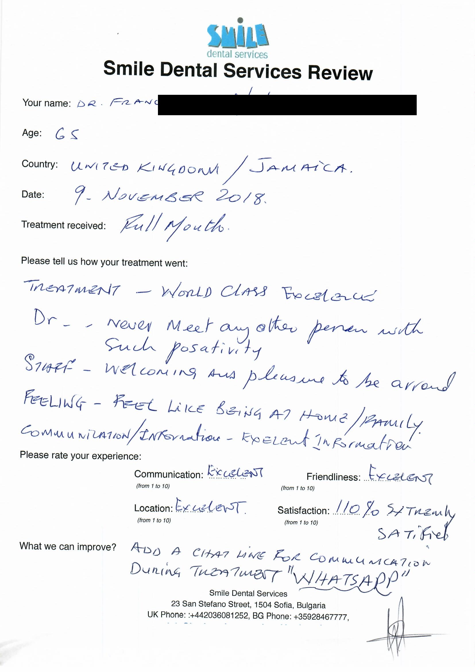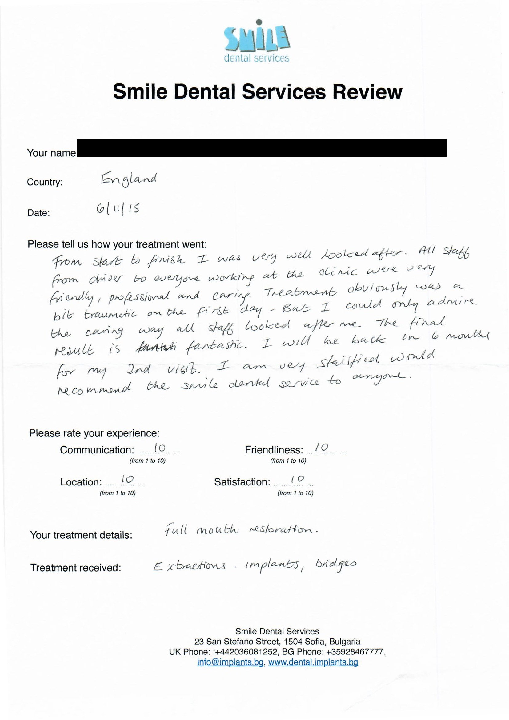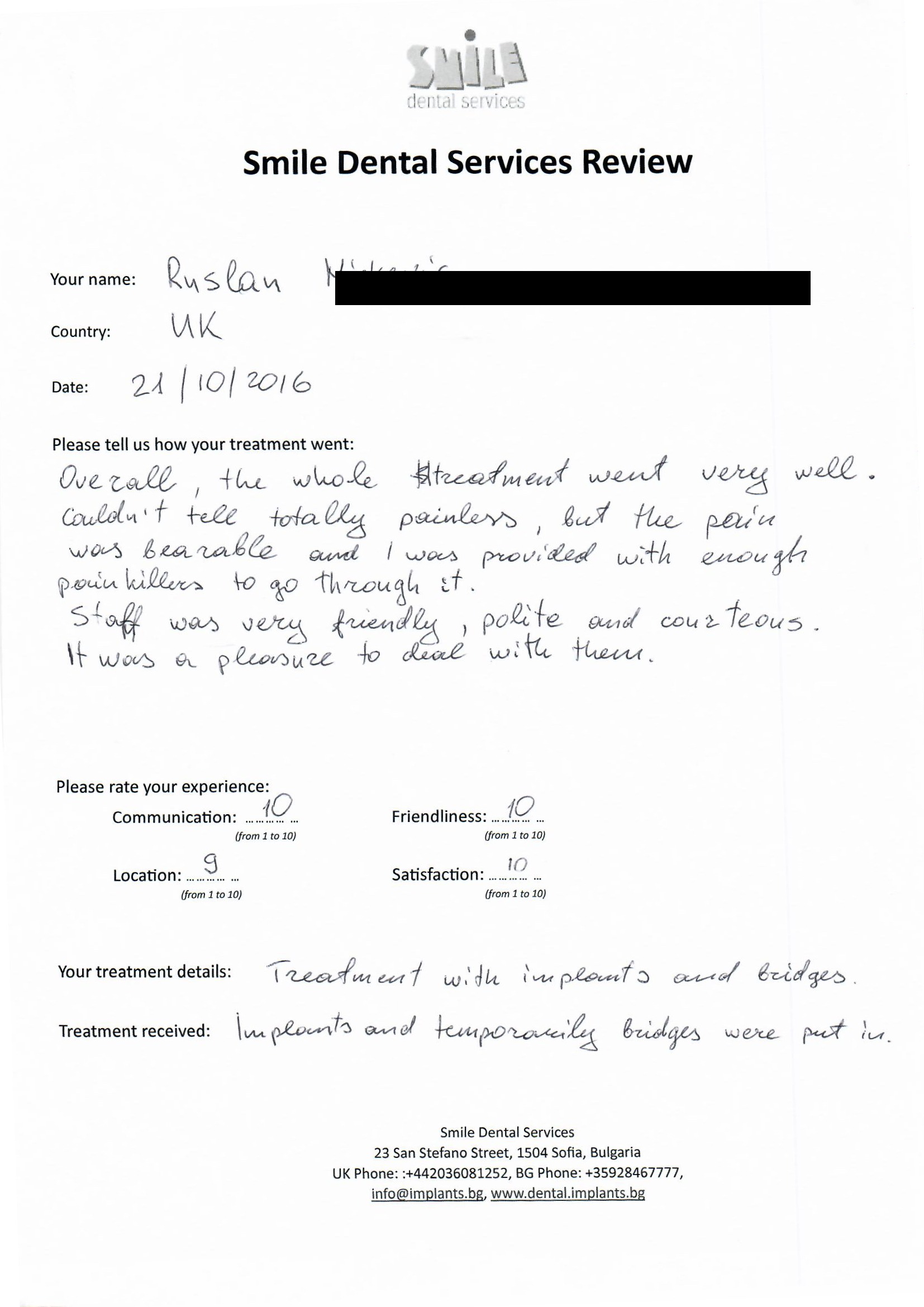 From booking my treatment till now the whole experience has been great. I suffered with poor teeth since I was a kid, dentists in the UK didn't offer much help or trust. Loads of people asked my why I was going to Bulgaria for treatment, I guess the result and the smooth handling of my case by yourself and your team are why. Are there things you could improve, yes.