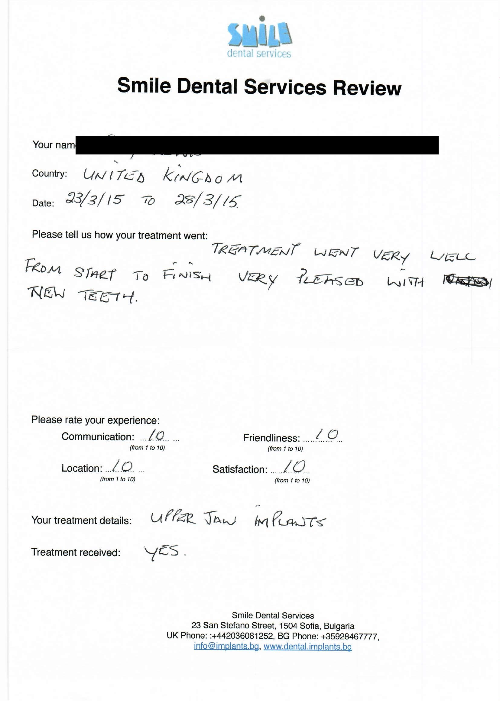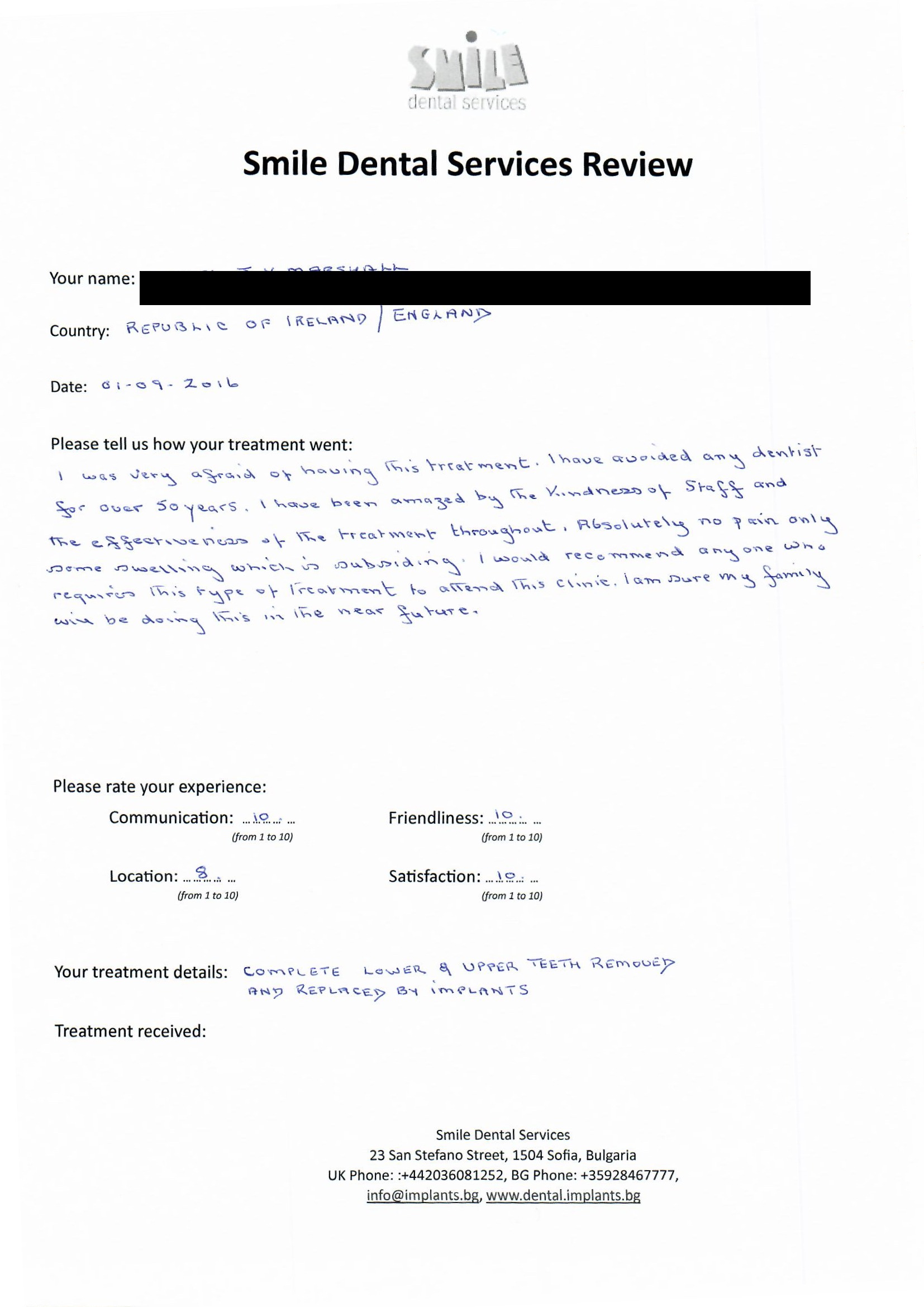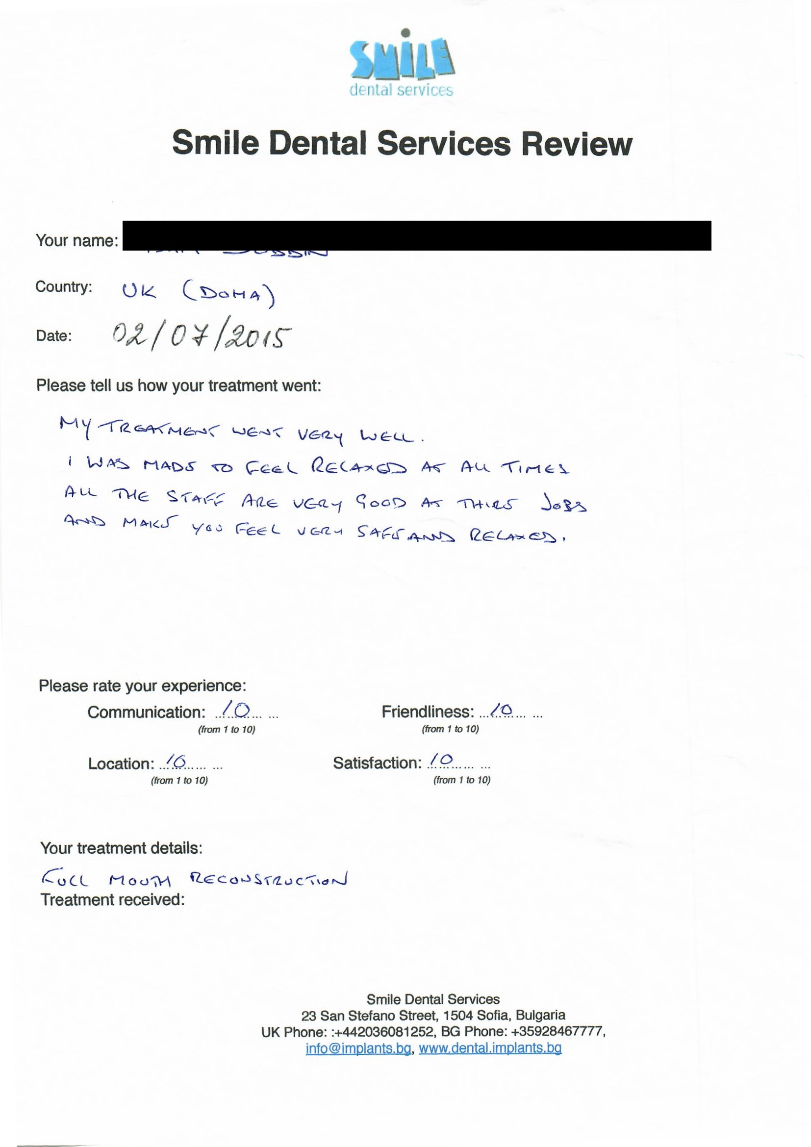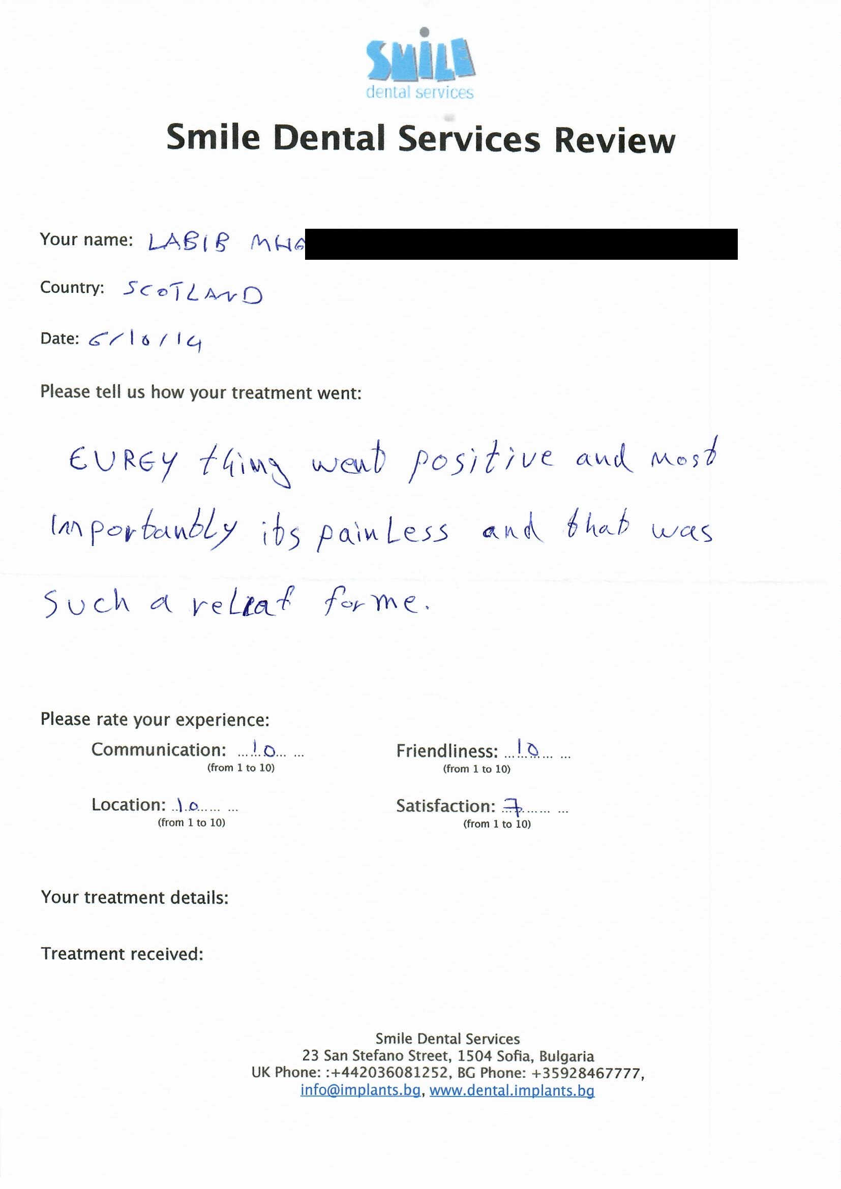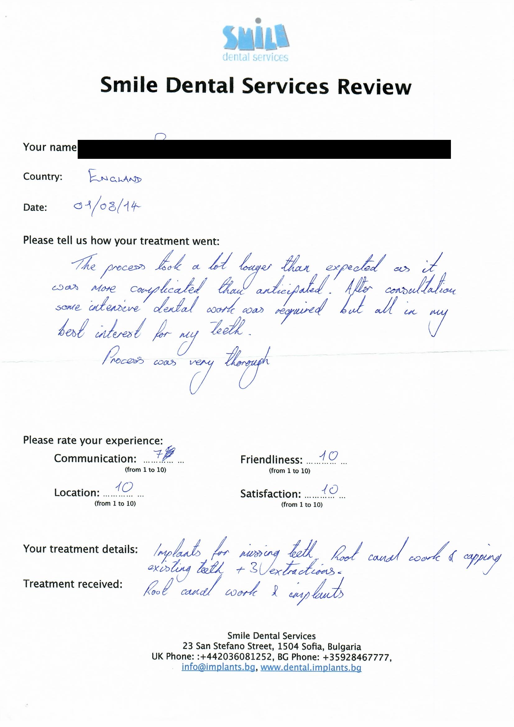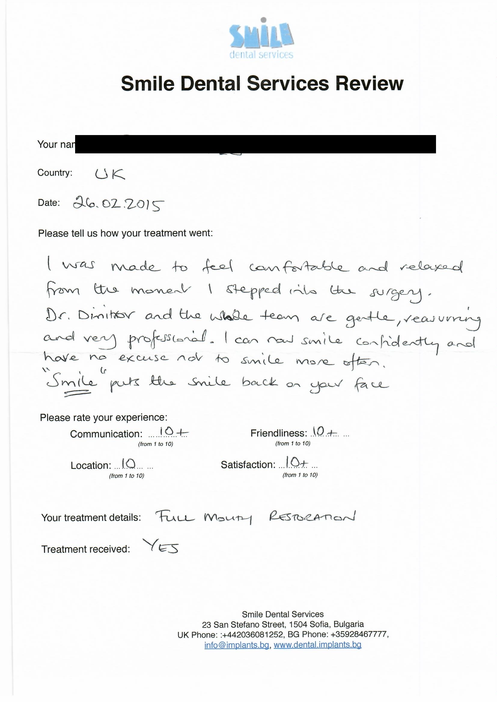 From booking my treatment till now the whole experience has been great. I suffered with poor teeth since I was a kid, dentists in the UK didn't offer much help or trust. Loads of people asked my why I was going to Bulgaria for treatment, I guess the result and the smooth handling of my case by yourself and your team are why. Are there things you could improve, yes.
