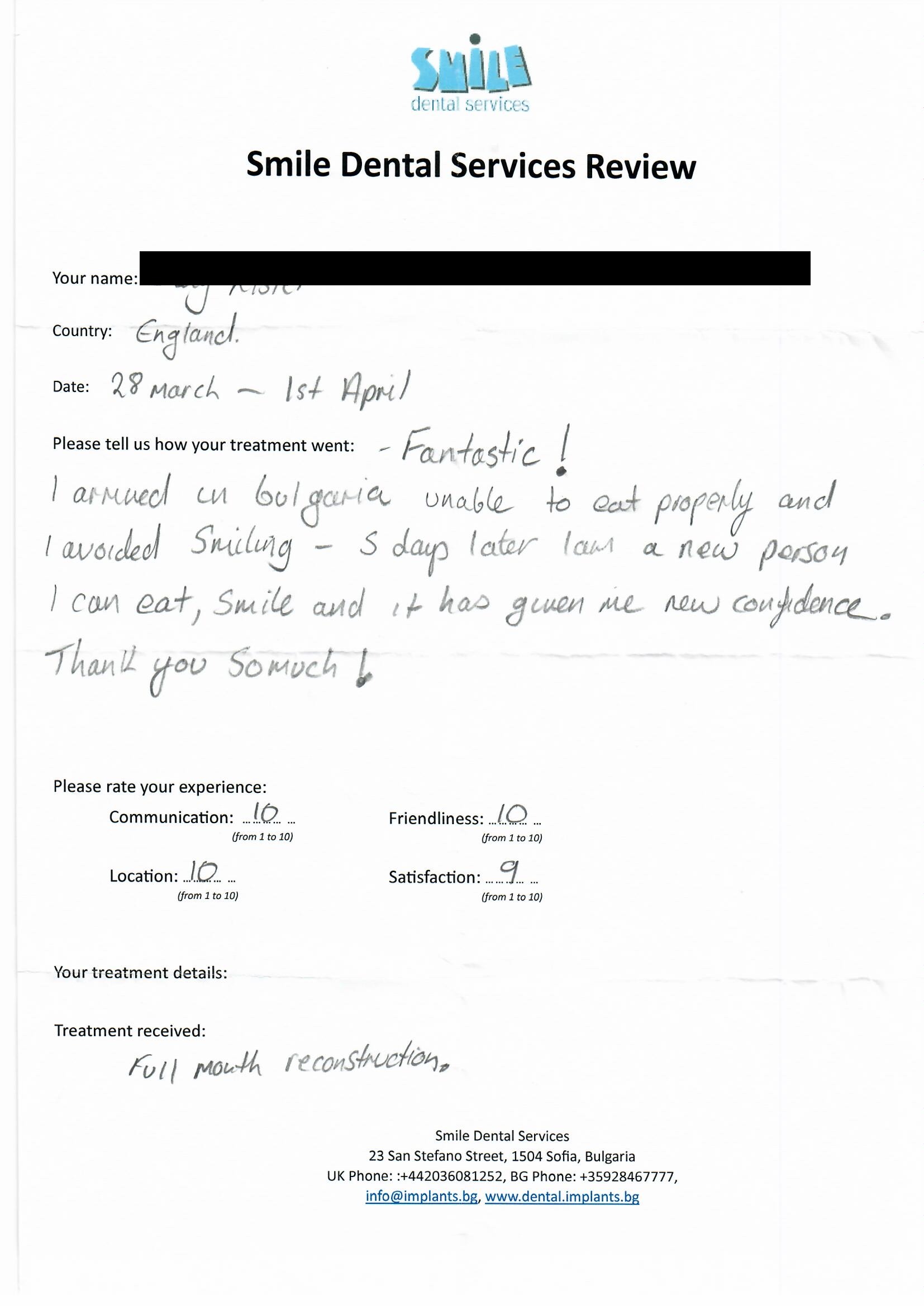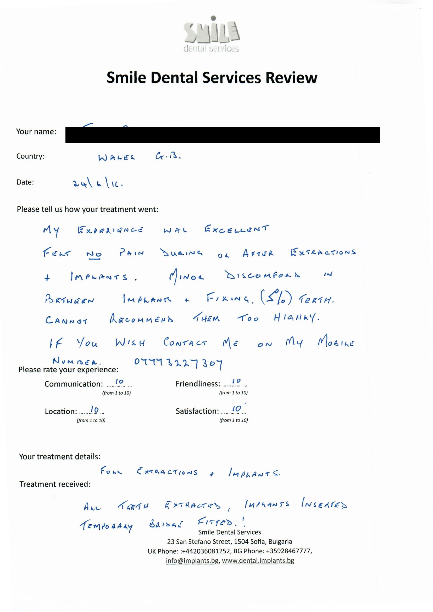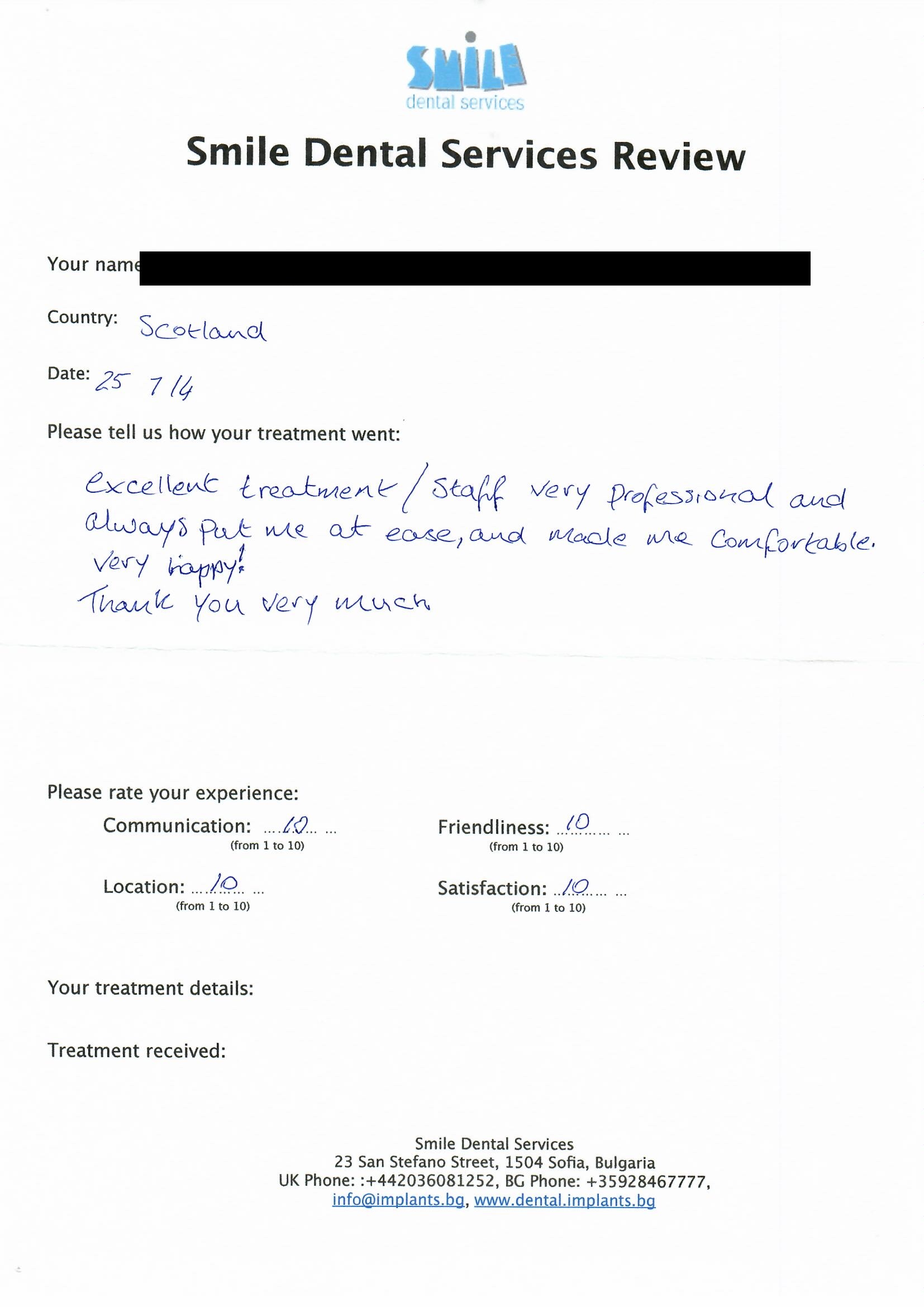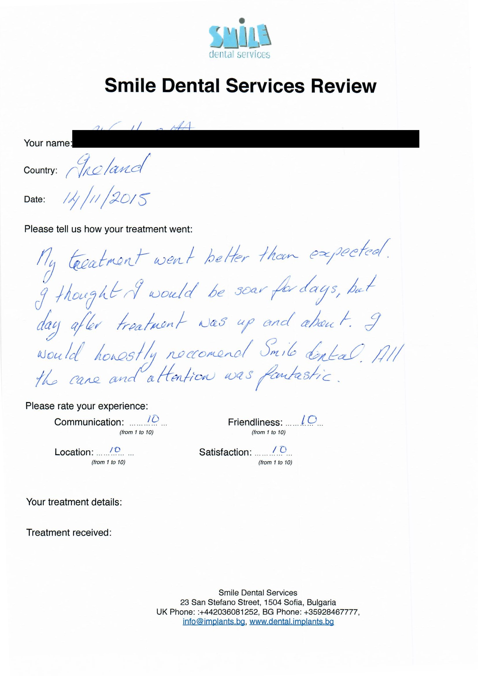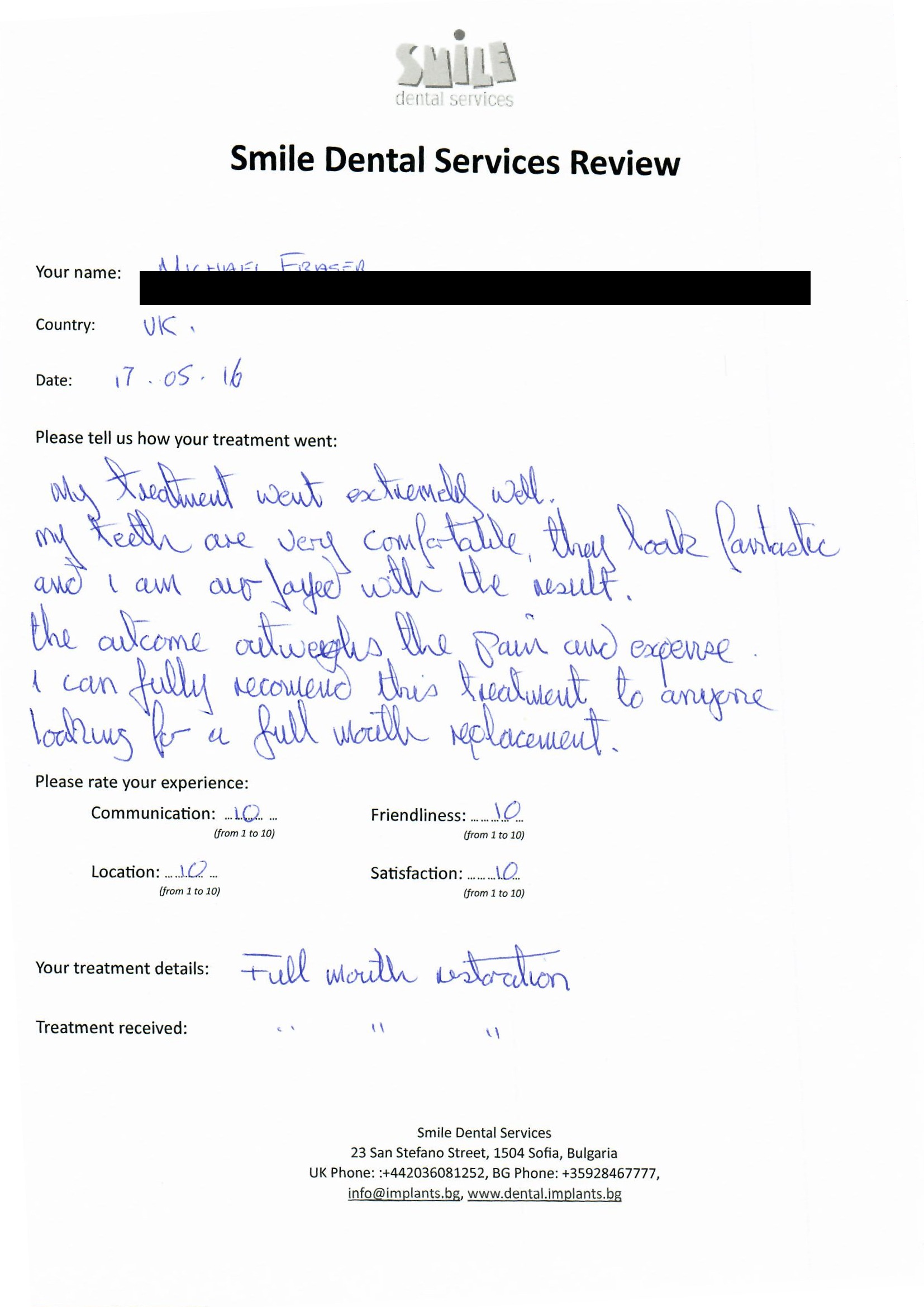 From booking my treatment till now the whole experience has been great. I suffered with poor teeth since I was a kid, dentists in the UK didn't offer much help or trust. Loads of people asked my why I was going to Bulgaria for treatment, I guess the result and the smooth handling of my case by yourself and your team are why. Are there things you could improve, yes.