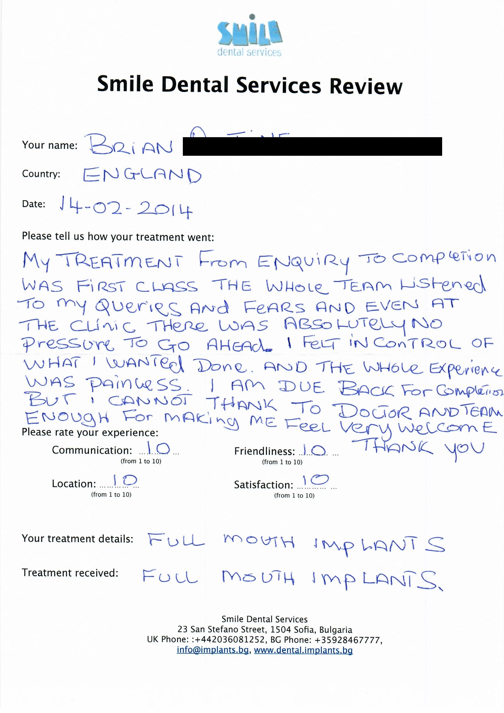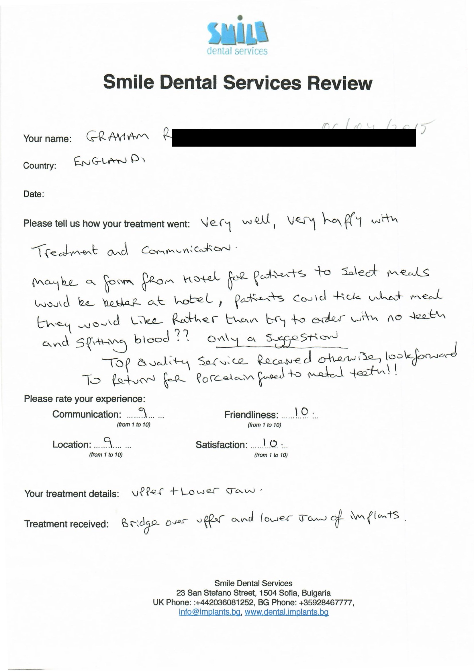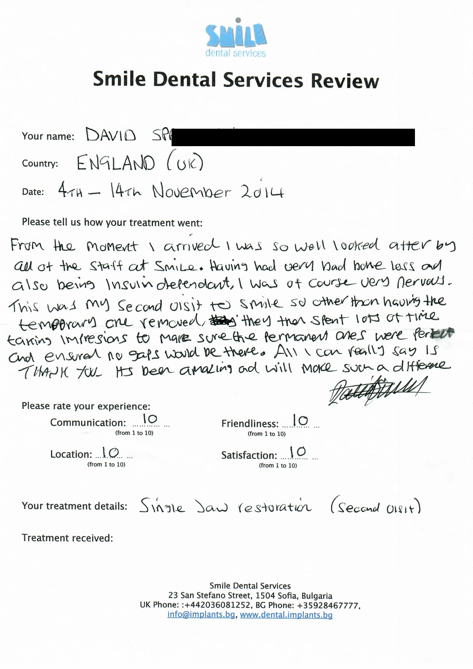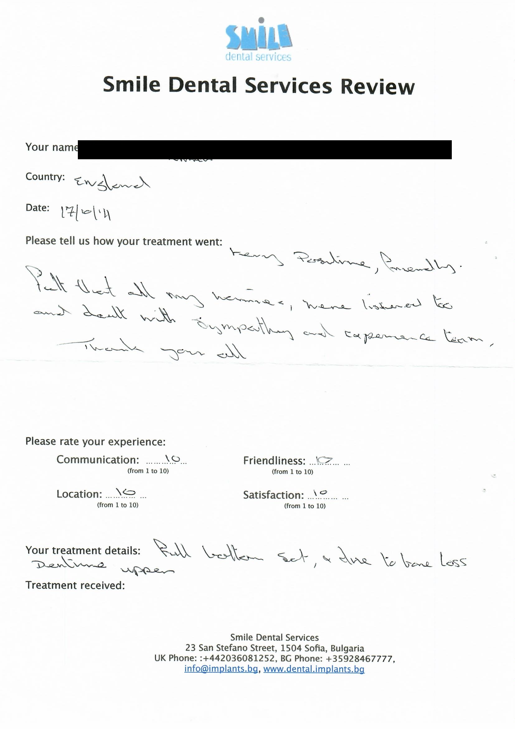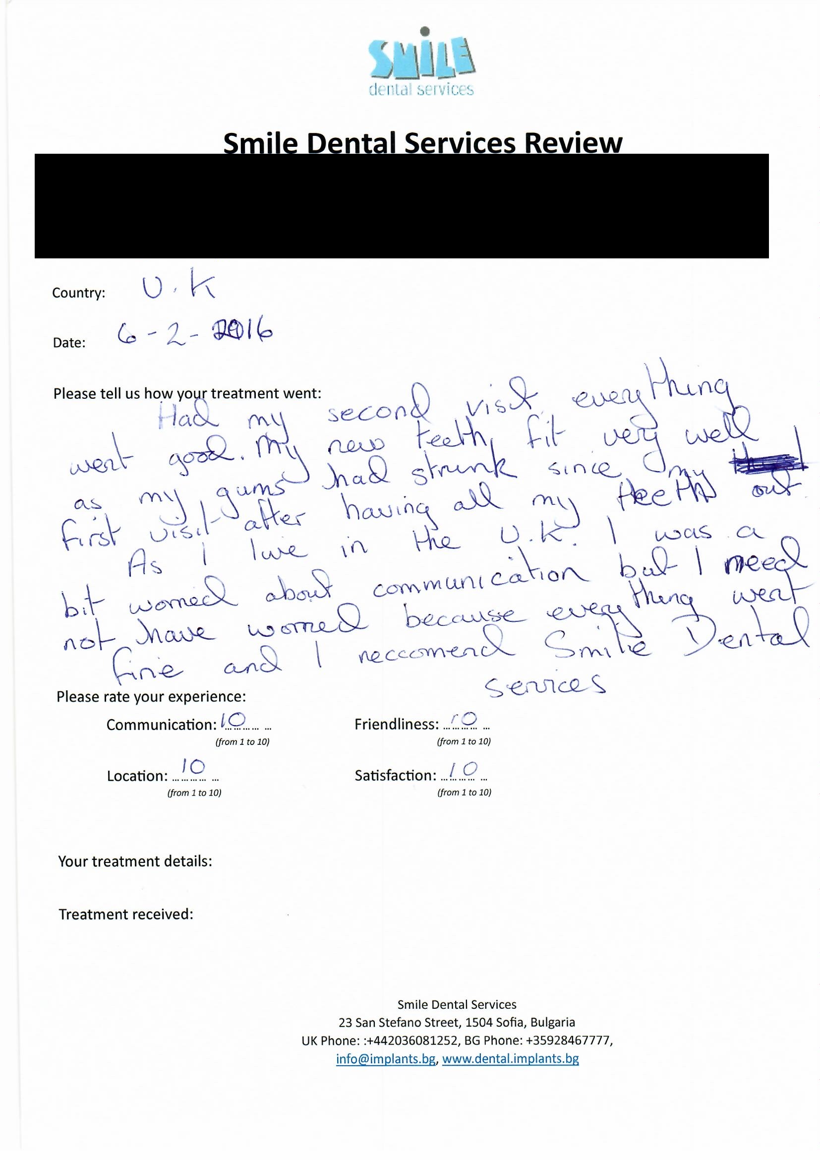 From booking my treatment till now the whole experience has been great. I suffered with poor teeth since I was a kid, dentists in the UK didn't offer much help or trust. Loads of people asked my why I was going to Bulgaria for treatment, I guess the result and the smooth handling of my case by yourself and your team are why. Are there things you could improve, yes.