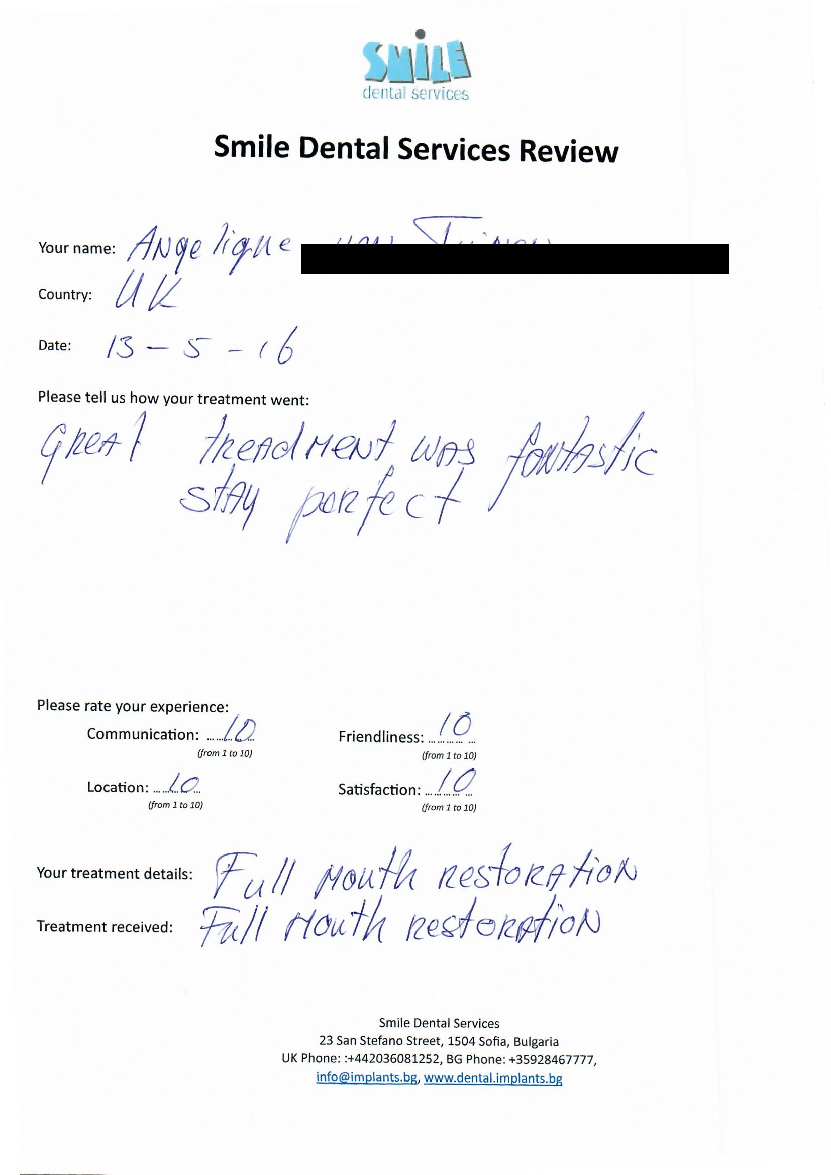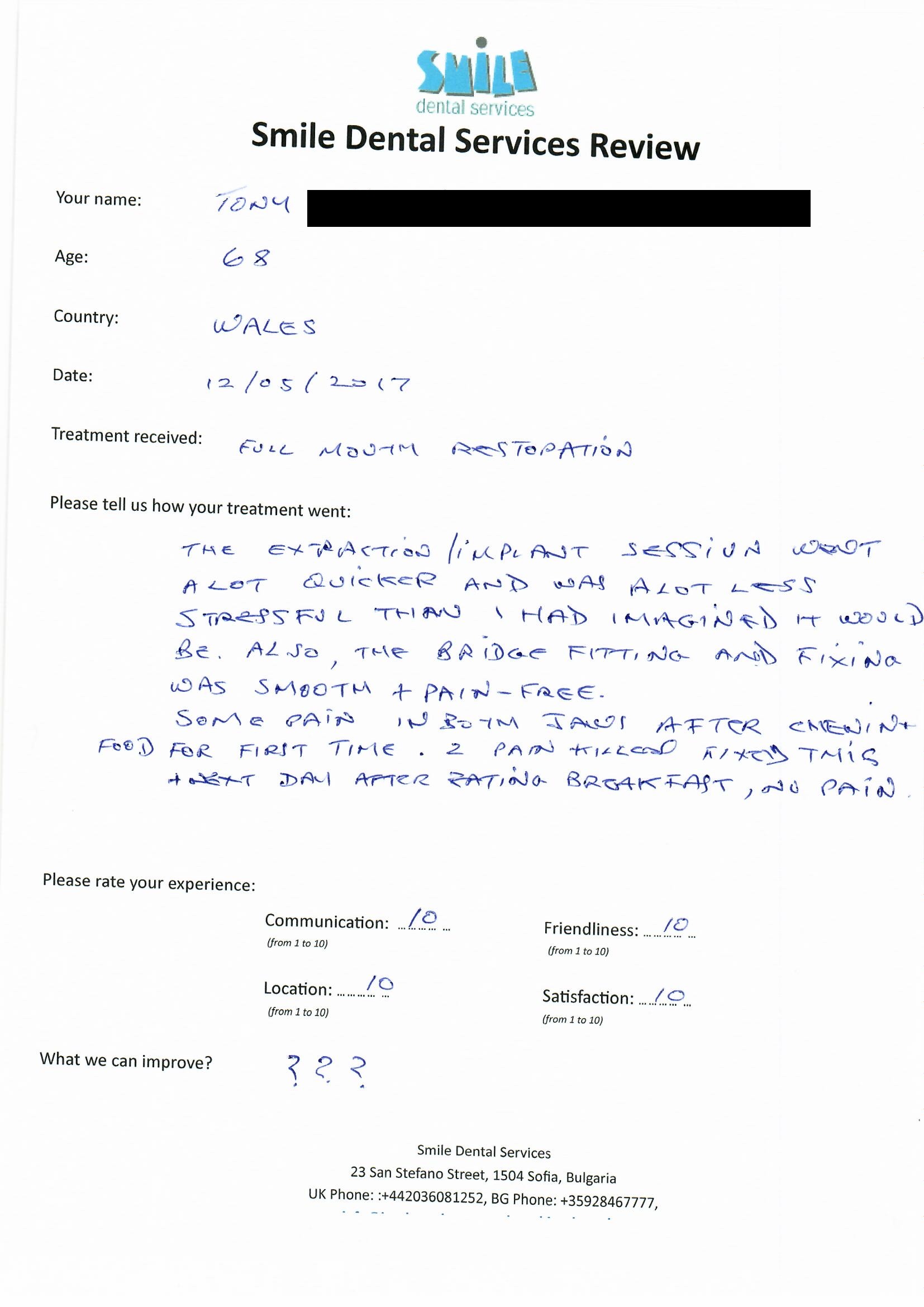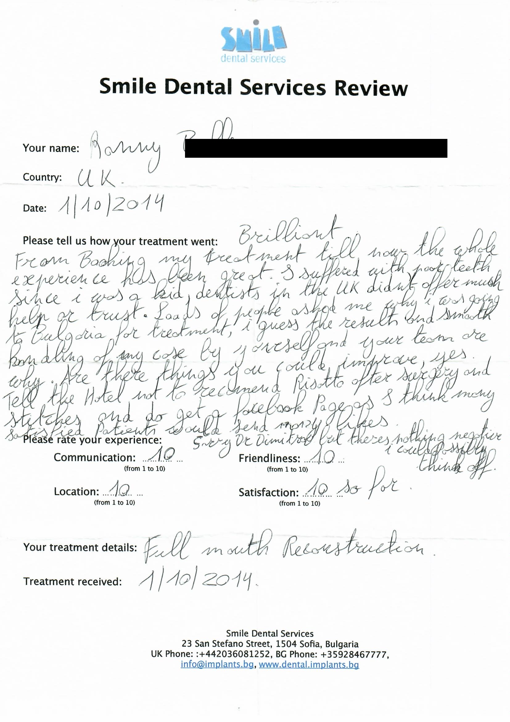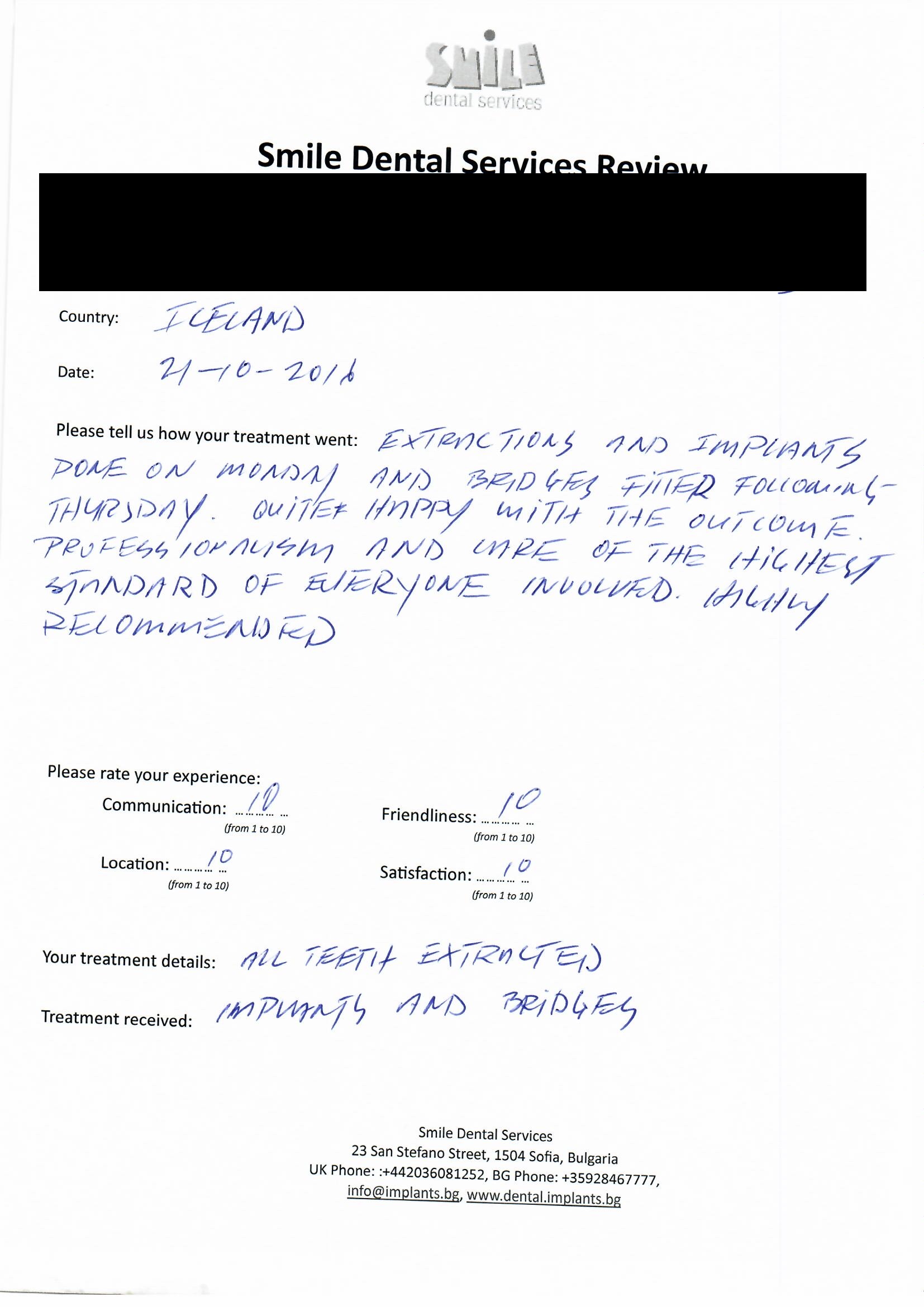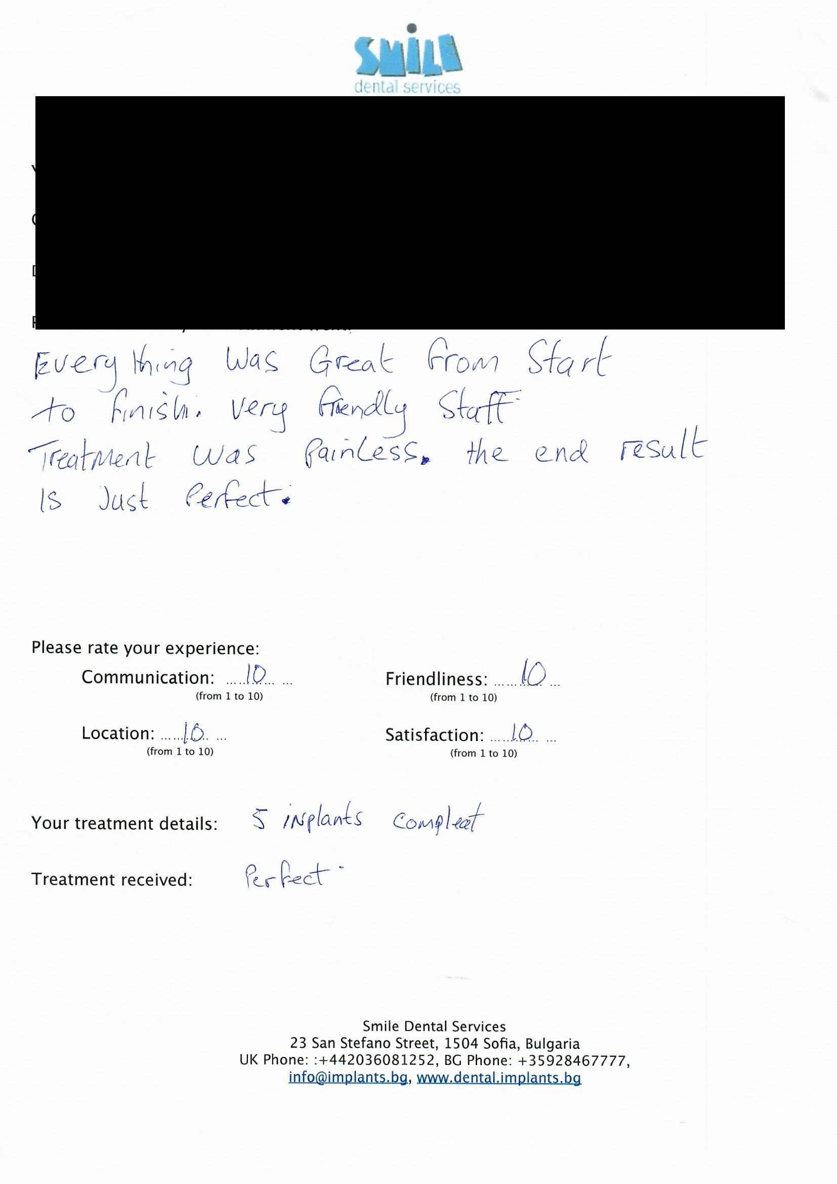 From booking my treatment till now the whole experience has been great. I suffered with poor teeth since I was a kid, dentists in the UK didn't offer much help or trust. Loads of people asked my why I was going to Bulgaria for treatment, I guess the result and the smooth handling of my case by yourself and your team are why. Are there things you could improve, yes.
