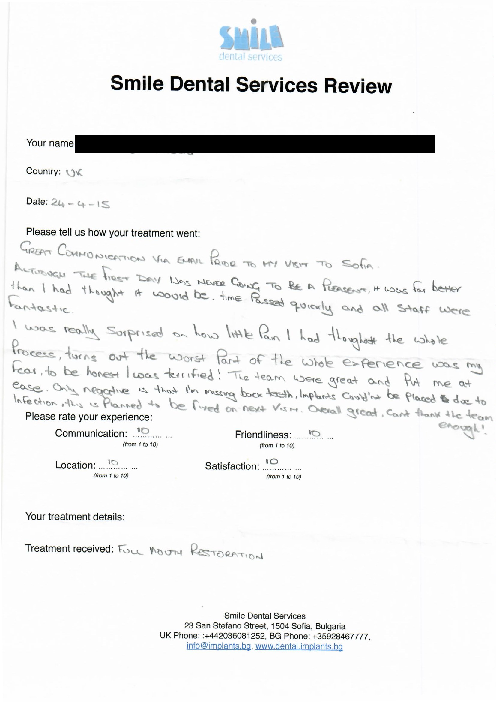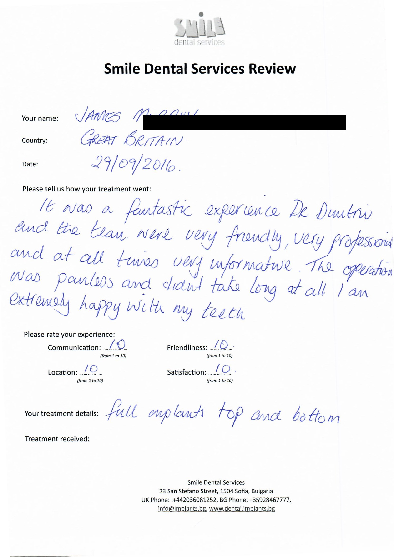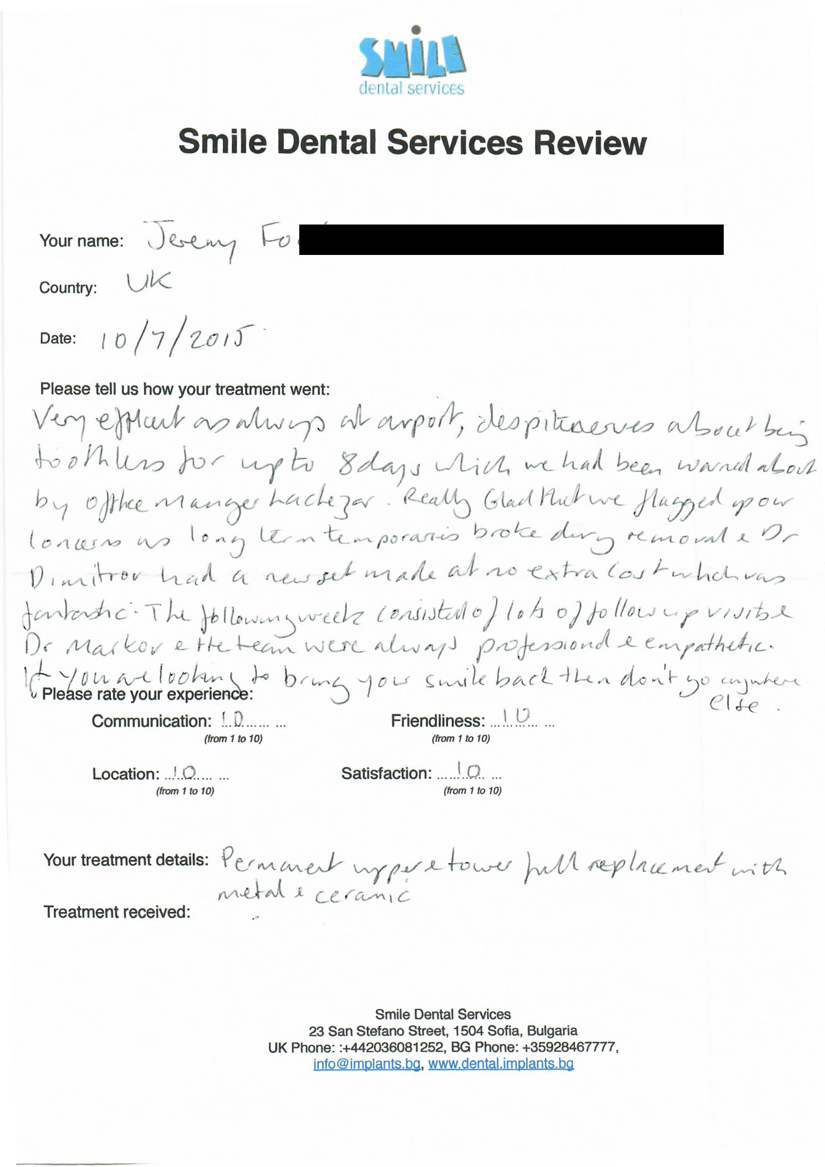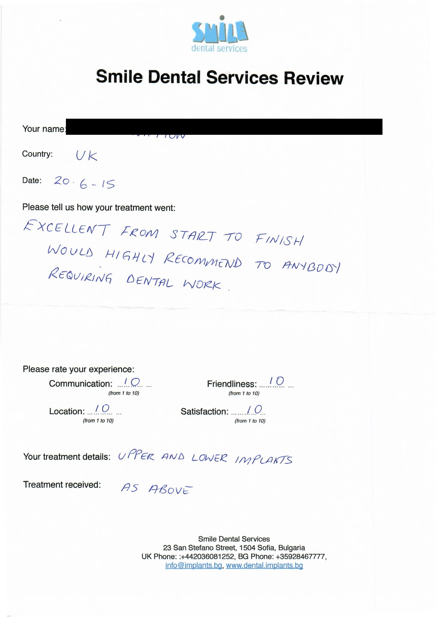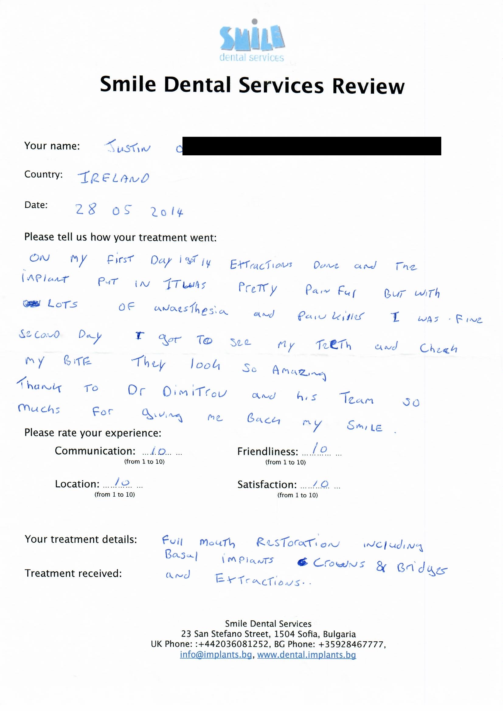 From booking my treatment till now the whole experience has been great. I suffered with poor teeth since I was a kid, dentists in the UK didn't offer much help or trust. Loads of people asked my why I was going to Bulgaria for treatment, I guess the result and the smooth handling of my case by yourself and your team are why. Are there things you could improve, yes.