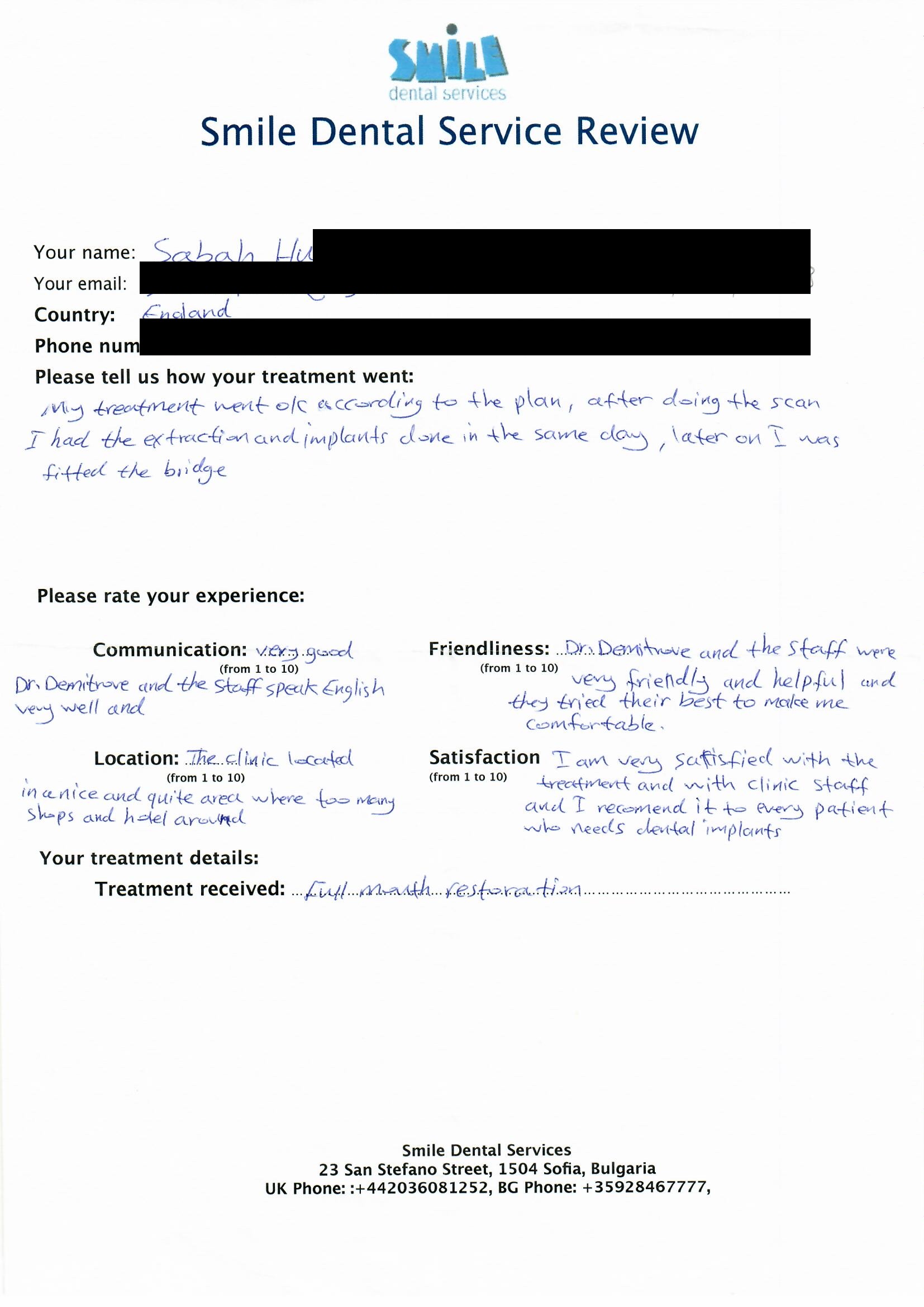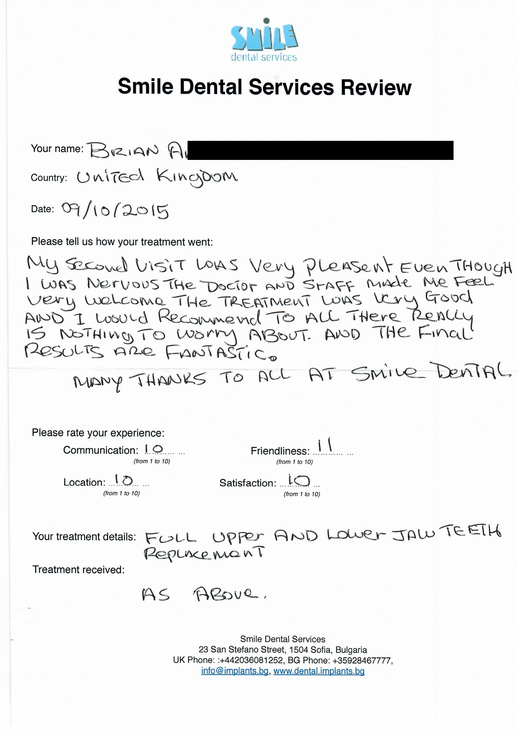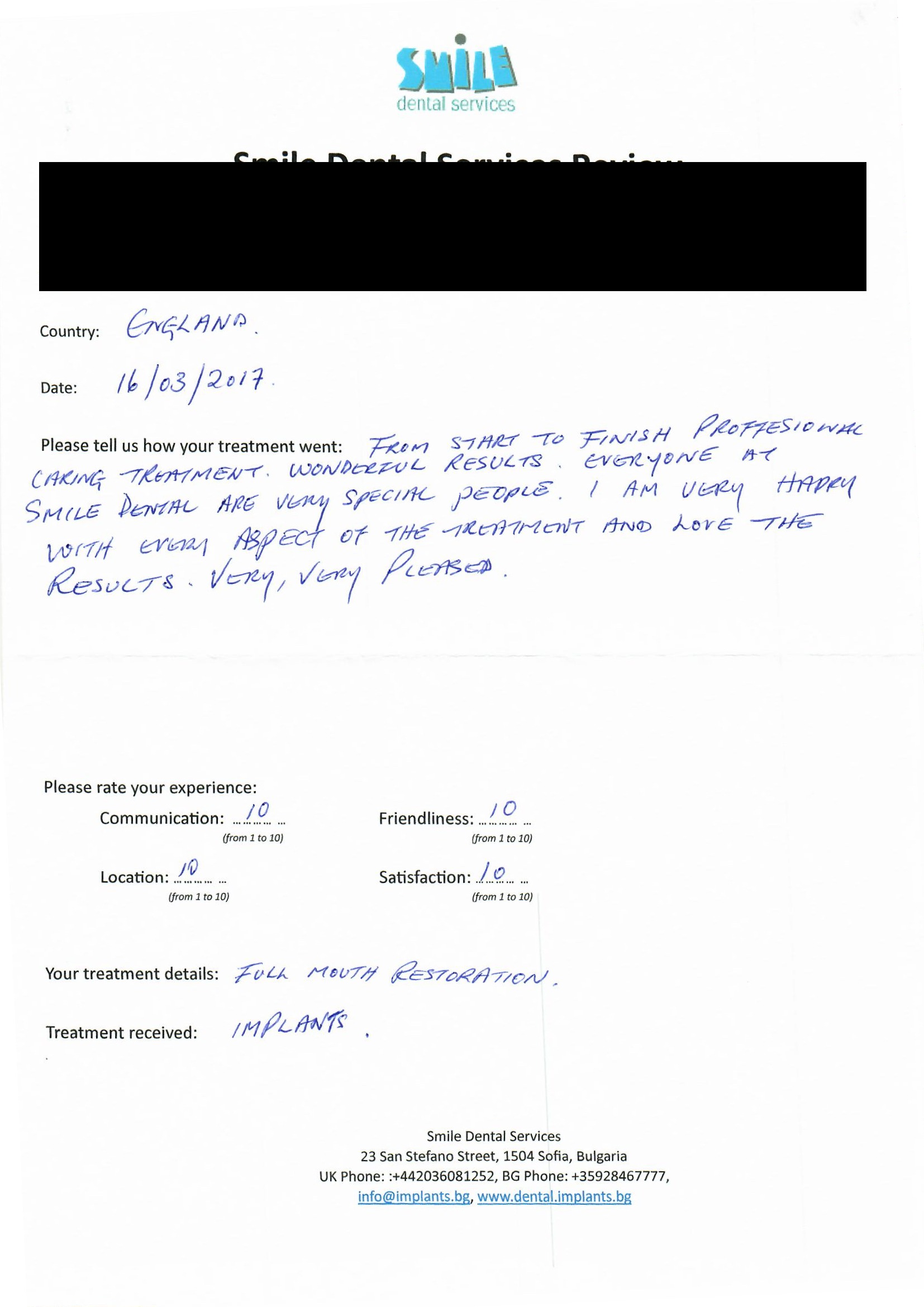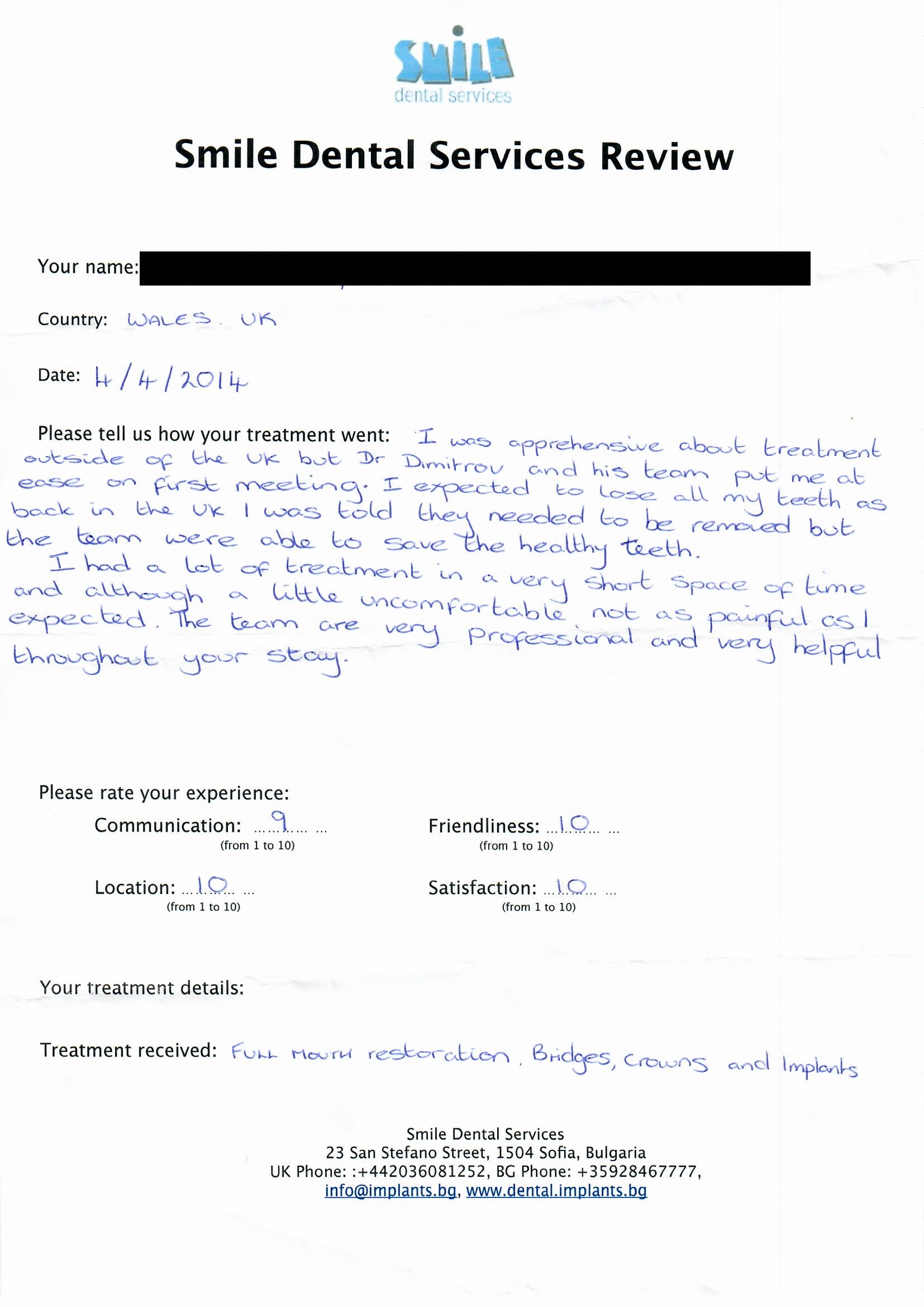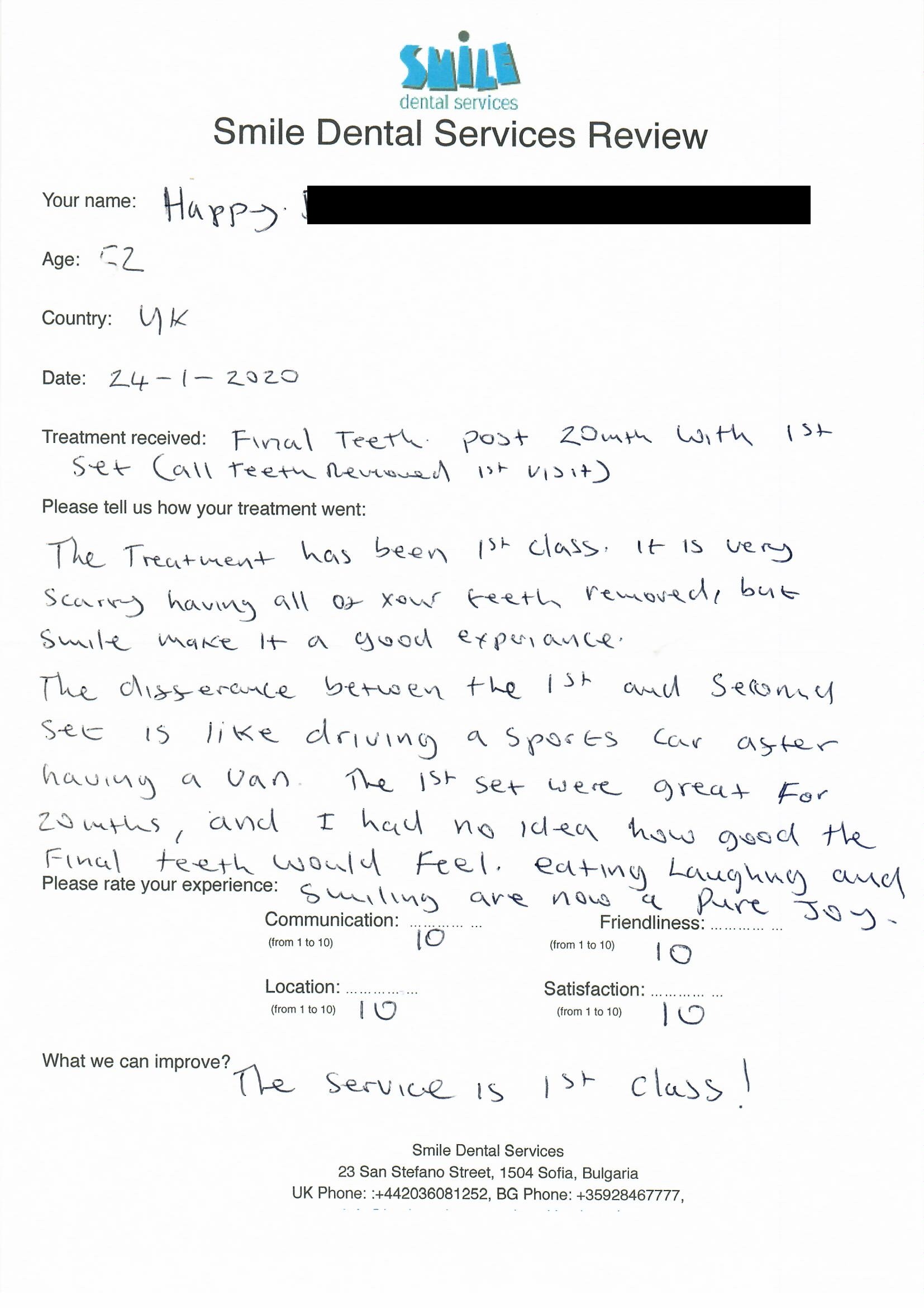 From booking my treatment till now the whole experience has been great. I suffered with poor teeth since I was a kid, dentists in the UK didn't offer much help or trust. Loads of people asked my why I was going to Bulgaria for treatment, I guess the result and the smooth handling of my case by yourself and your team are why. Are there things you could improve, yes.