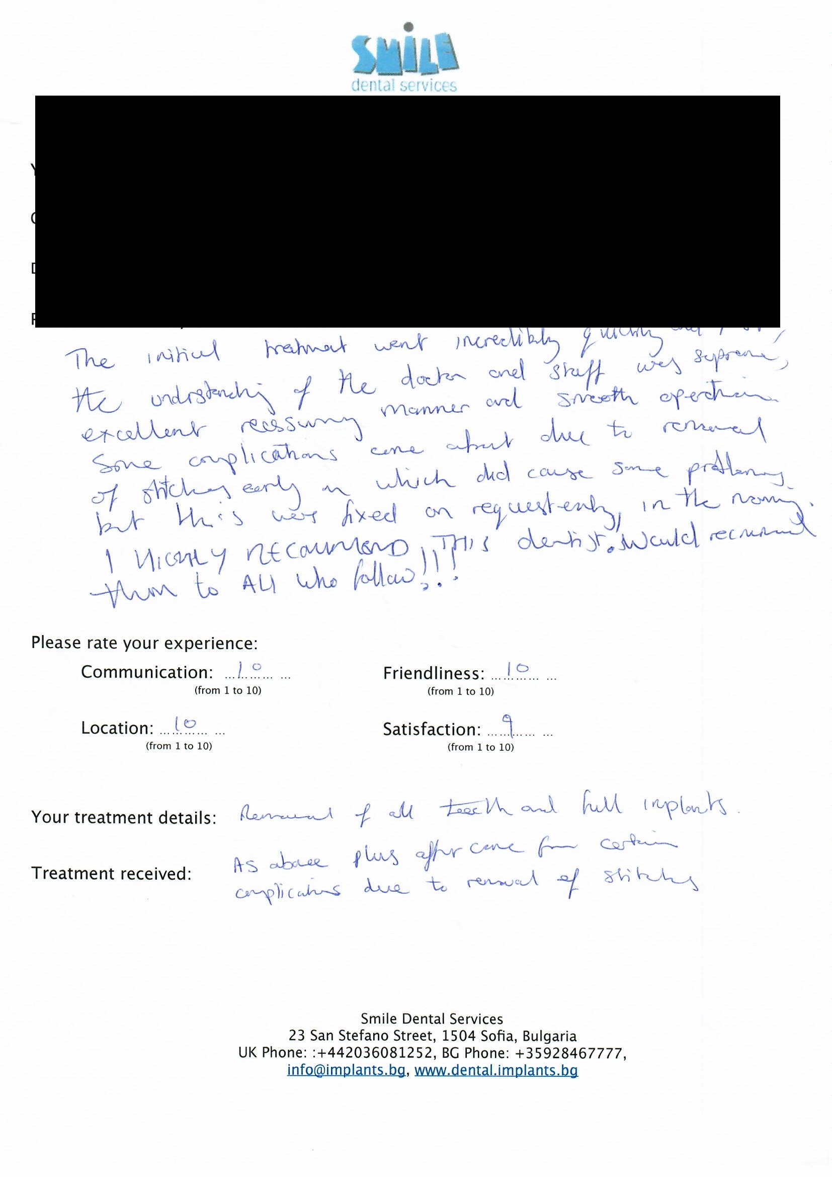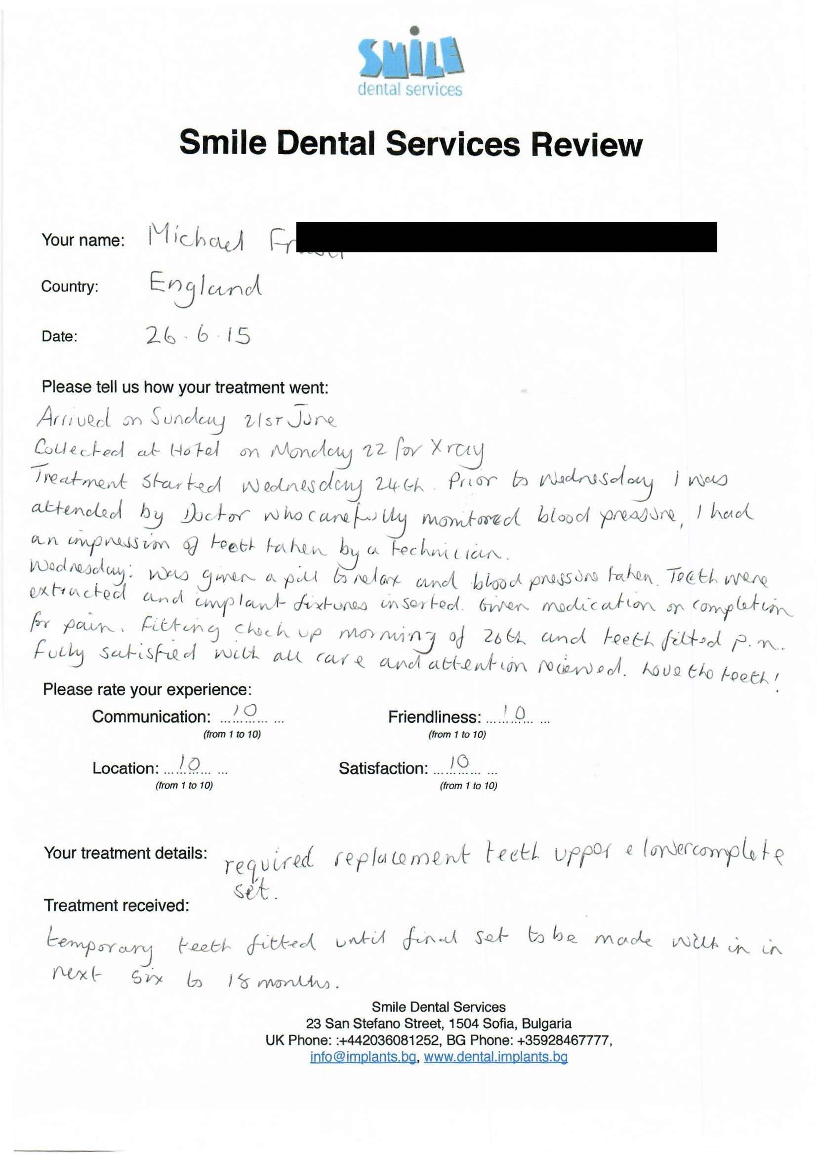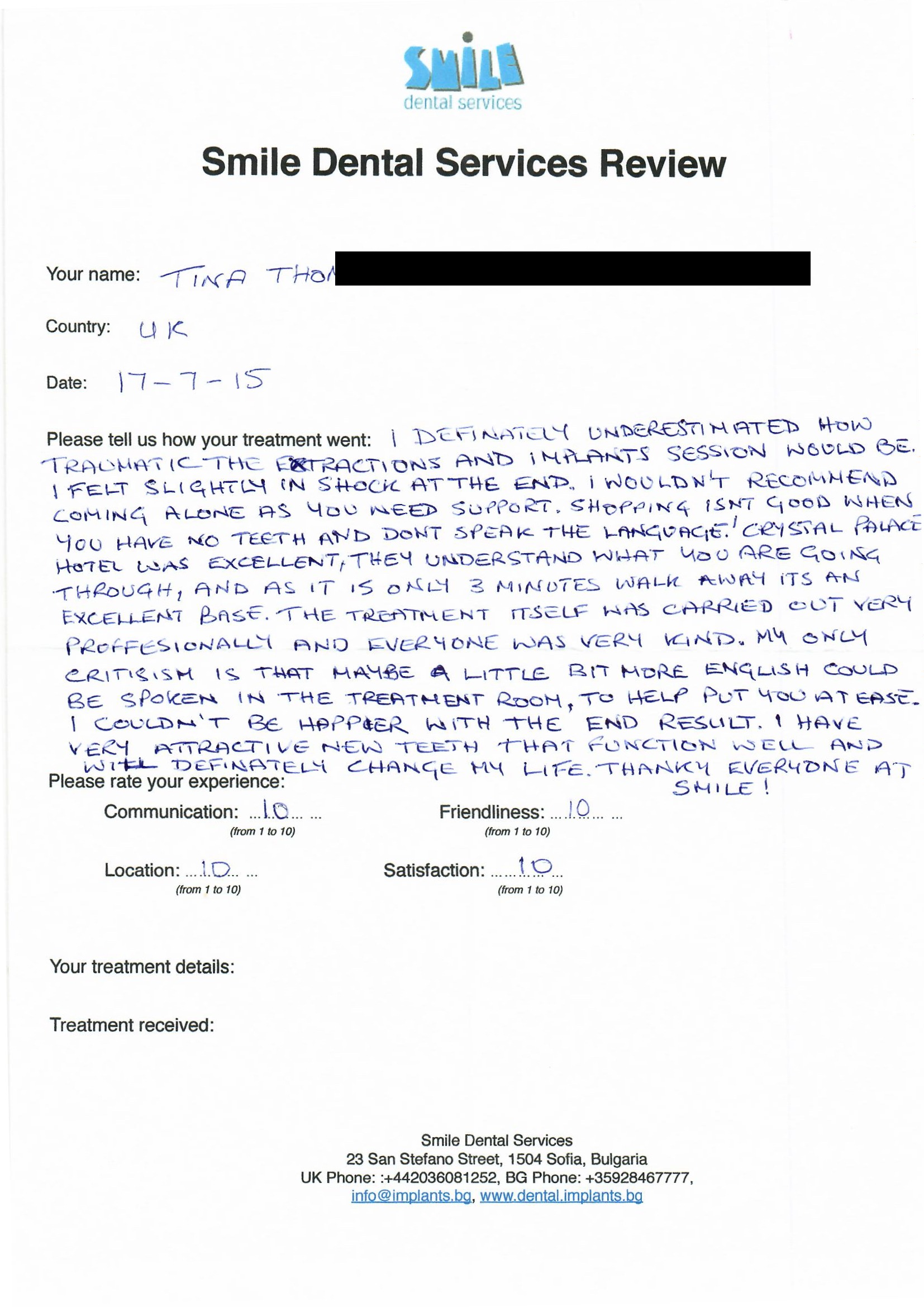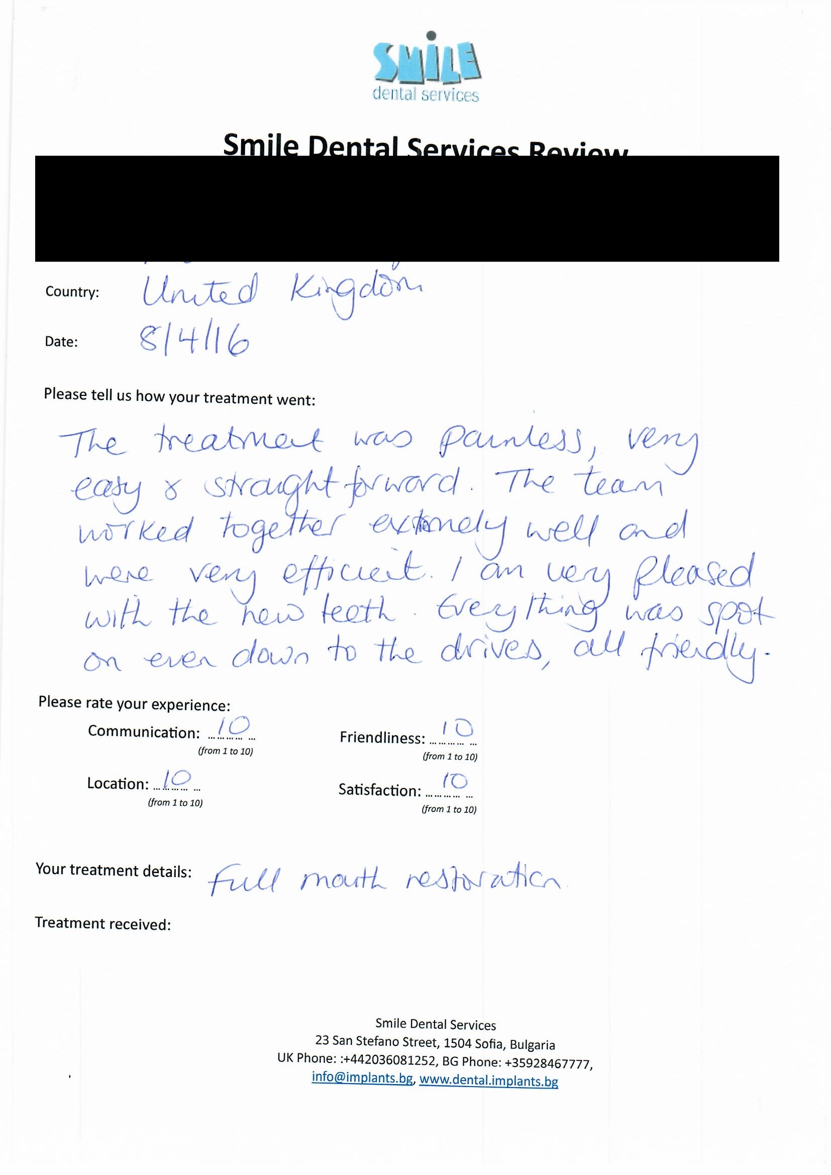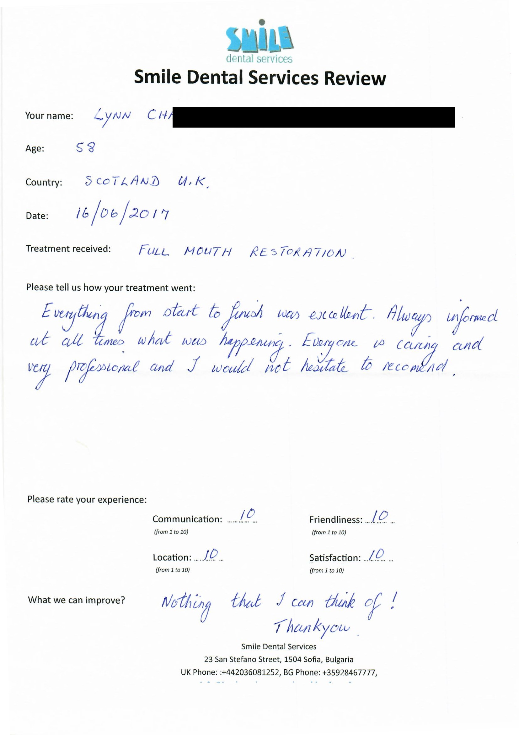 From booking my treatment till now the whole experience has been great. I suffered with poor teeth since I was a kid, dentists in the UK didn't offer much help or trust. Loads of people asked my why I was going to Bulgaria for treatment, I guess the result and the smooth handling of my case by yourself and your team are why. Are there things you could improve, yes.