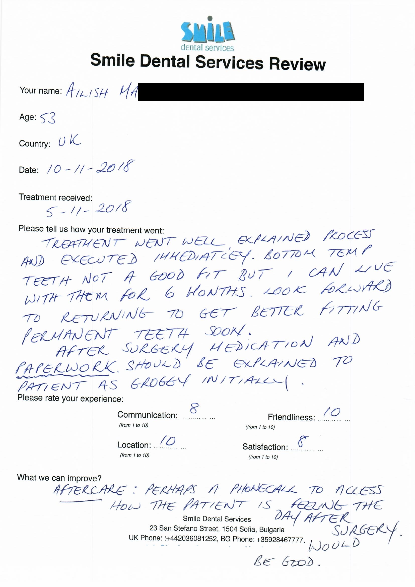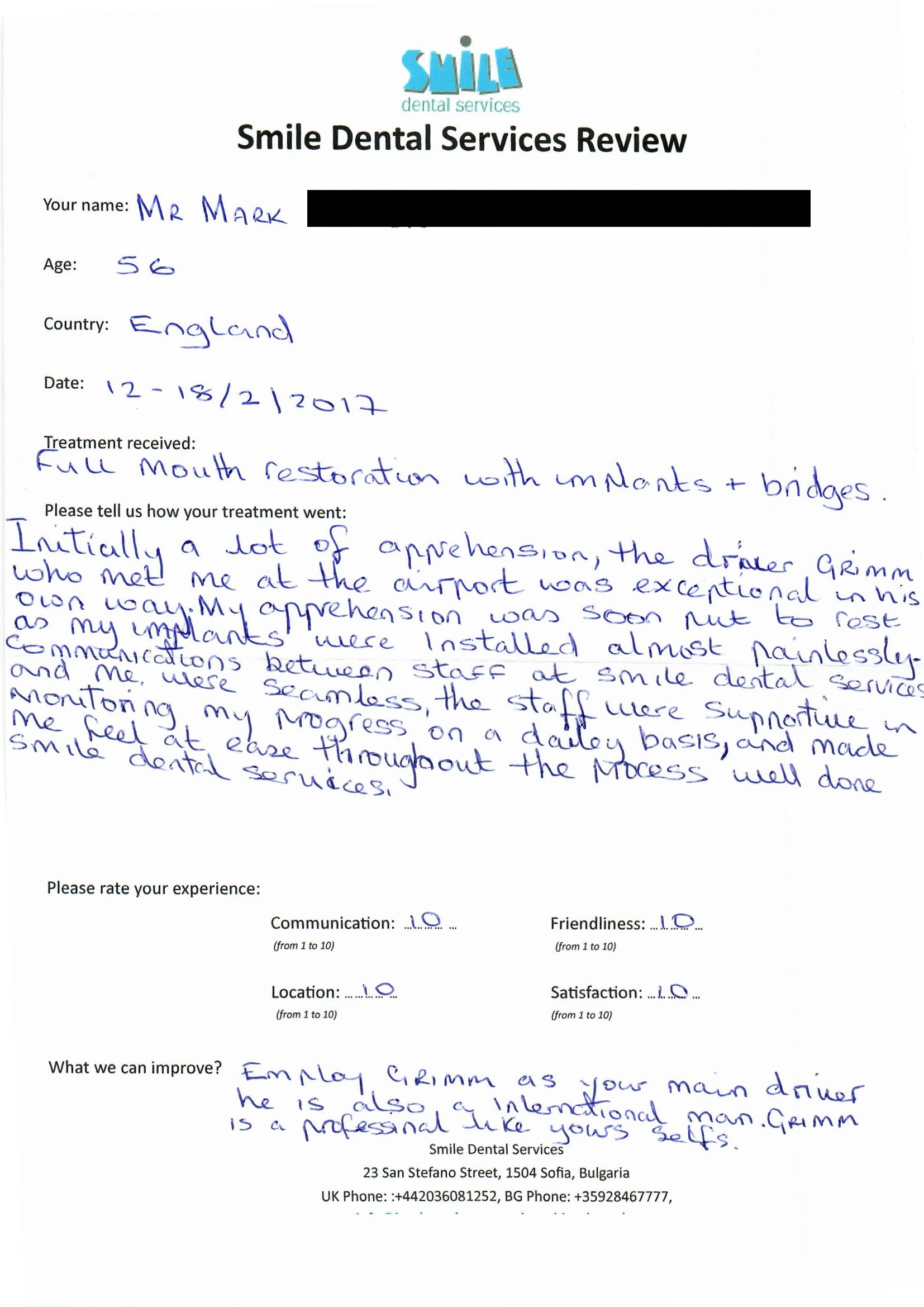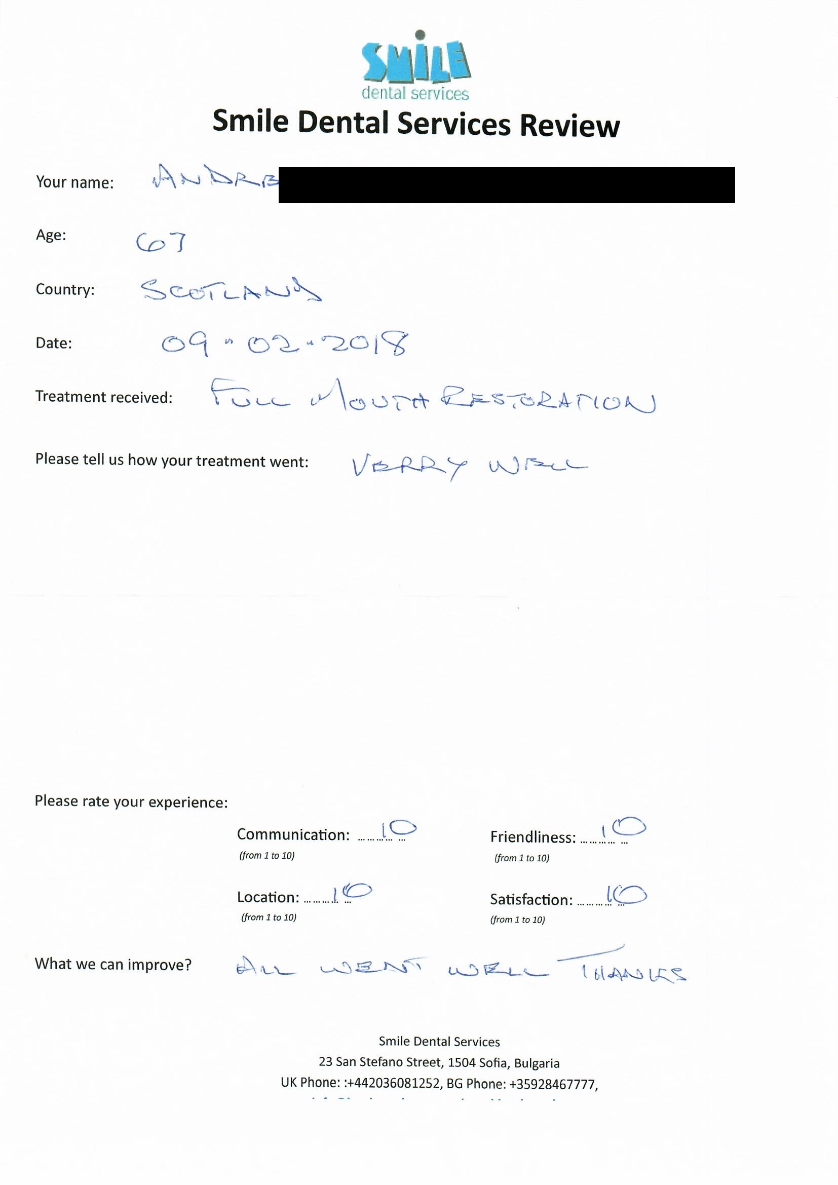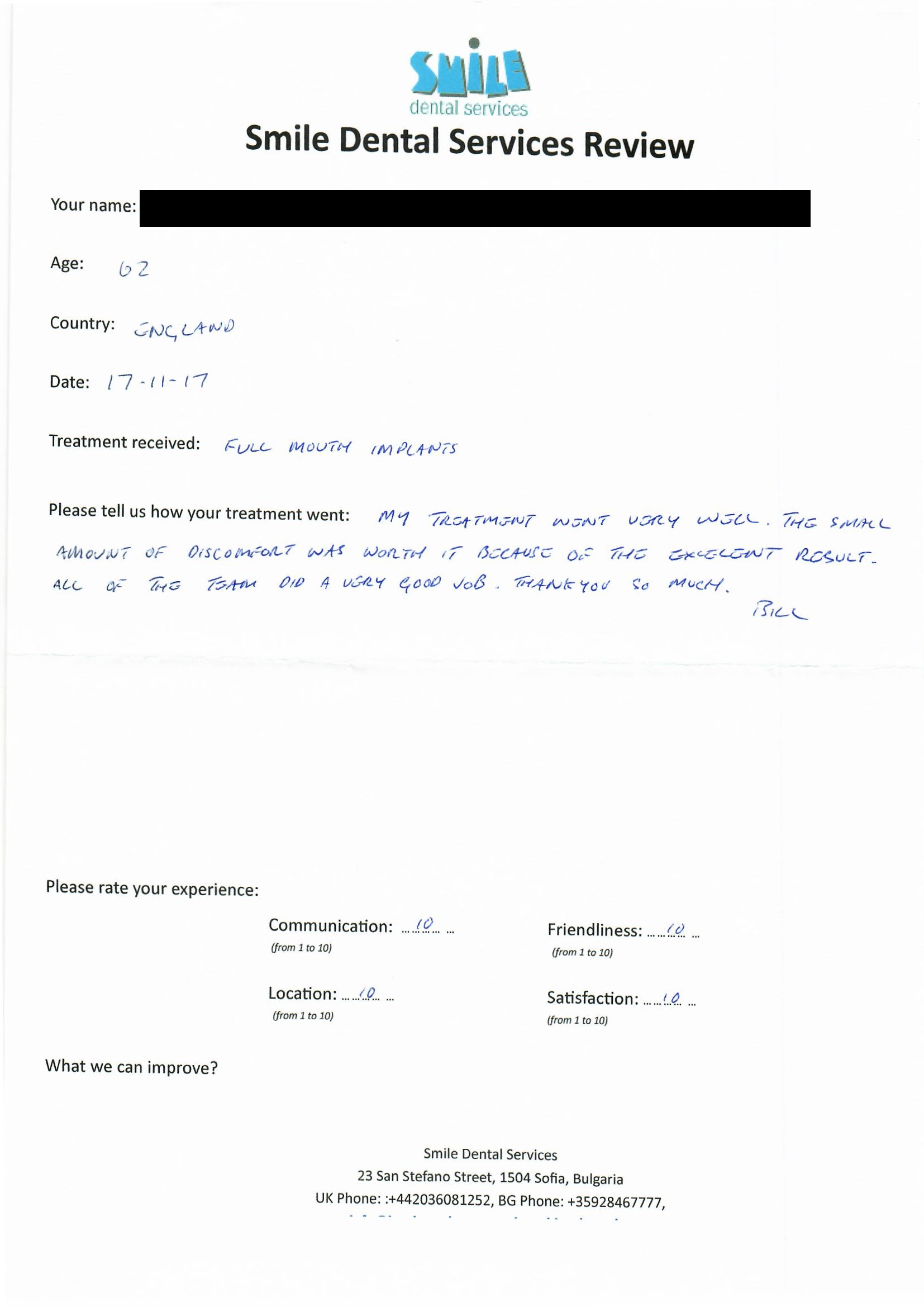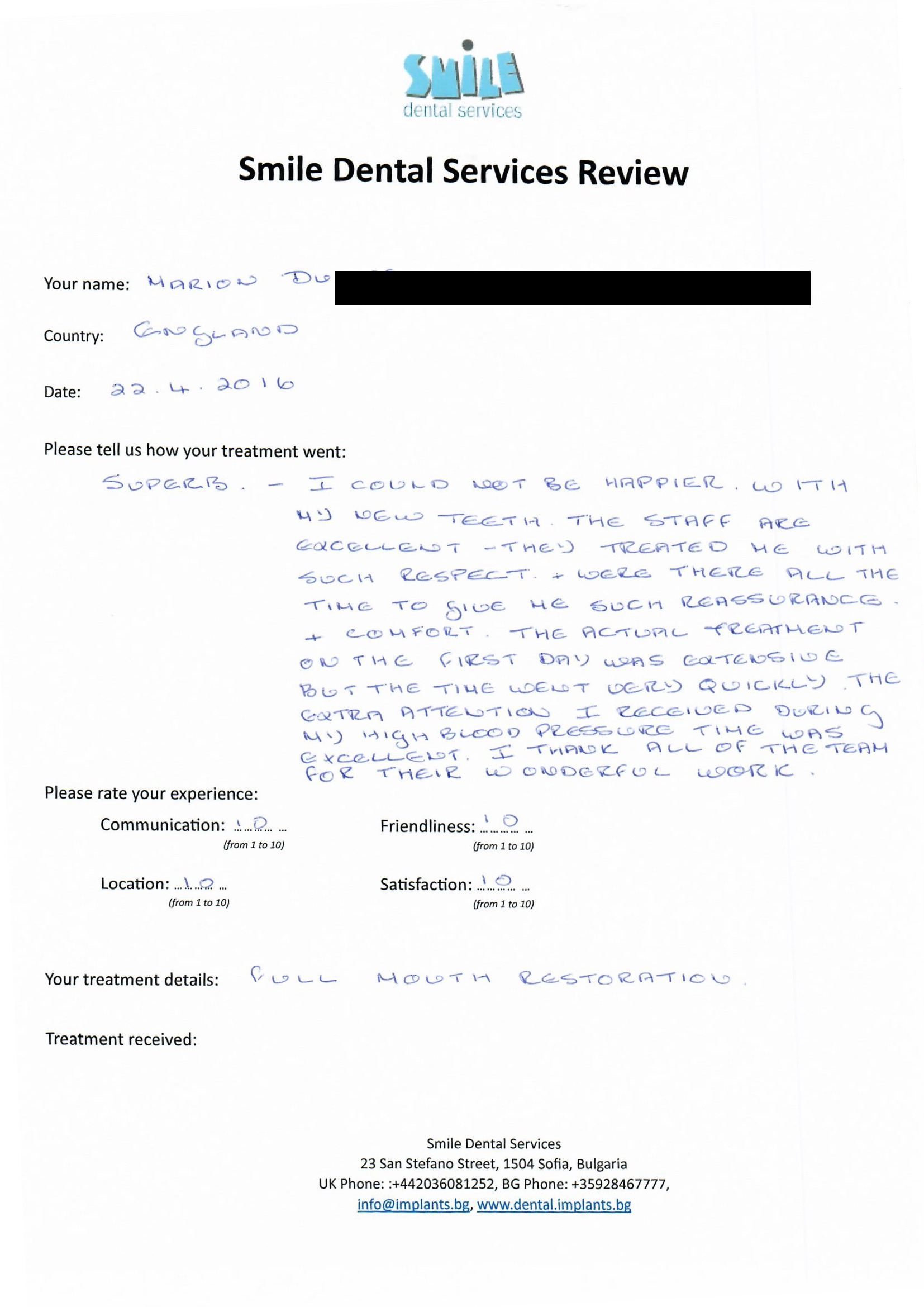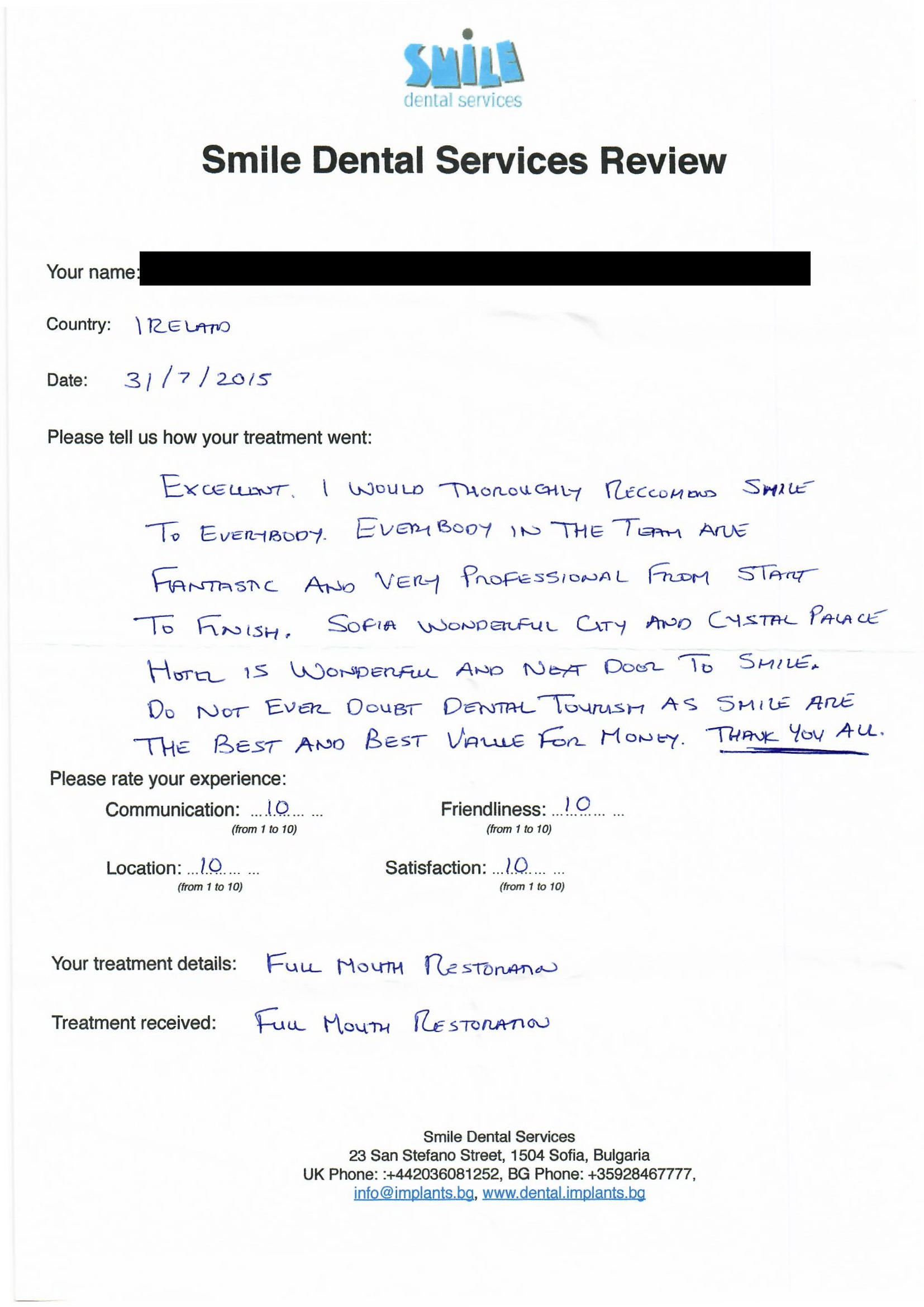 From booking my treatment till now the whole experience has been great. I suffered with poor teeth since I was a kid, dentists in the UK didn't offer much help or trust. Loads of people asked my why I was going to Bulgaria for treatment, I guess the result and the smooth handling of my case by yourself and your team are why. Are there things you could improve, yes.