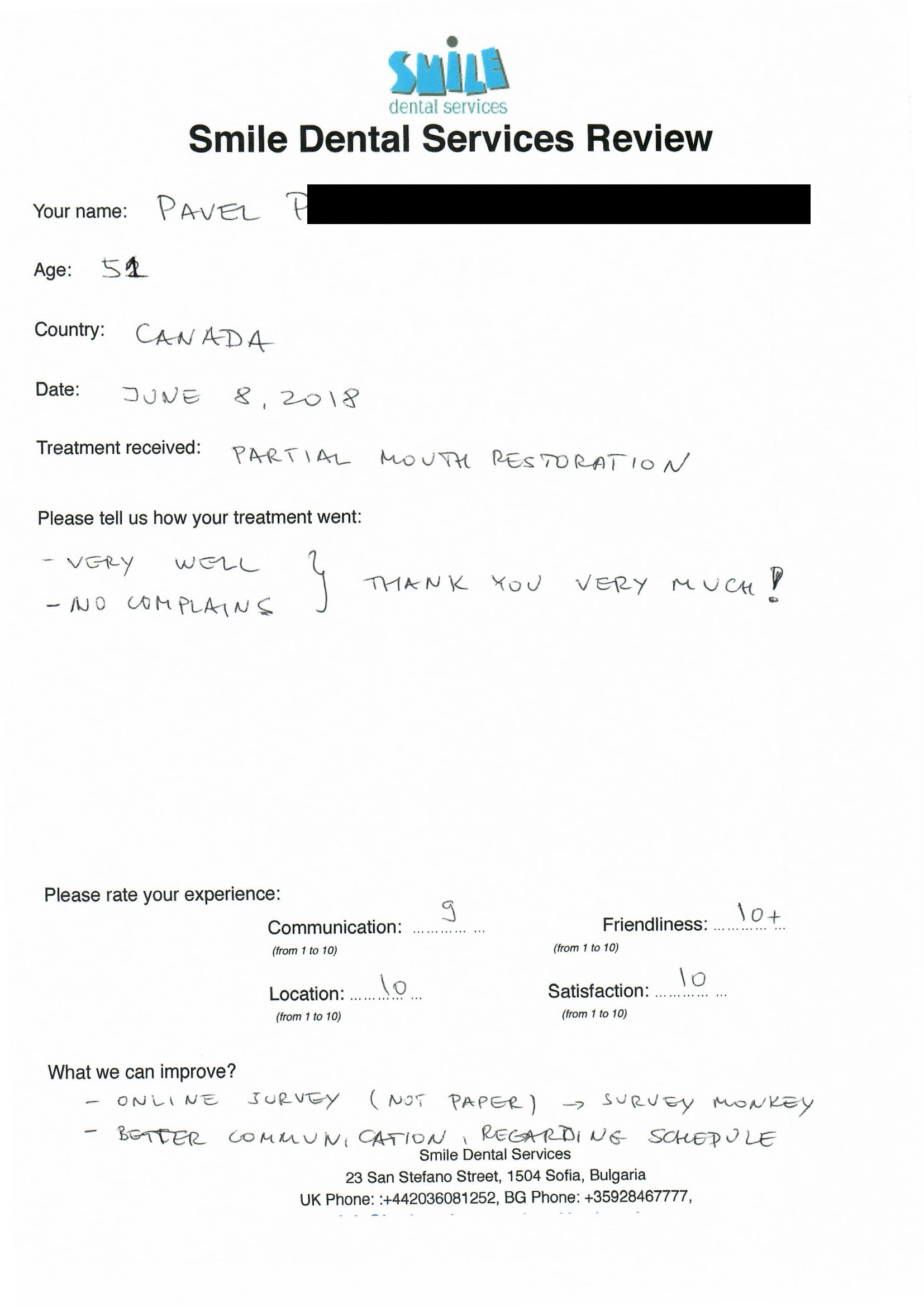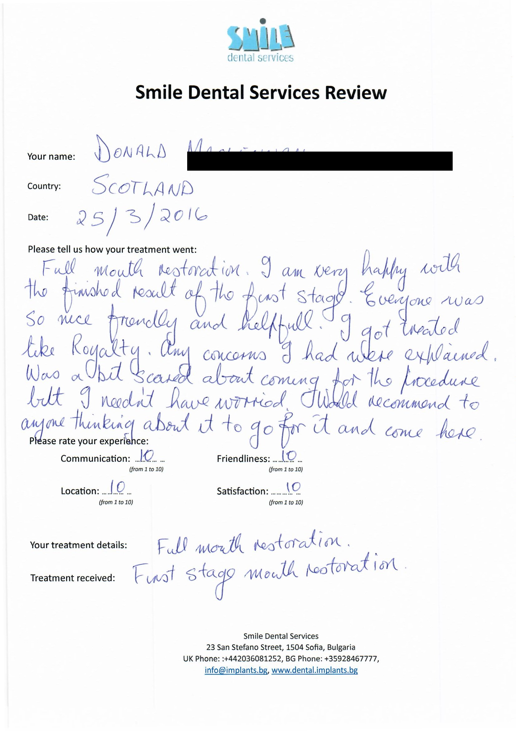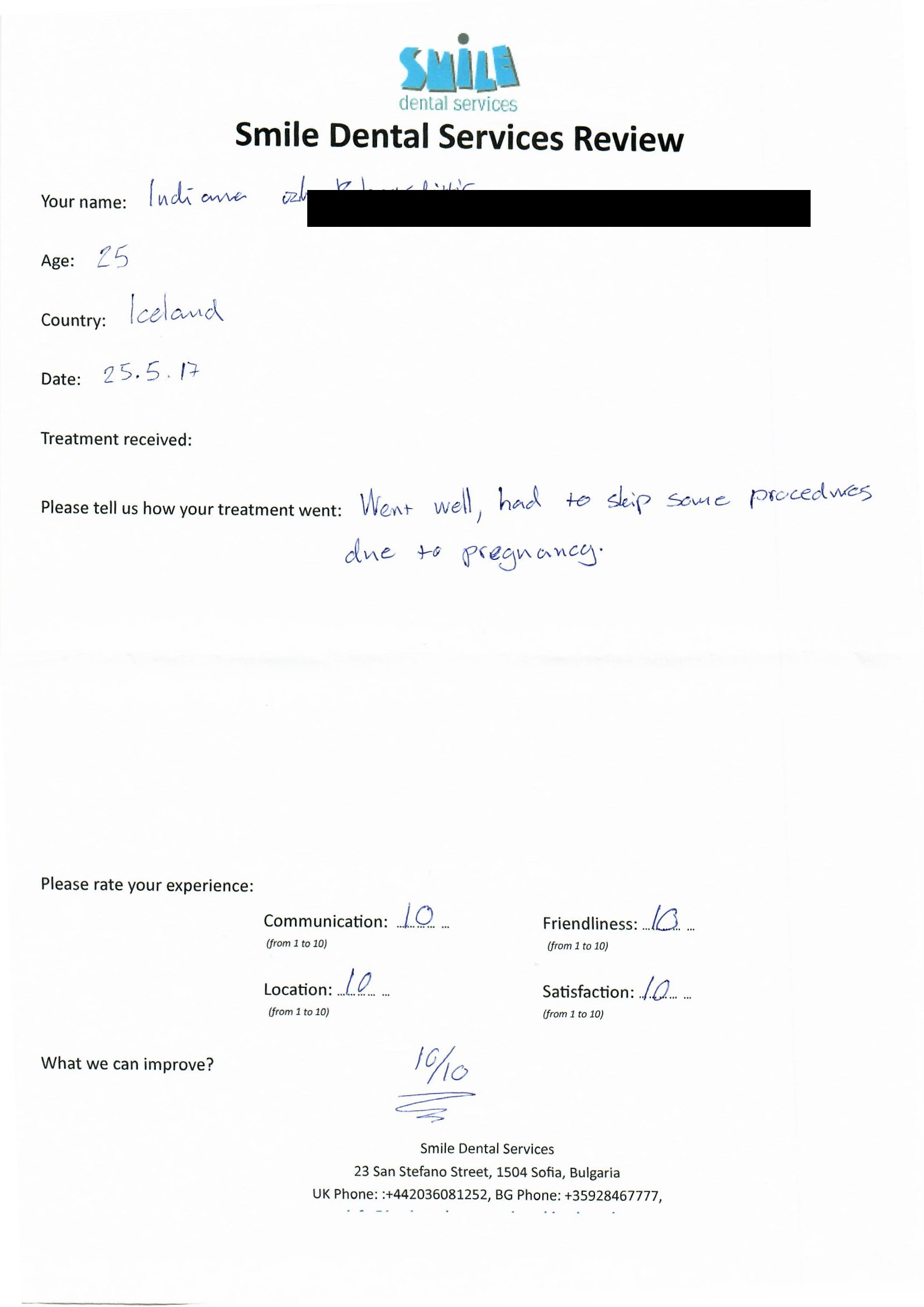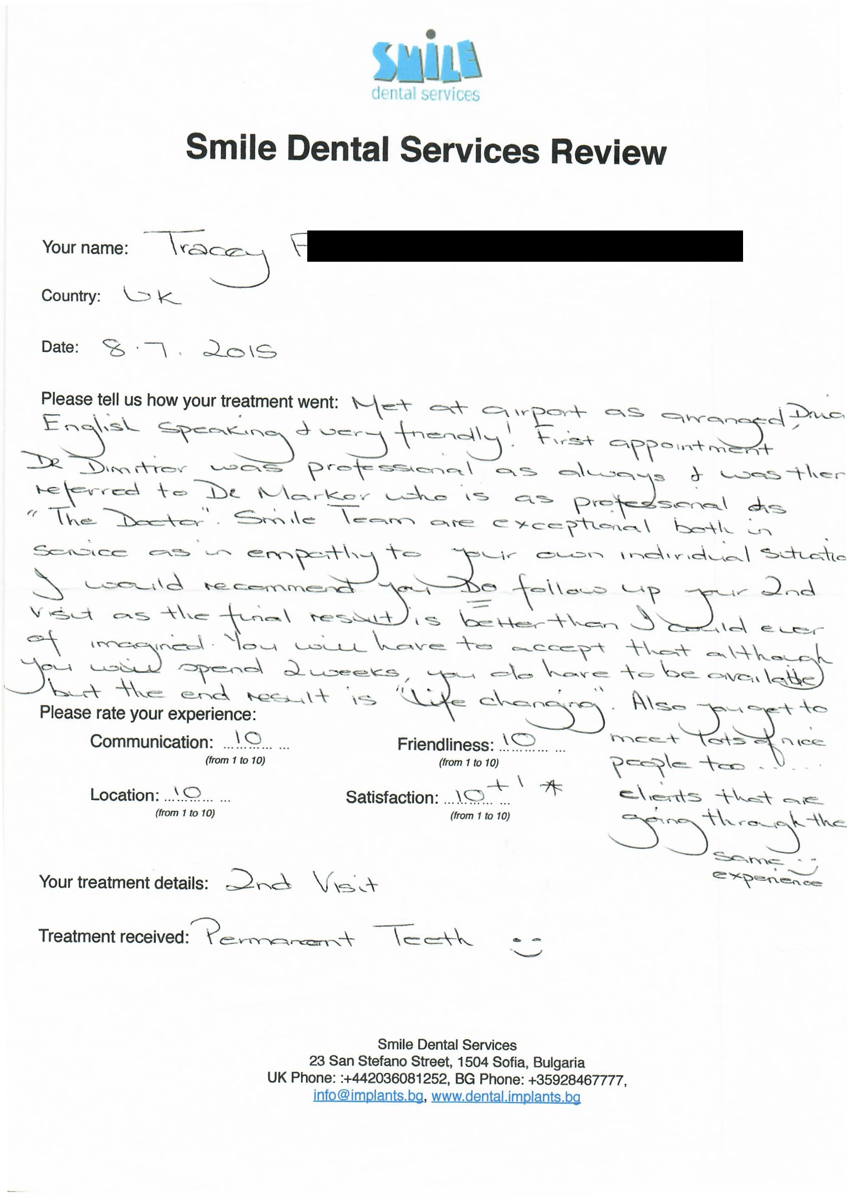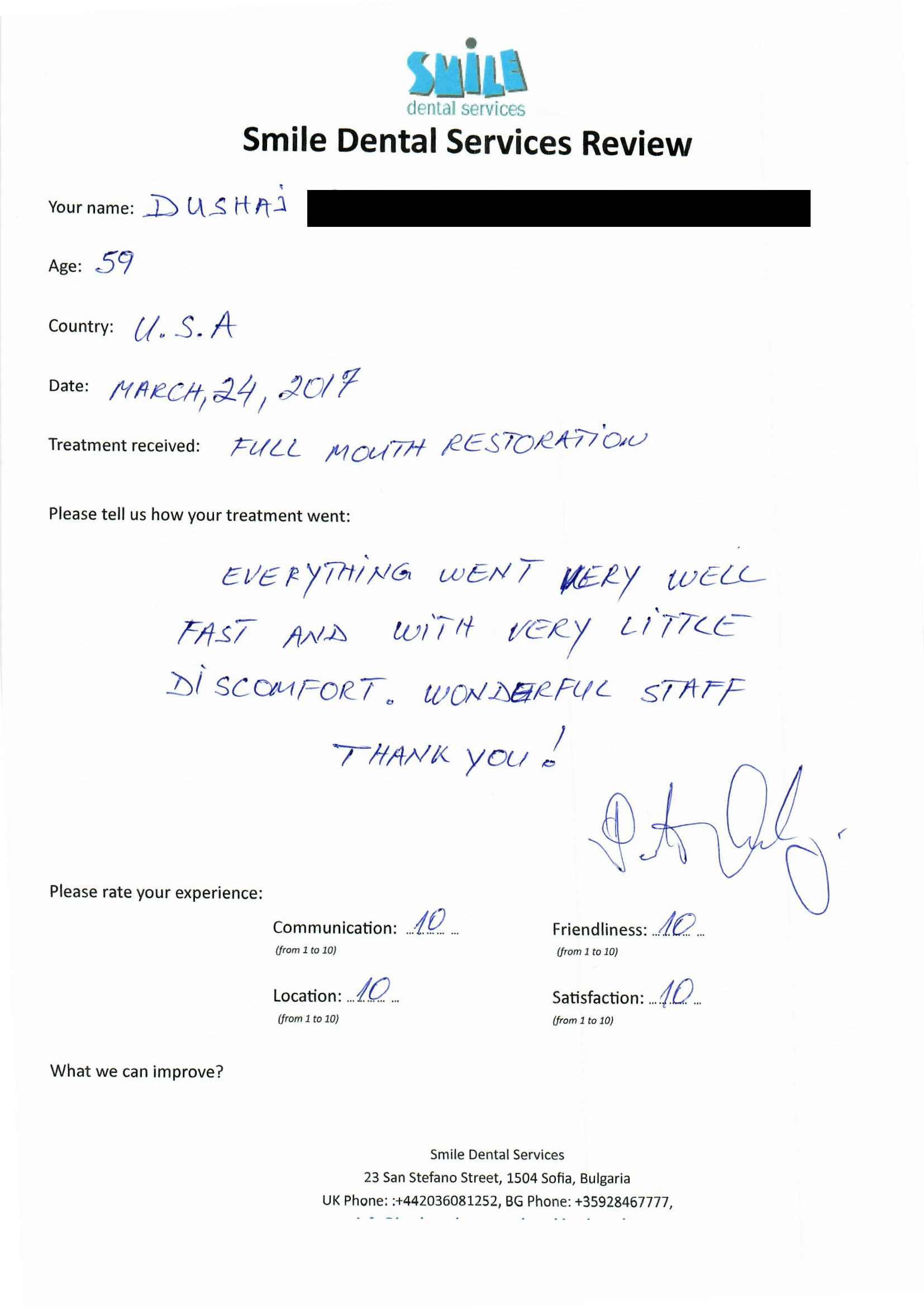 From booking my treatment till now the whole experience has been great. I suffered with poor teeth since I was a kid, dentists in the UK didn't offer much help or trust. Loads of people asked my why I was going to Bulgaria for treatment, I guess the result and the smooth handling of my case by yourself and your team are why. Are there things you could improve, yes.