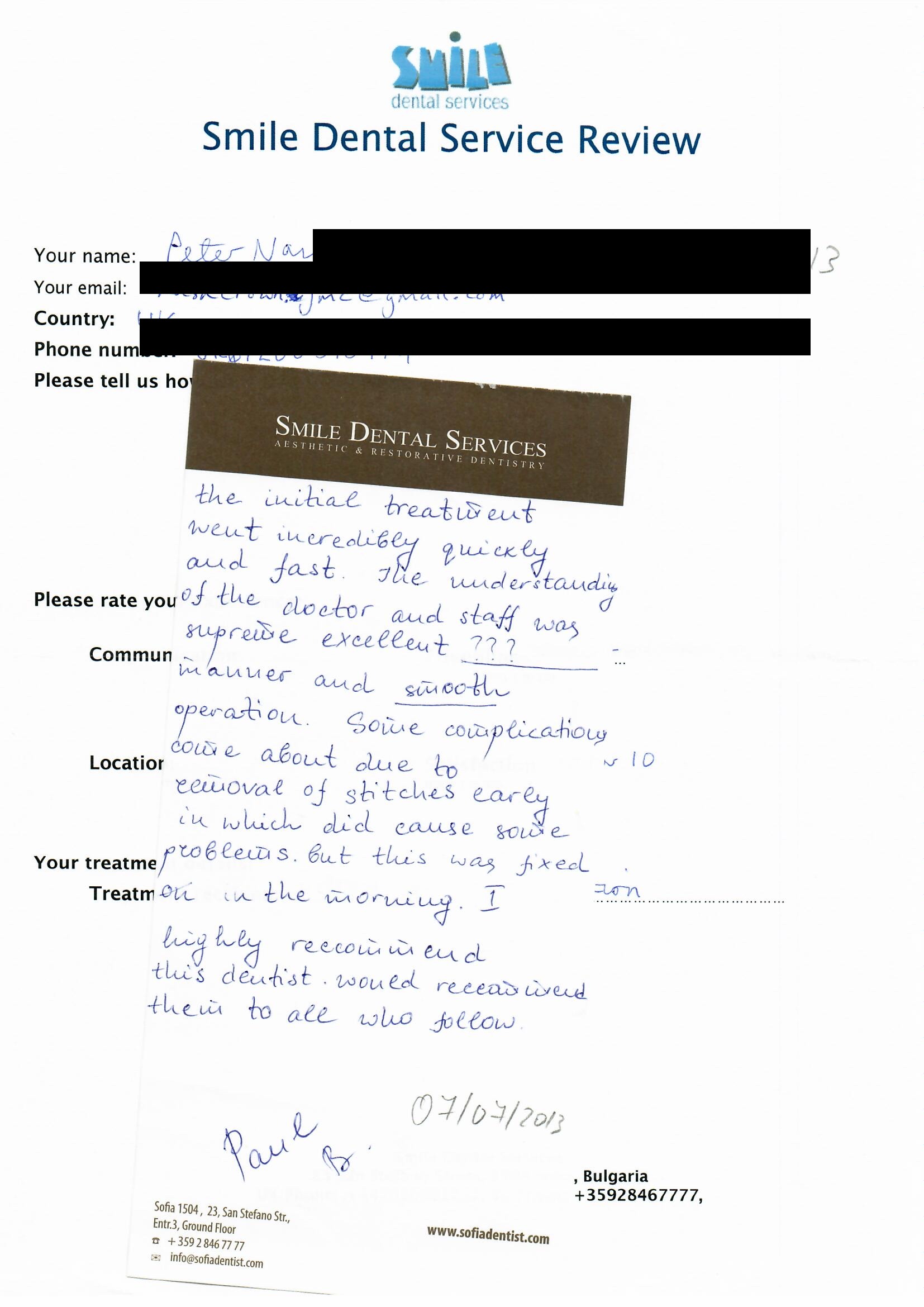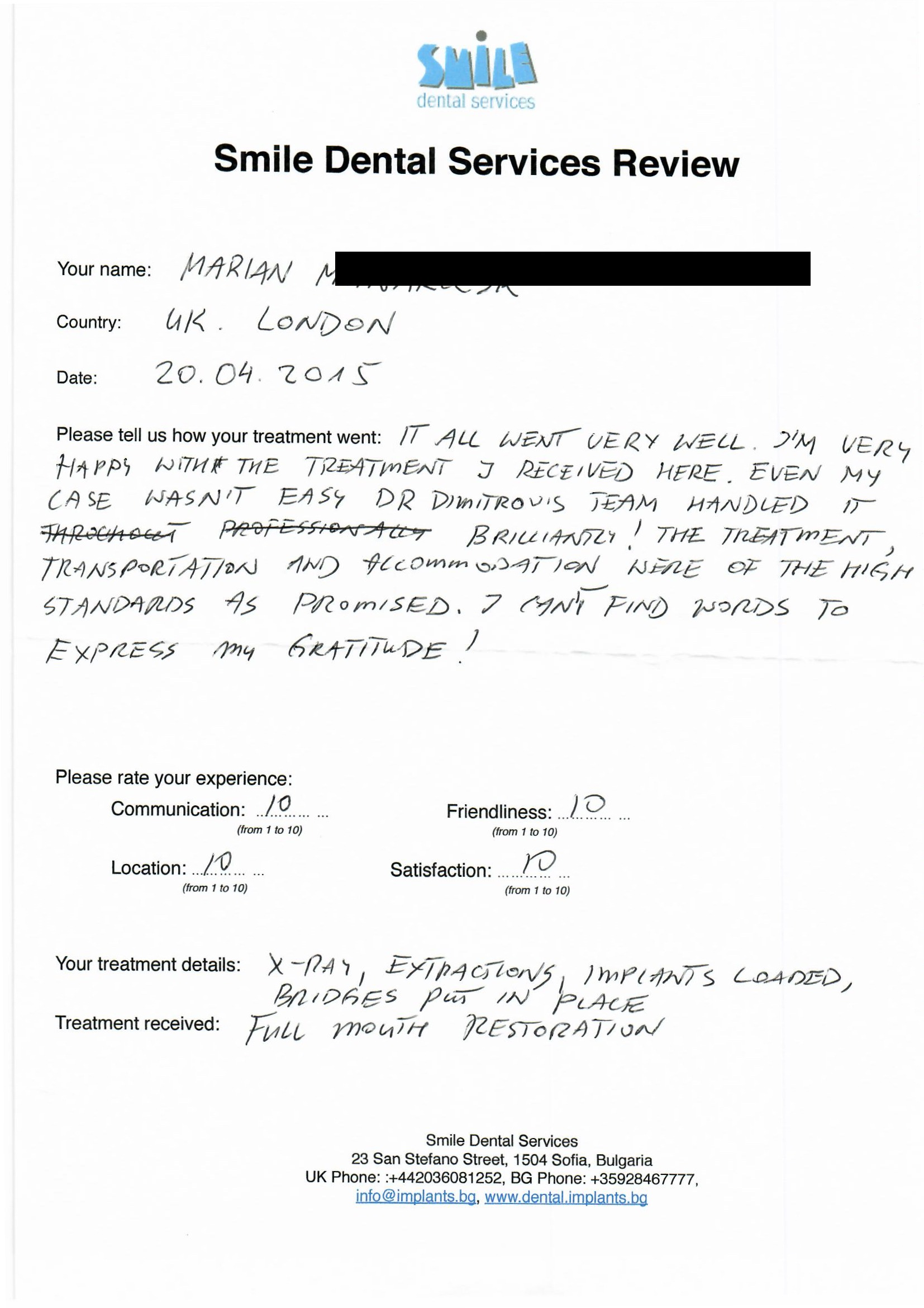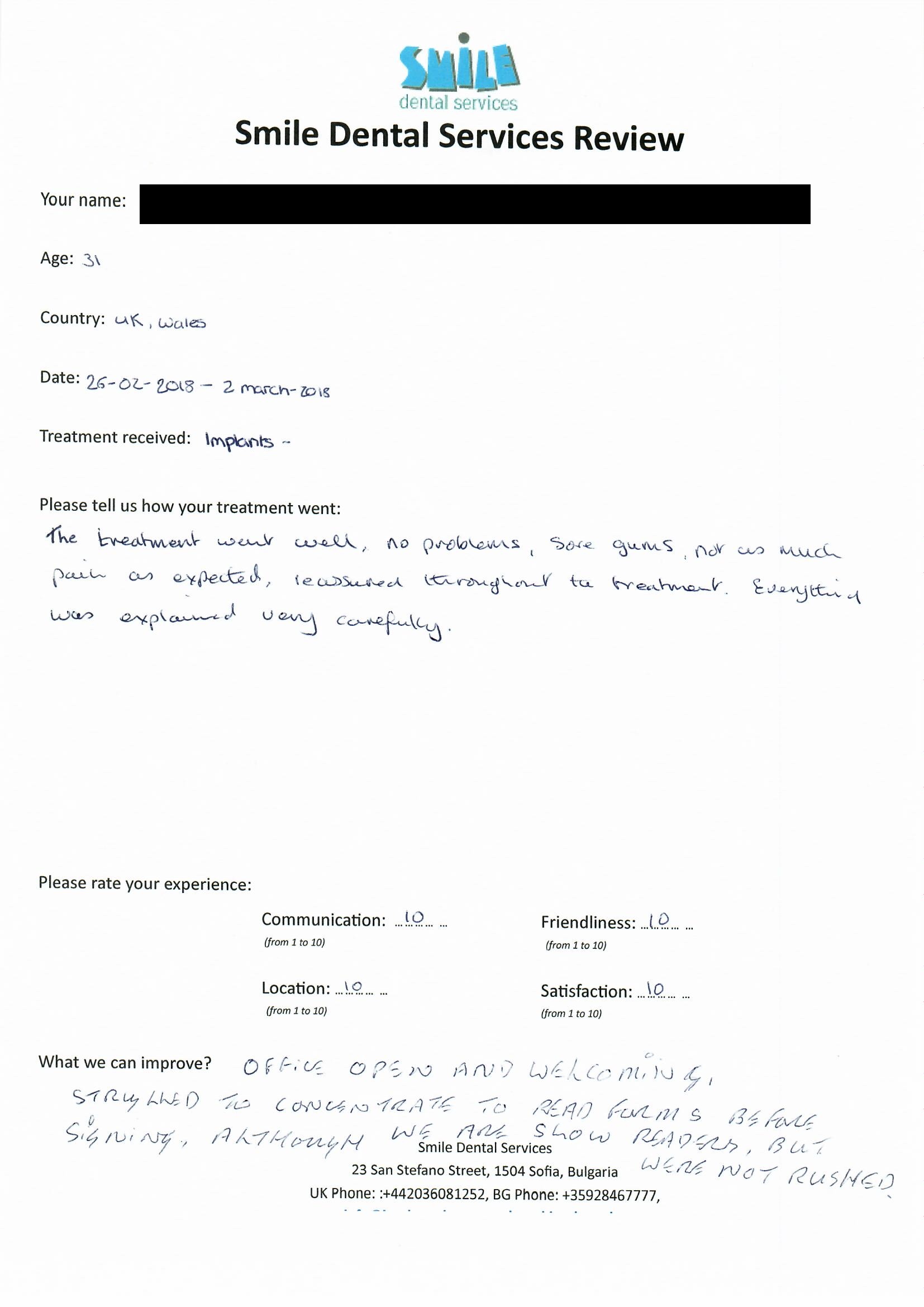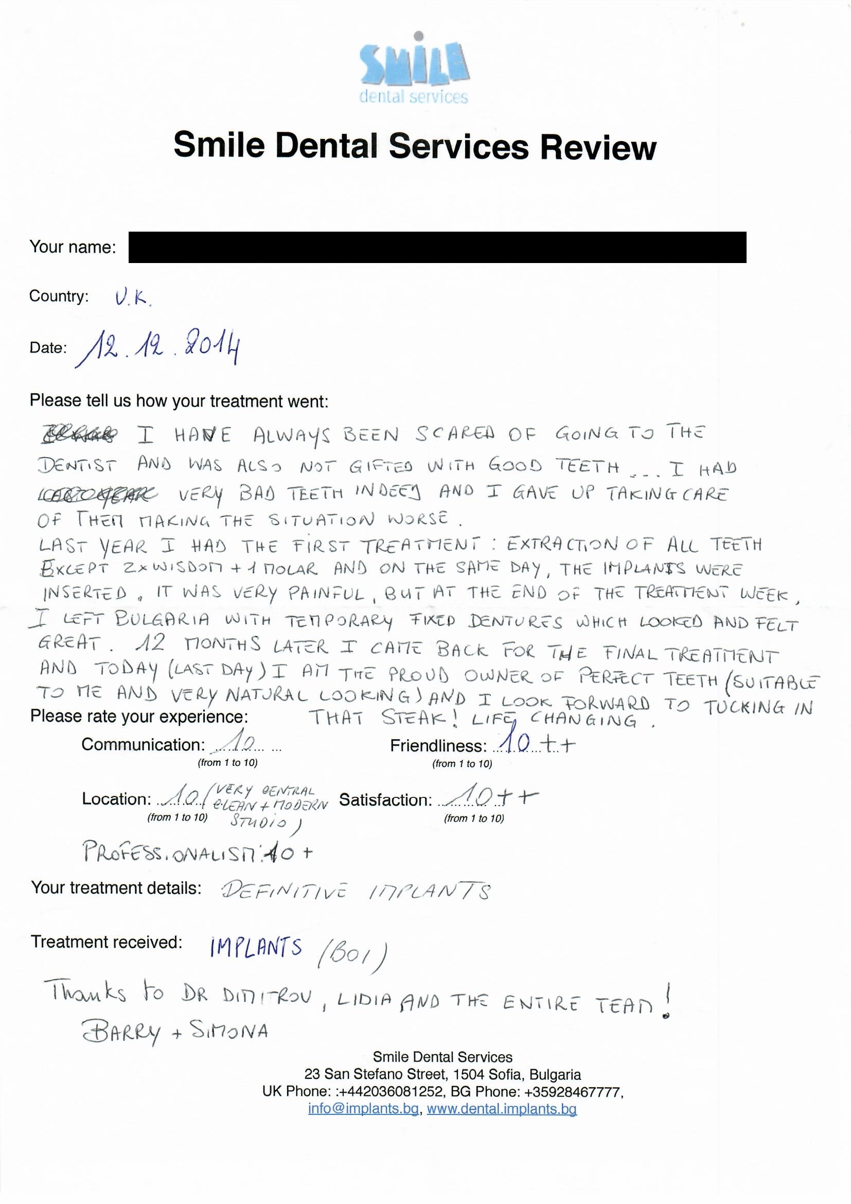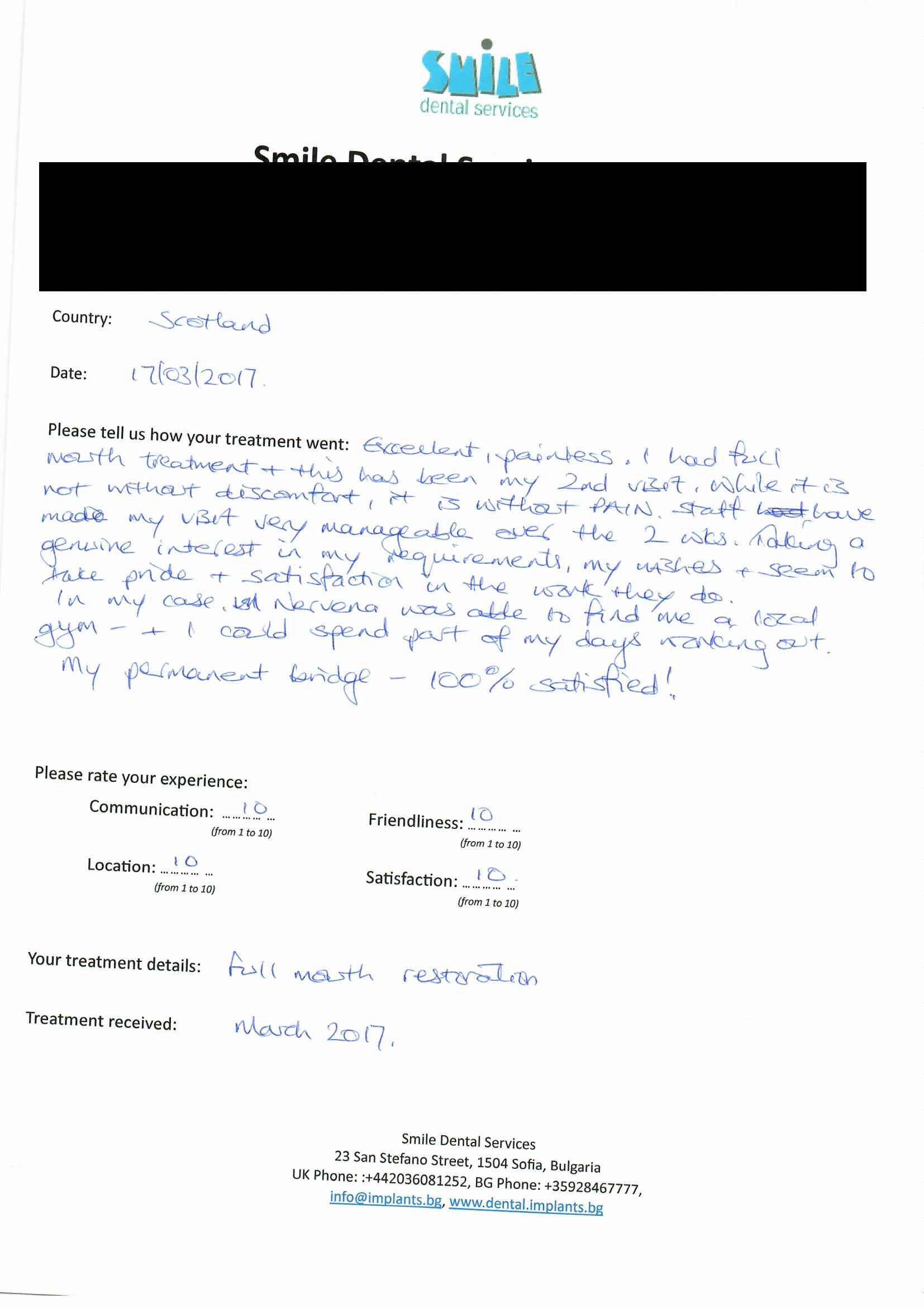 From booking my treatment till now the whole experience has been great. I suffered with poor teeth since I was a kid, dentists in the UK didn't offer much help or trust. Loads of people asked my why I was going to Bulgaria for treatment, I guess the result and the smooth handling of my case by yourself and your team are why. Are there things you could improve, yes.