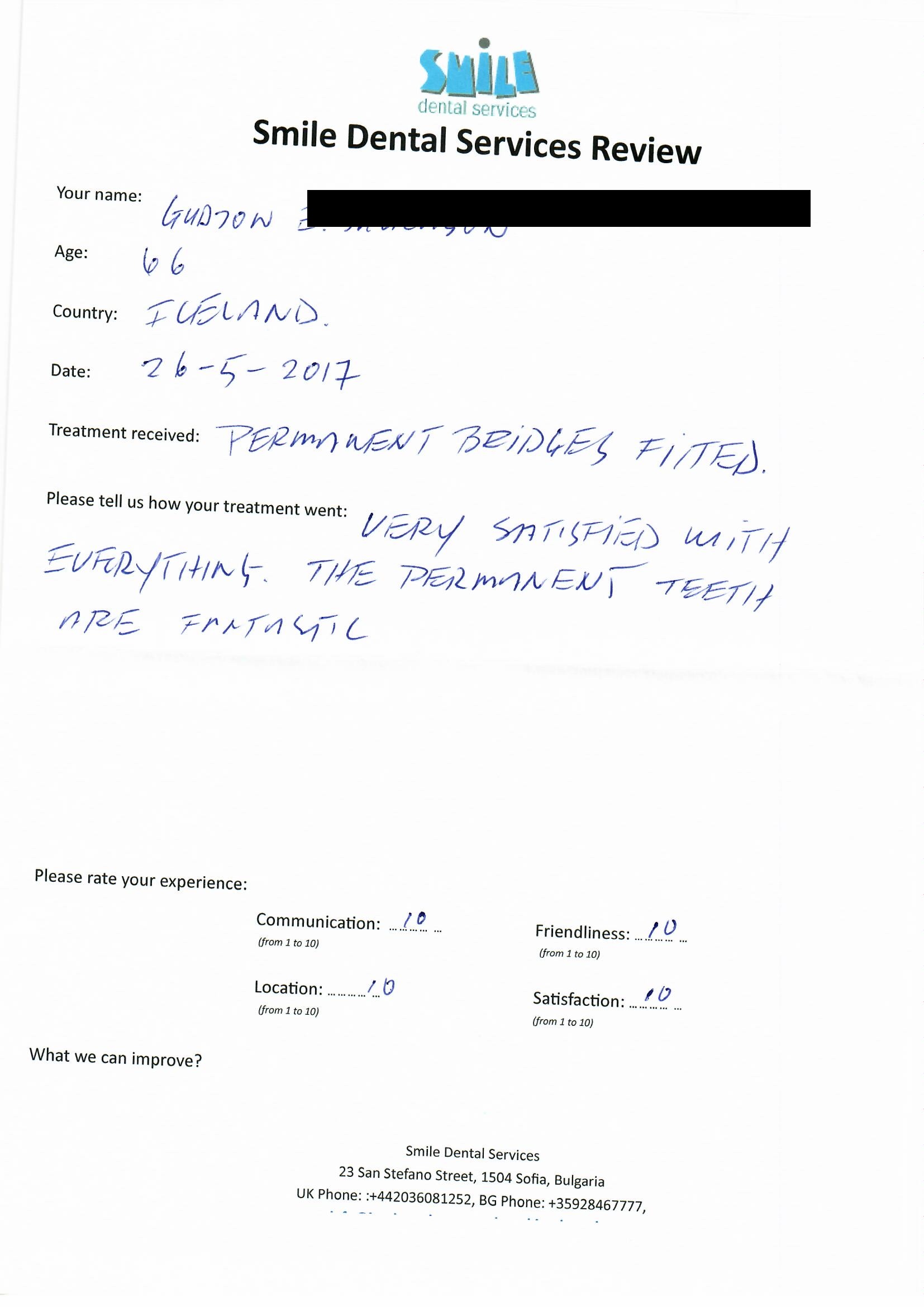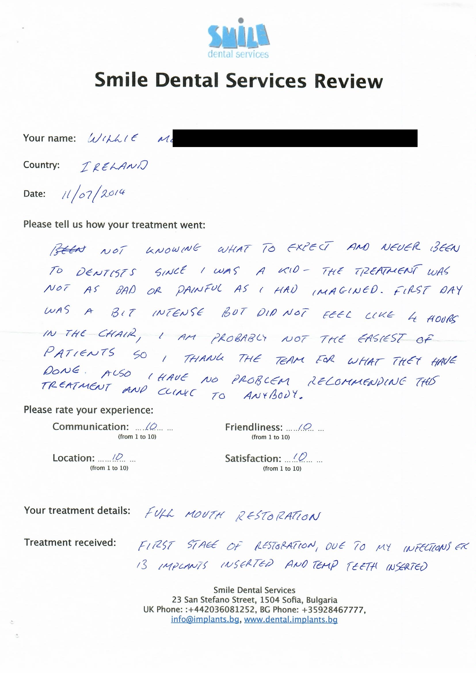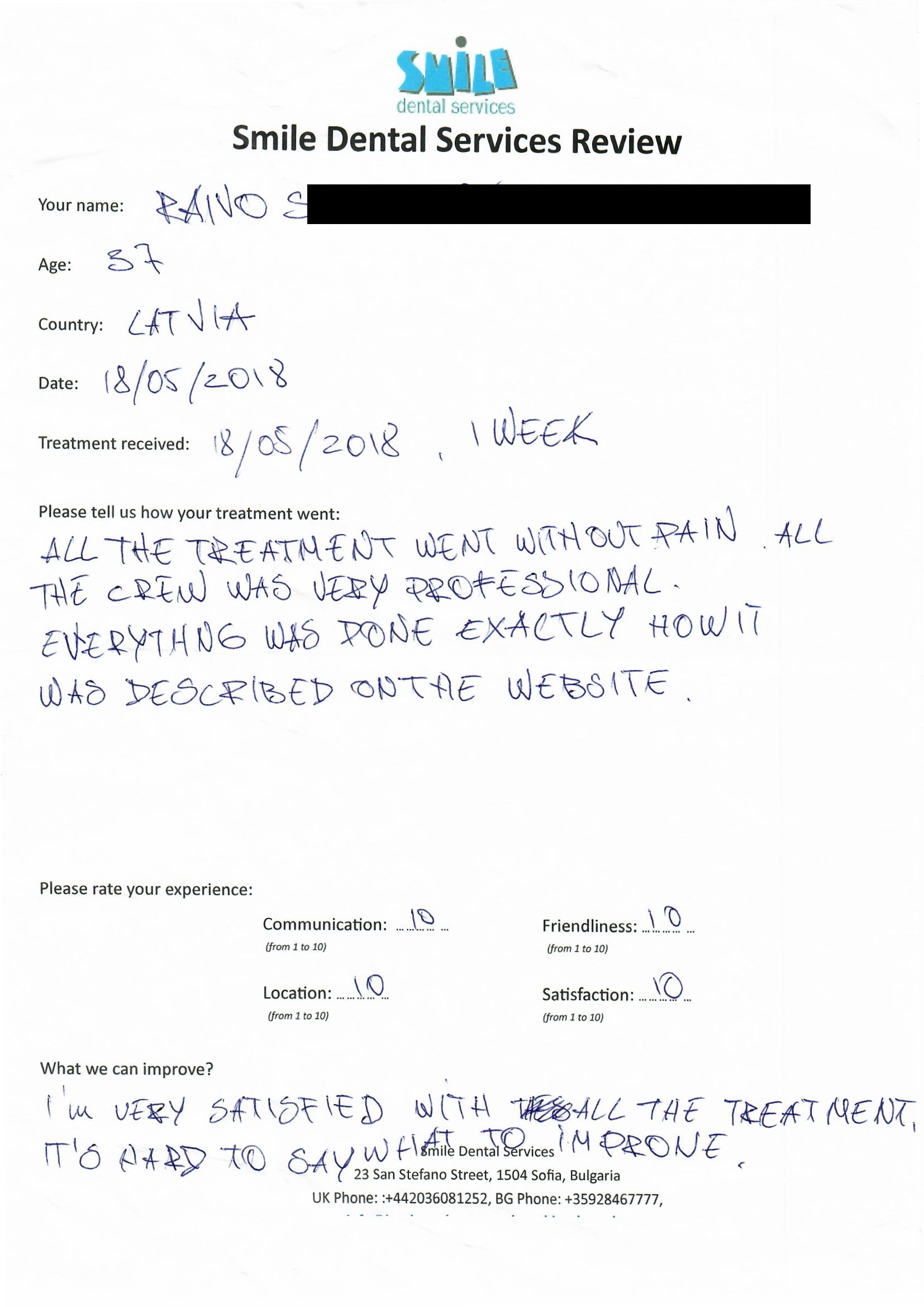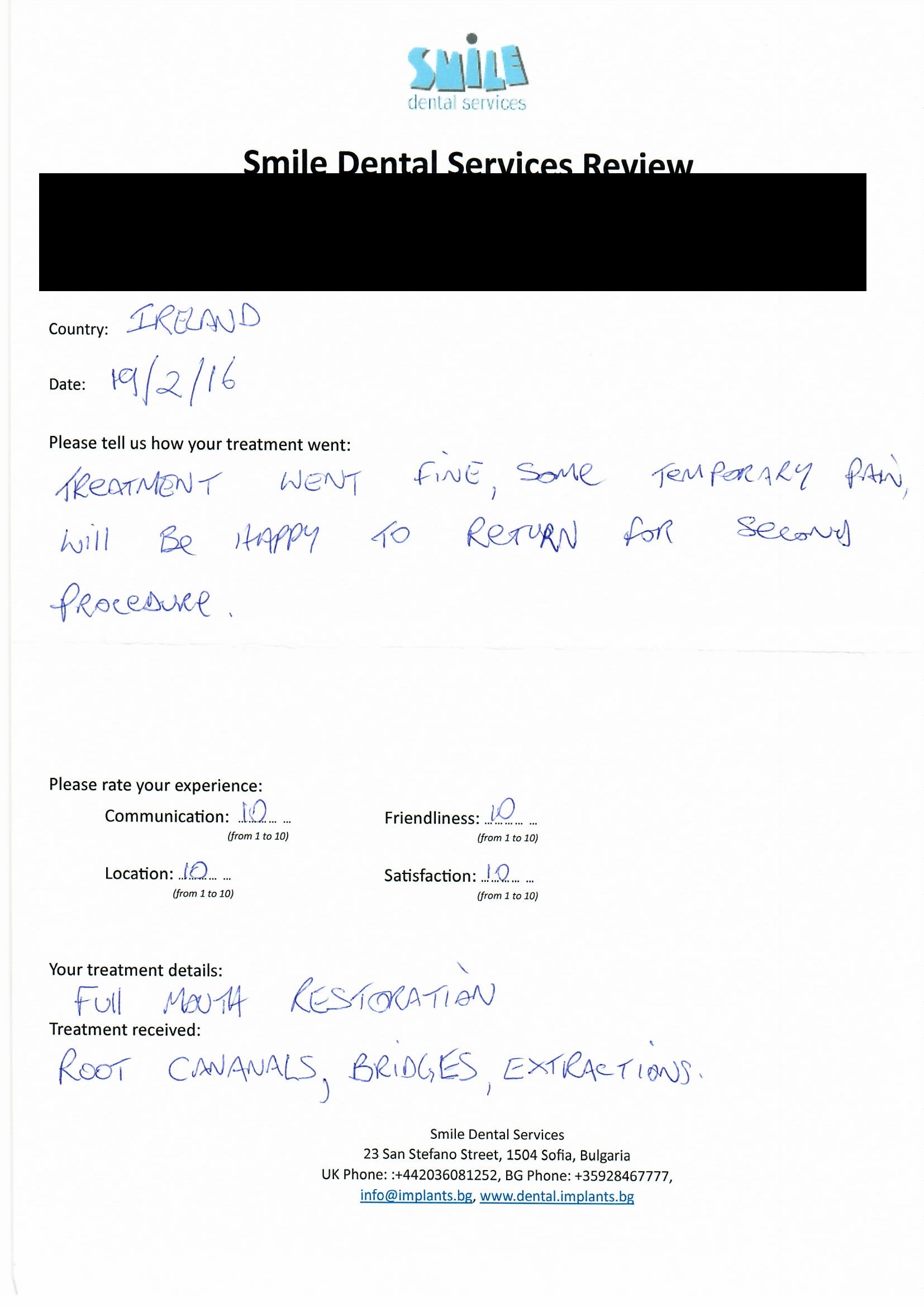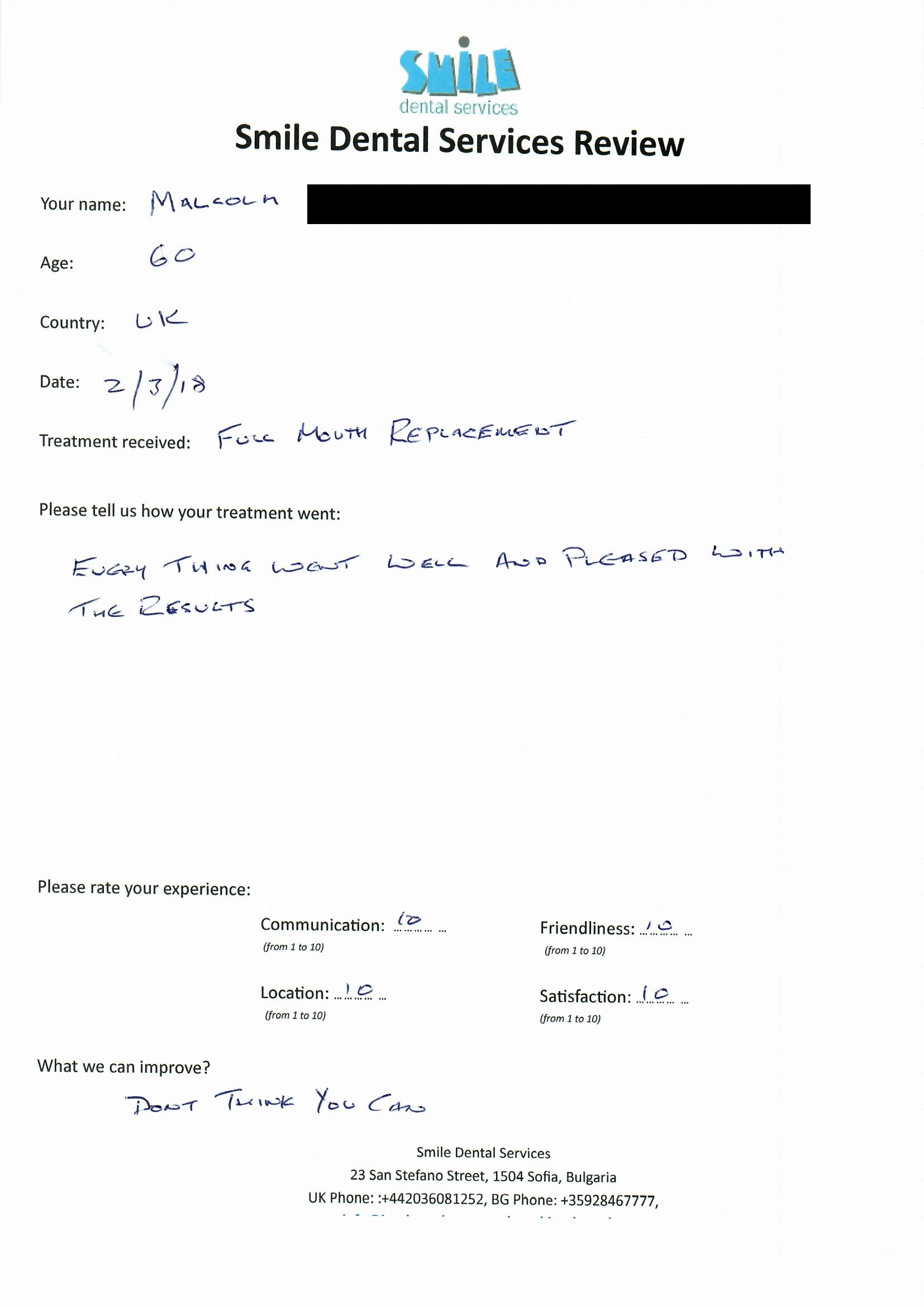 From booking my treatment till now the whole experience has been great. I suffered with poor teeth since I was a kid, dentists in the UK didn't offer much help or trust. Loads of people asked my why I was going to Bulgaria for treatment, I guess the result and the smooth handling of my case by yourself and your team are why. Are there things you could improve, yes.