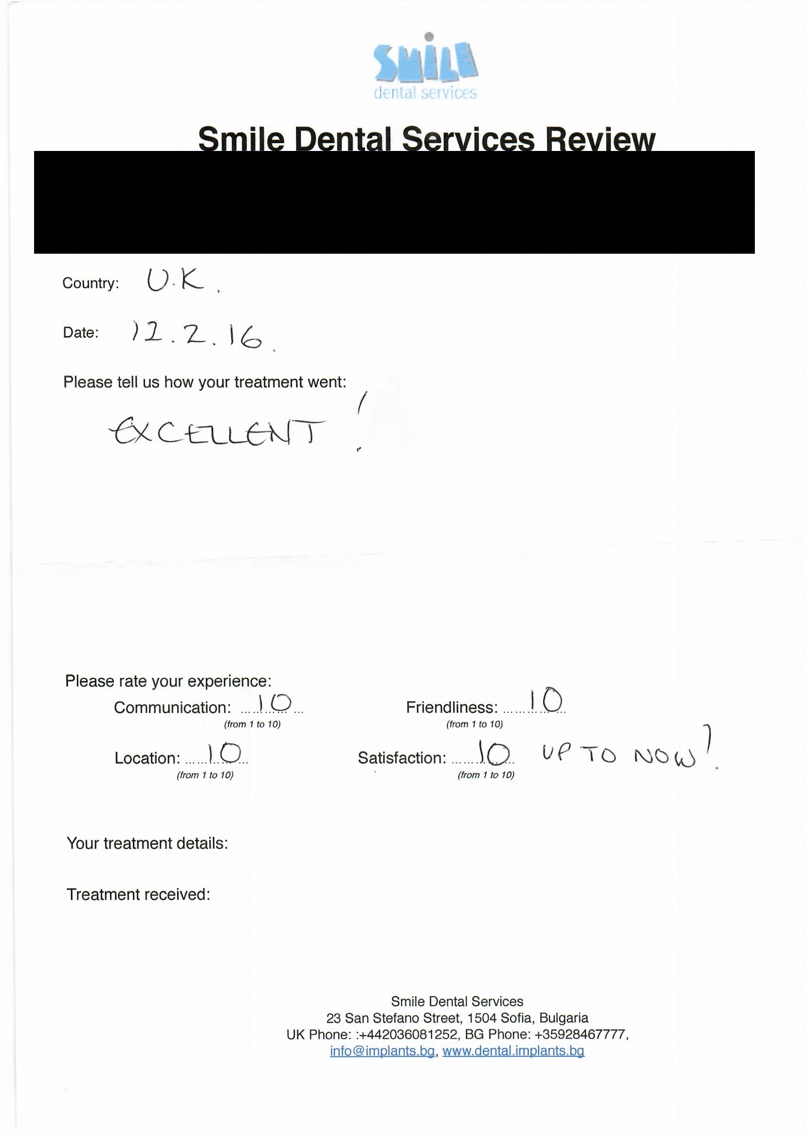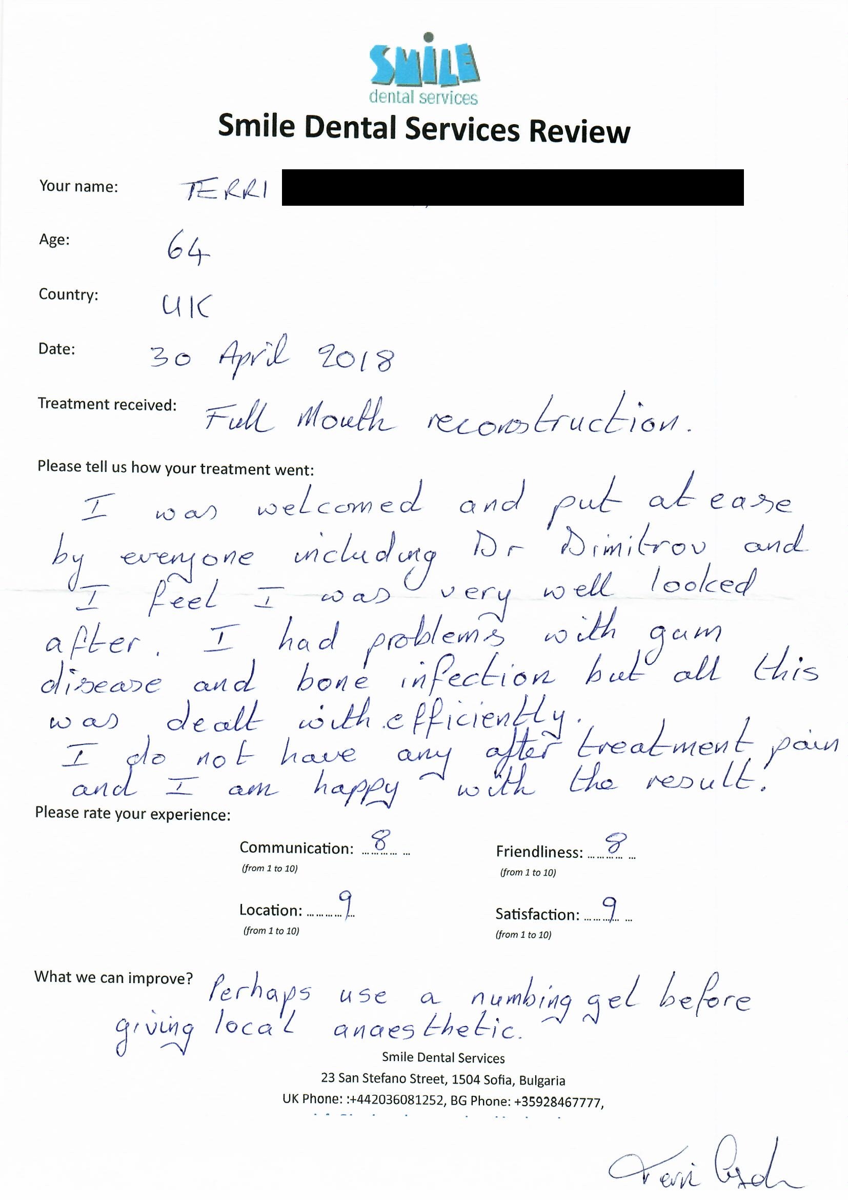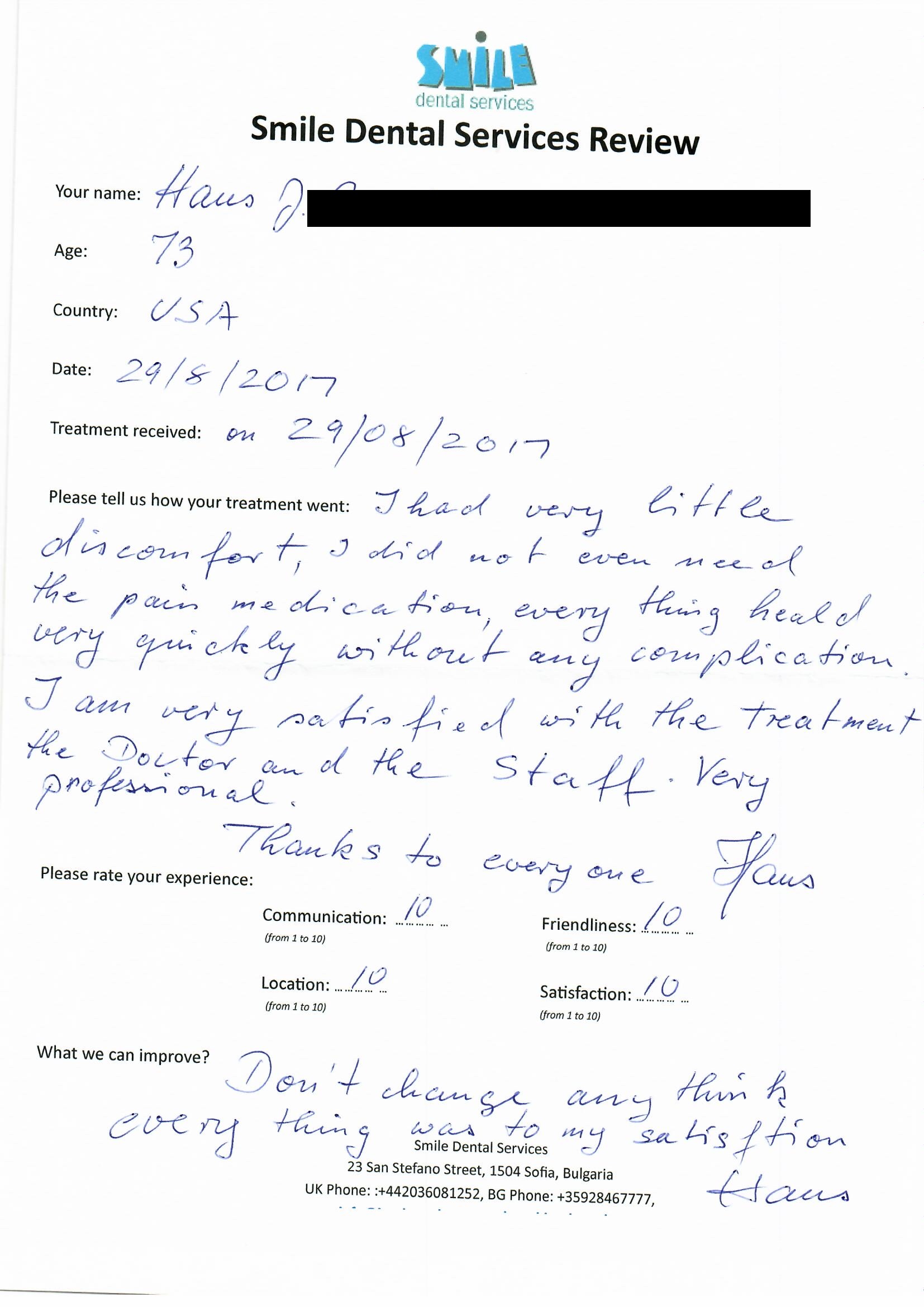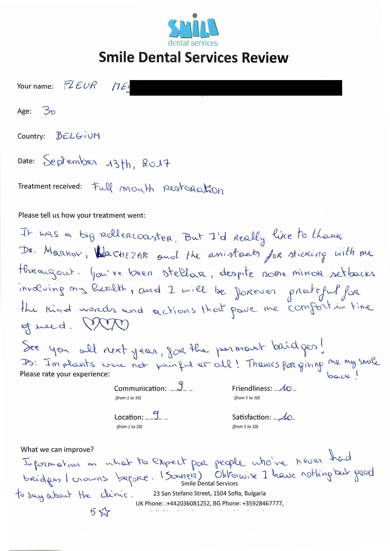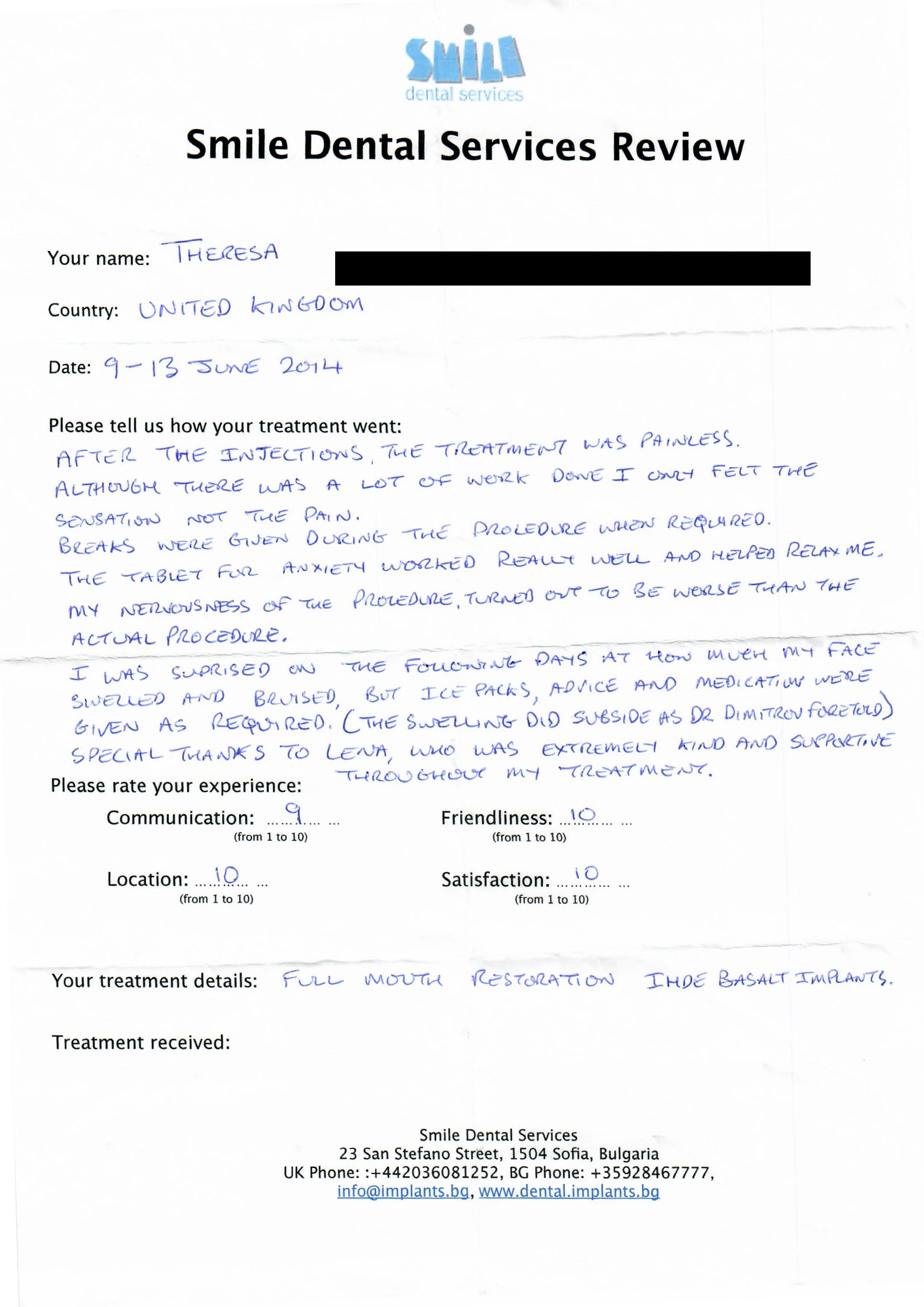 From booking my treatment till now the whole experience has been great. I suffered with poor teeth since I was a kid, dentists in the UK didn't offer much help or trust. Loads of people asked my why I was going to Bulgaria for treatment, I guess the result and the smooth handling of my case by yourself and your team are why. Are there things you could improve, yes.