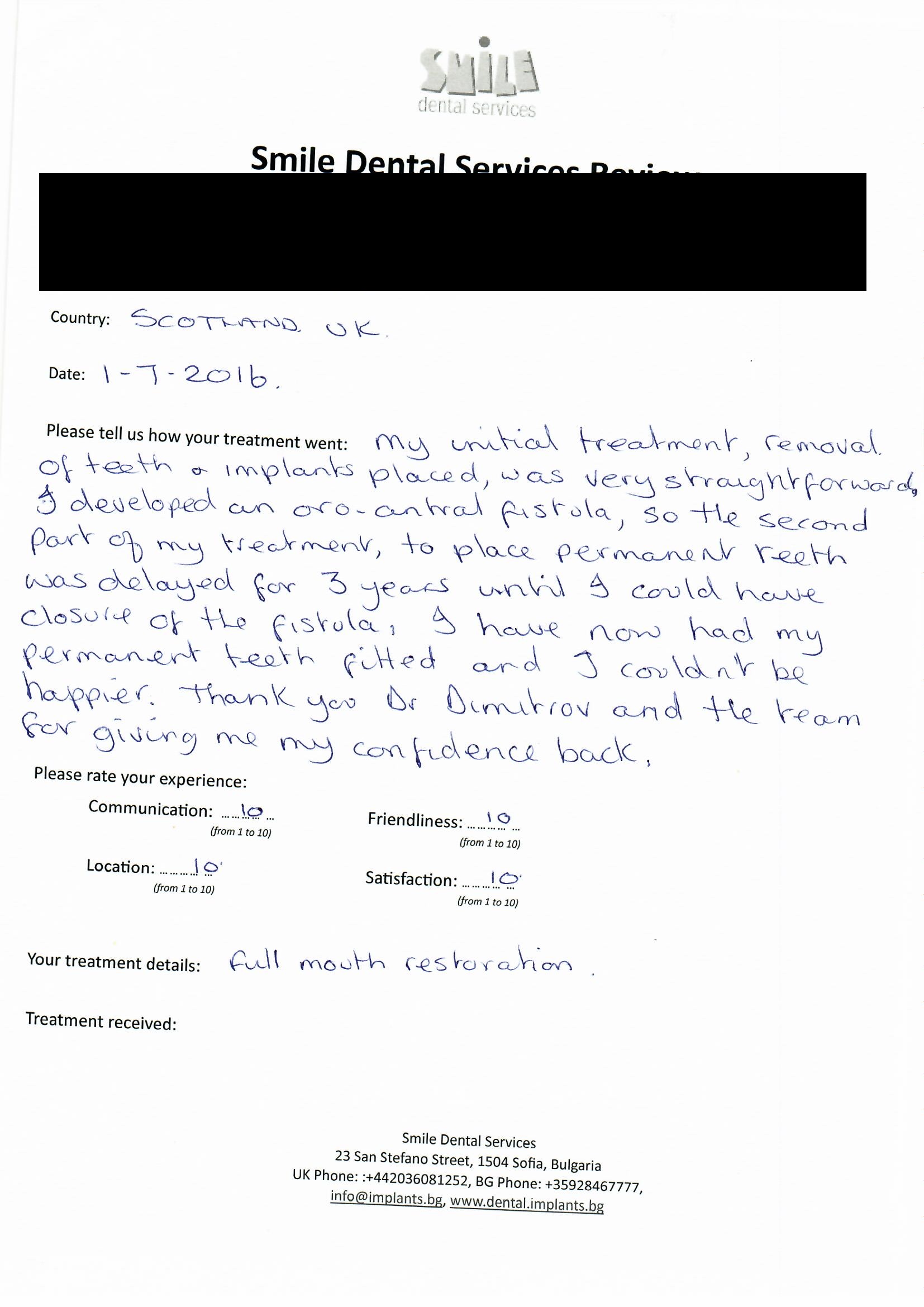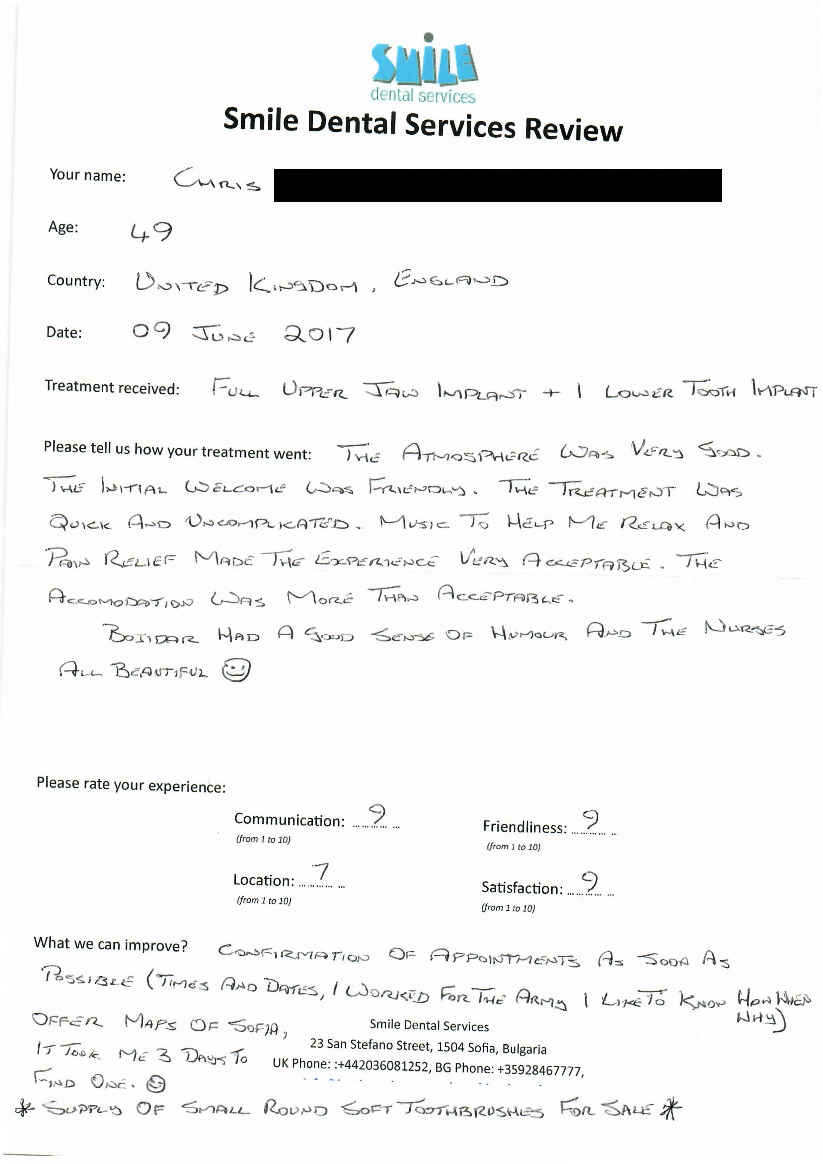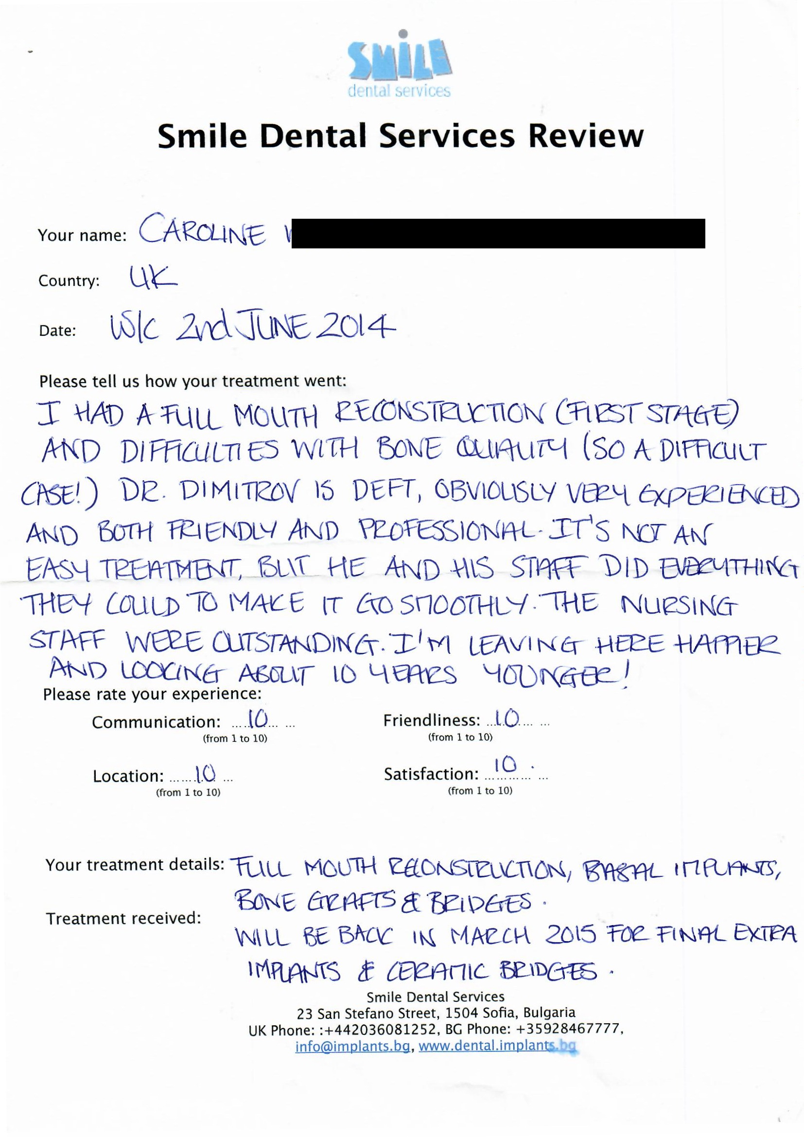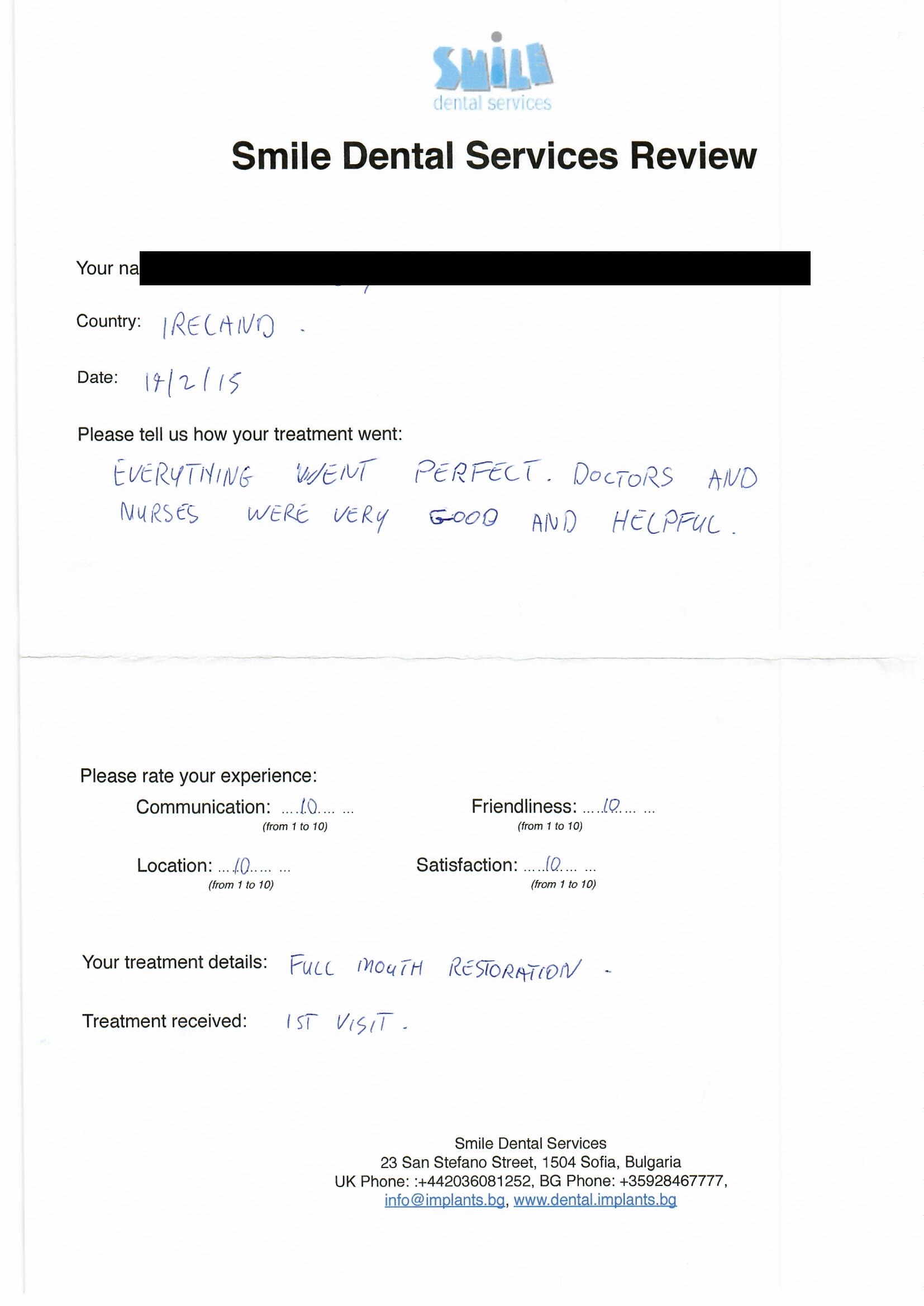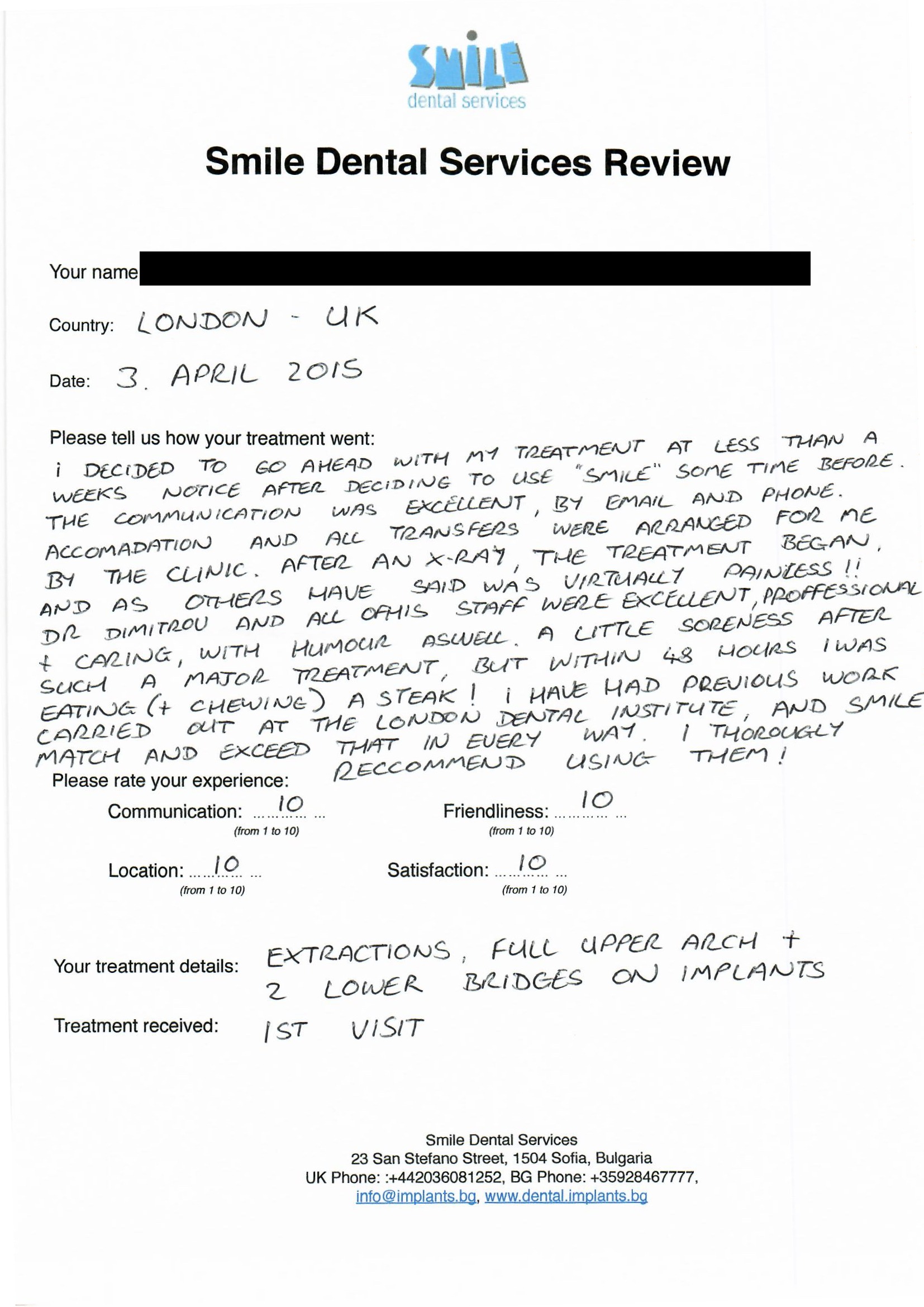 From booking my treatment till now the whole experience has been great. I suffered with poor teeth since I was a kid, dentists in the UK didn't offer much help or trust. Loads of people asked my why I was going to Bulgaria for treatment, I guess the result and the smooth handling of my case by yourself and your team are why. Are there things you could improve, yes.
