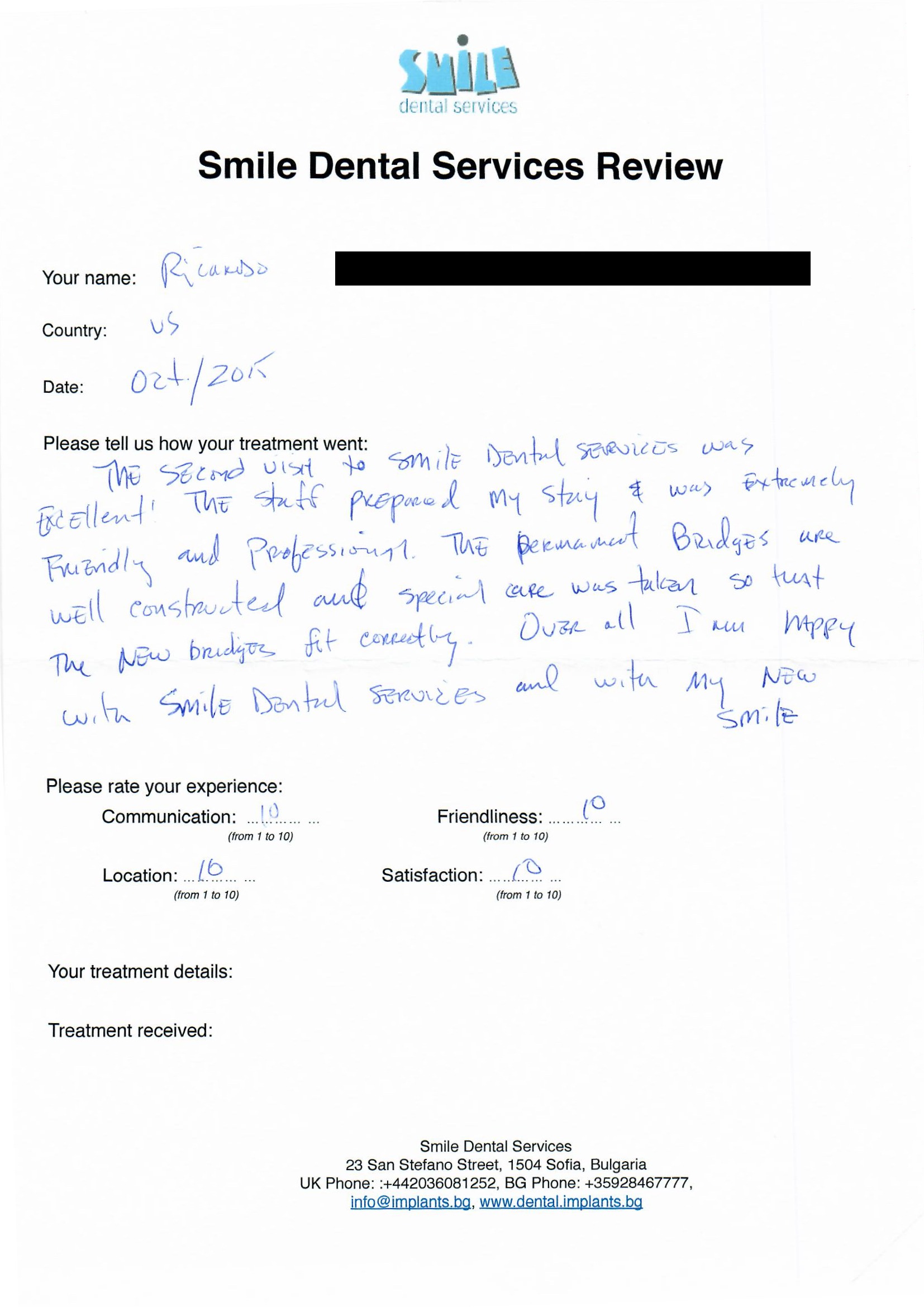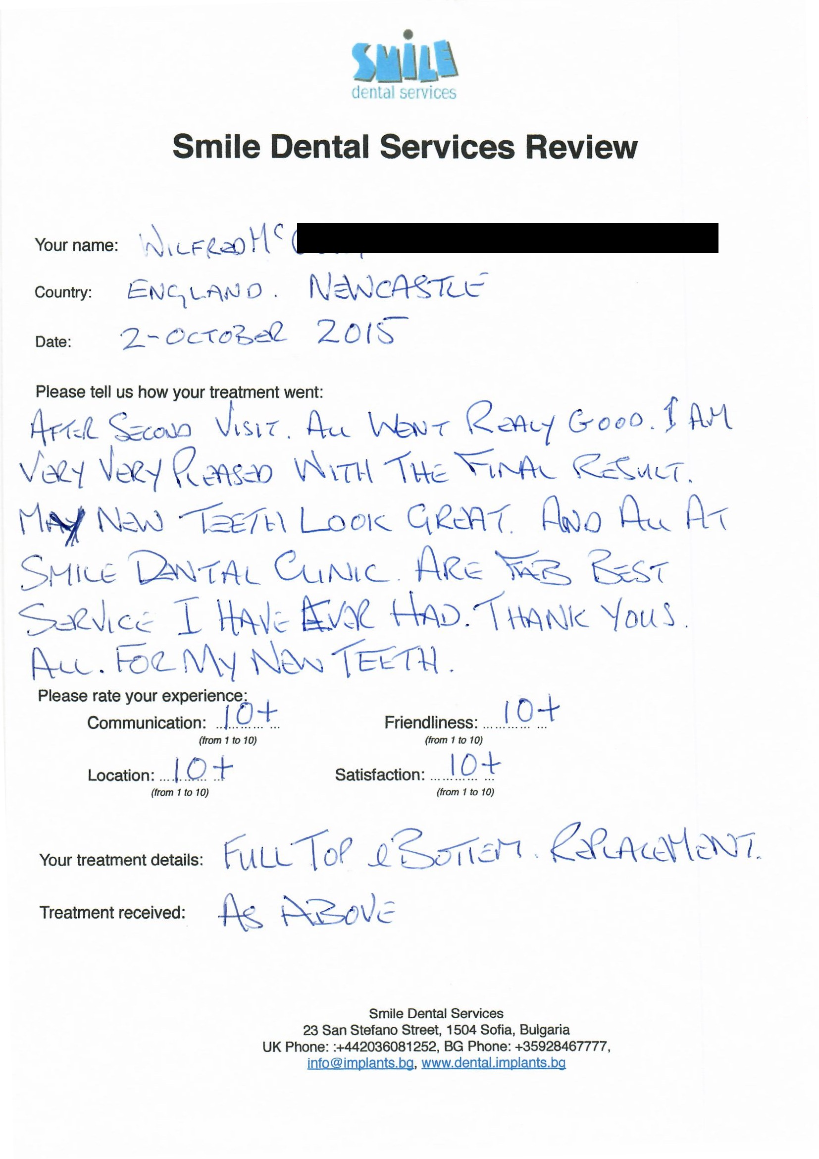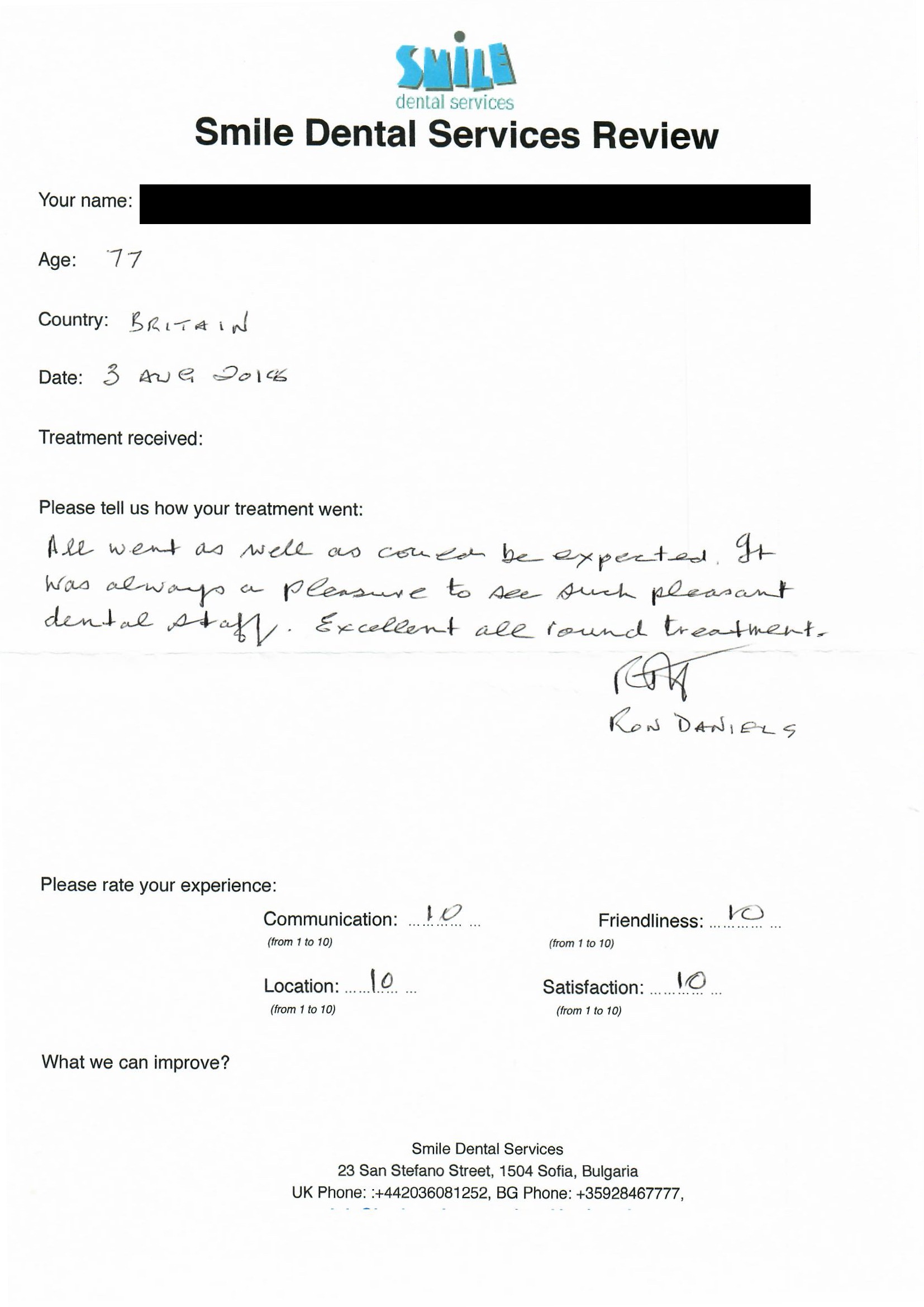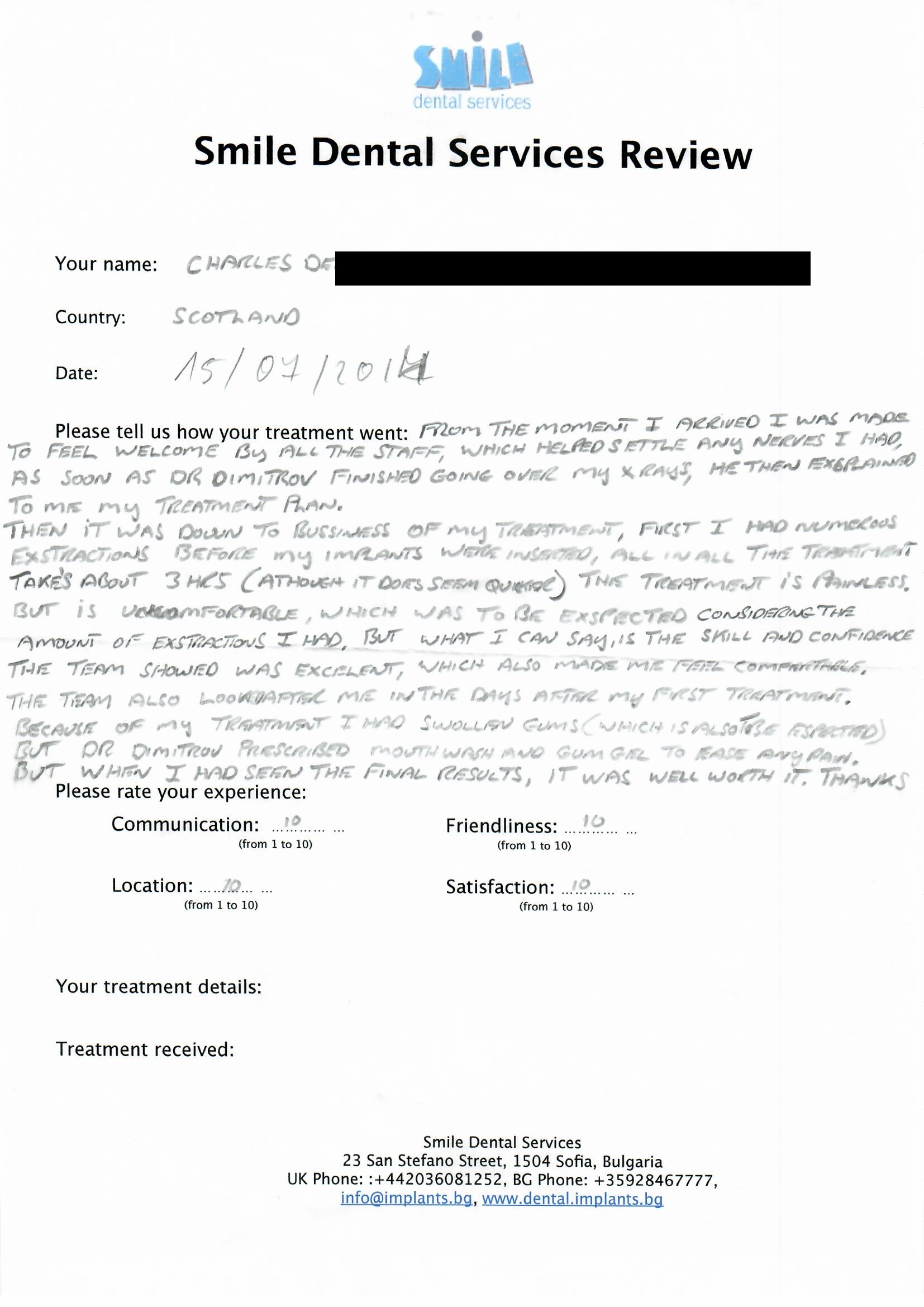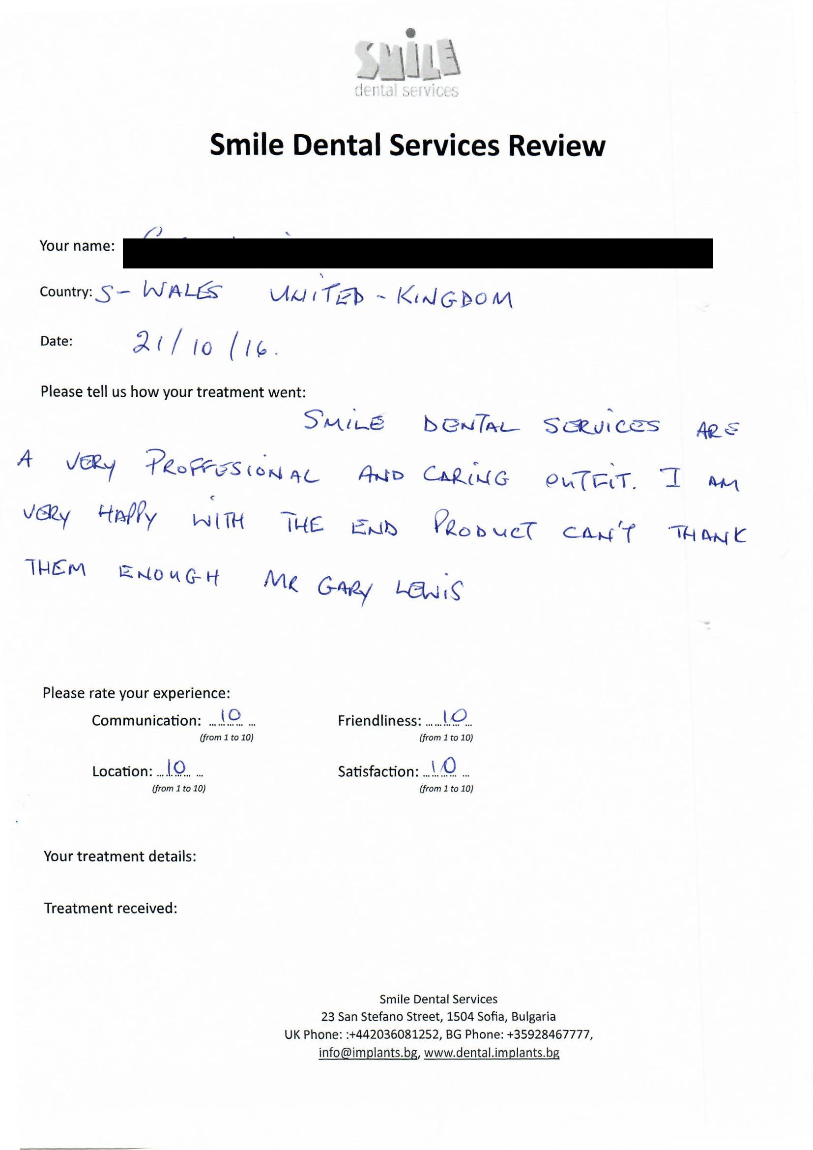 From booking my treatment till now the whole experience has been great. I suffered with poor teeth since I was a kid, dentists in the UK didn't offer much help or trust. Loads of people asked my why I was going to Bulgaria for treatment, I guess the result and the smooth handling of my case by yourself and your team are why. Are there things you could improve, yes.