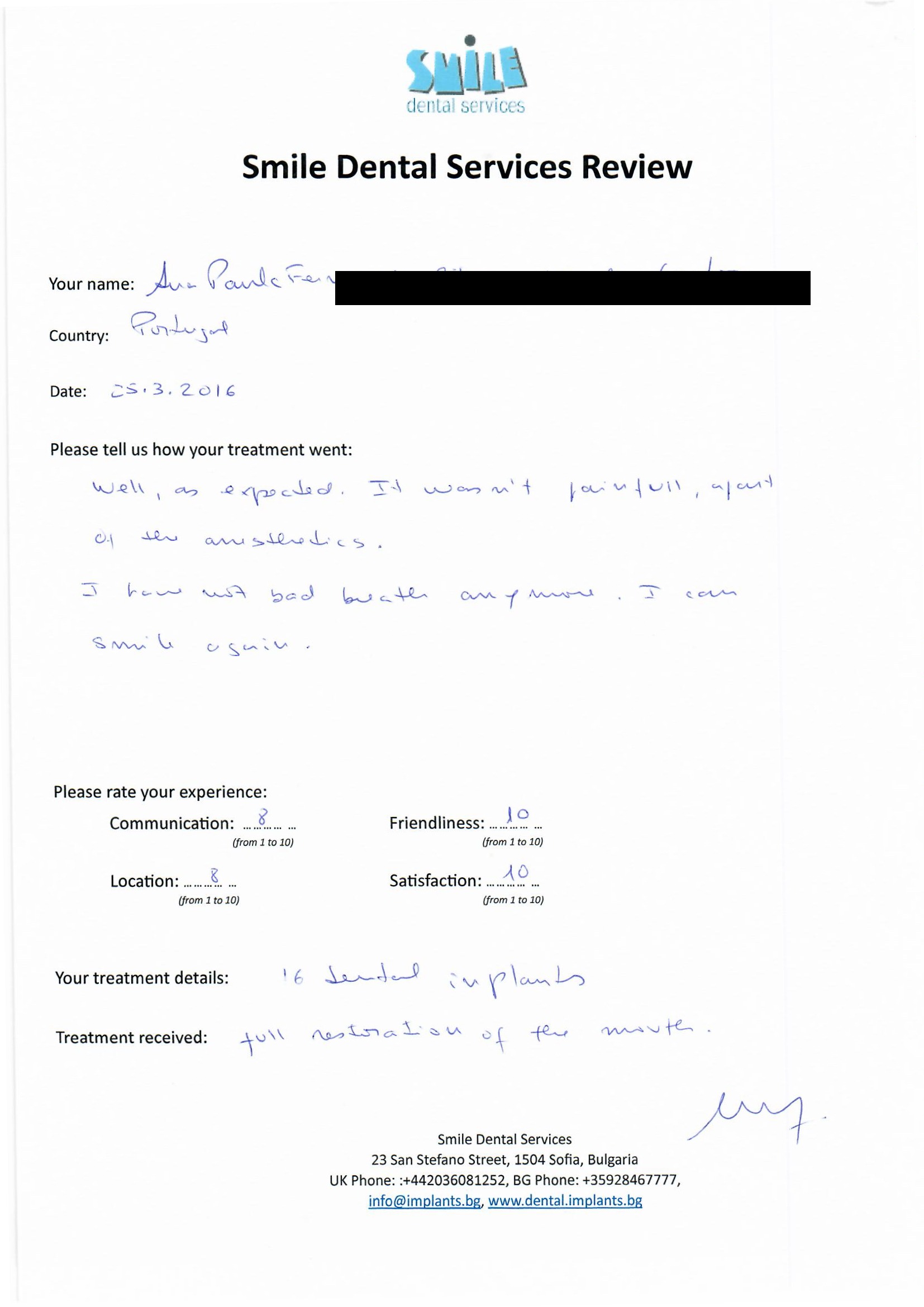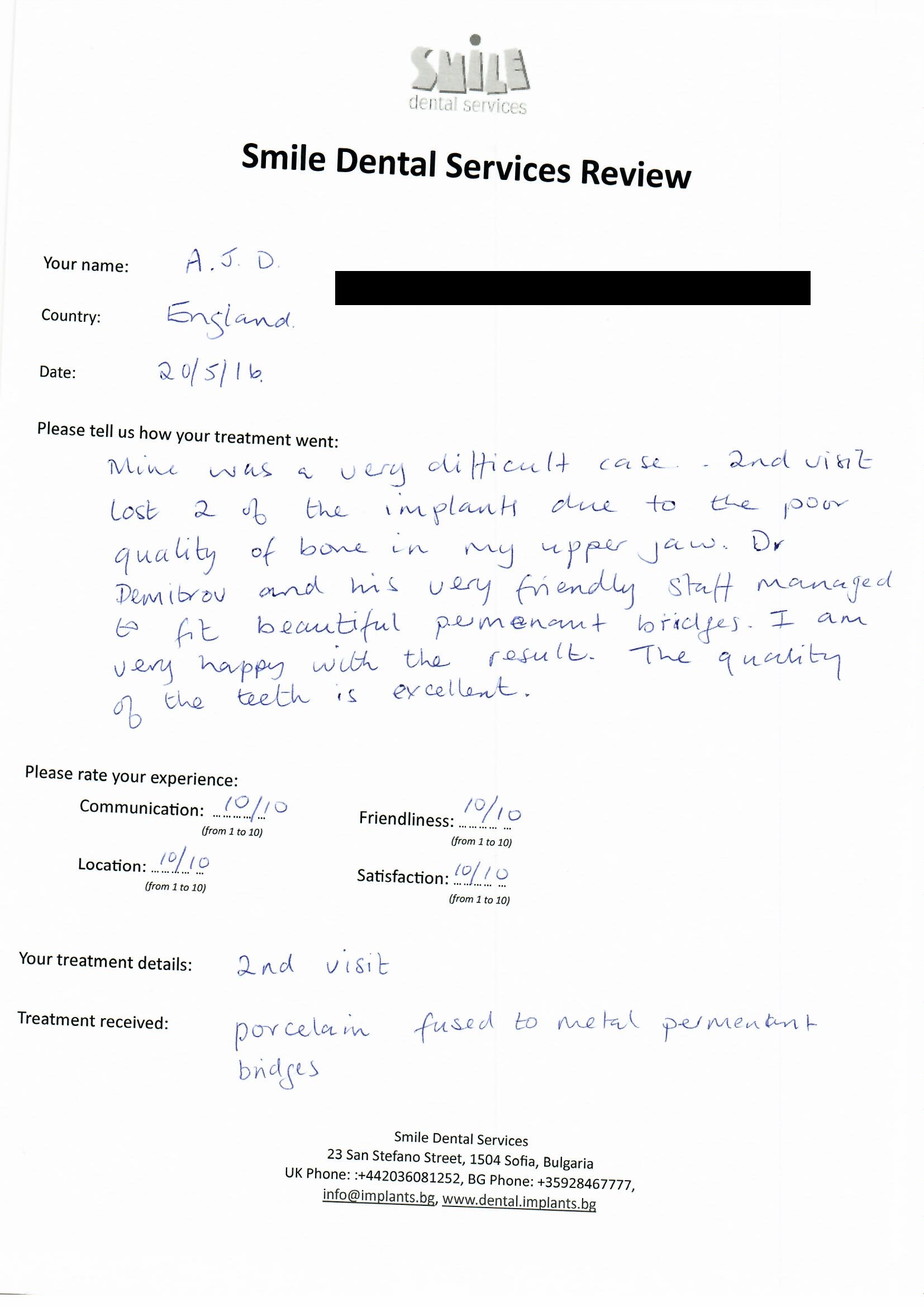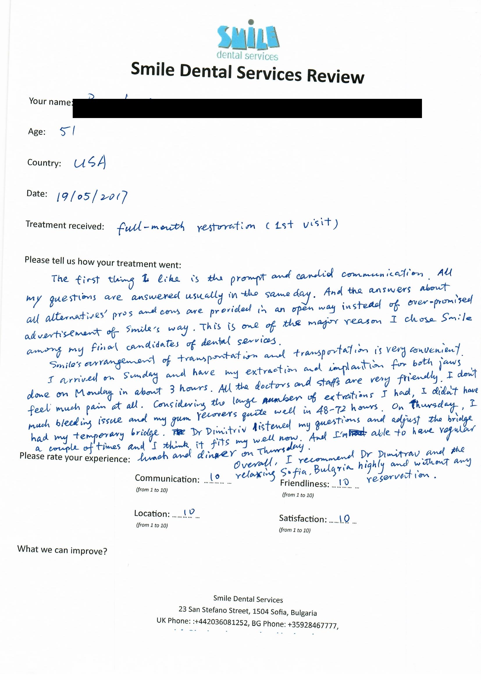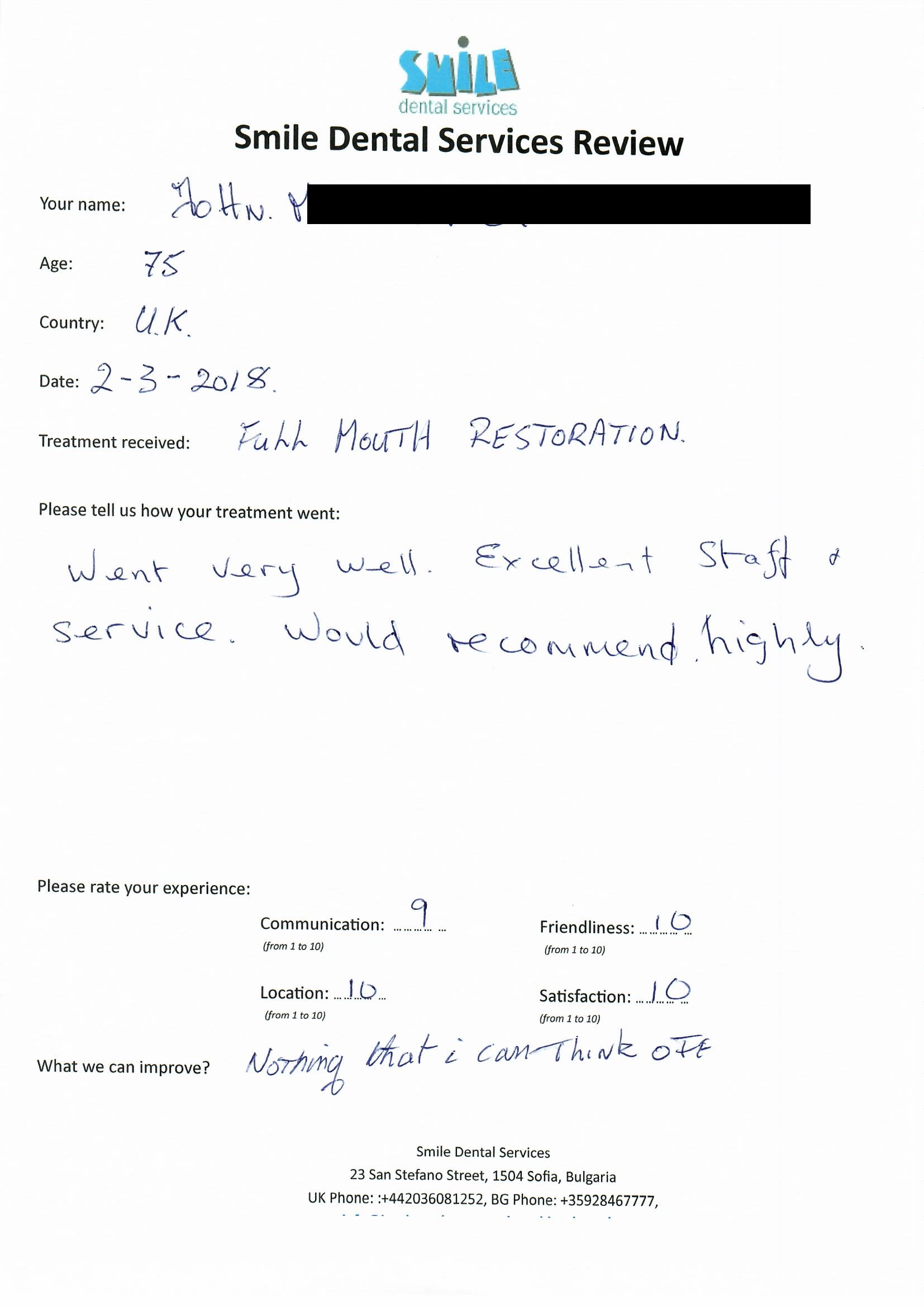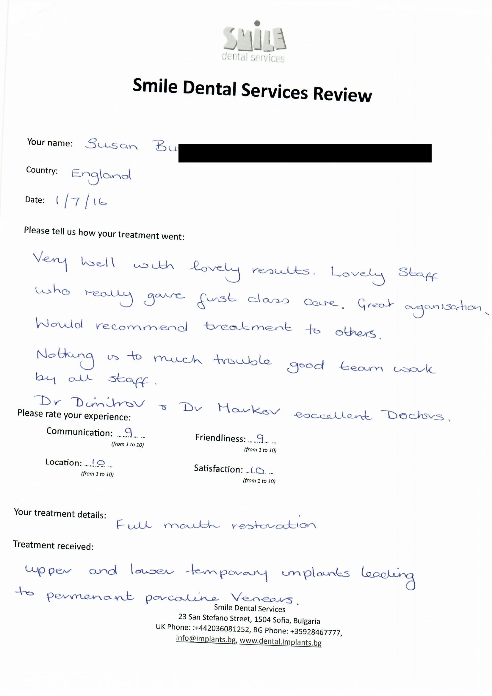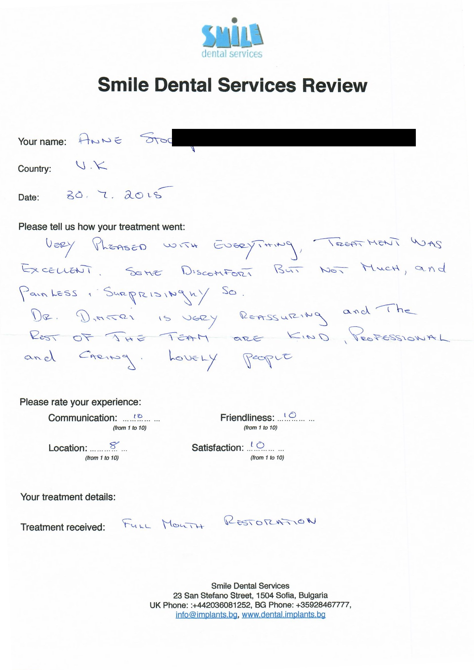 From booking my treatment till now the whole experience has been great. I suffered with poor teeth since I was a kid, dentists in the UK didn't offer much help or trust. Loads of people asked my why I was going to Bulgaria for treatment, I guess the result and the smooth handling of my case by yourself and your team are why. Are there things you could improve, yes.