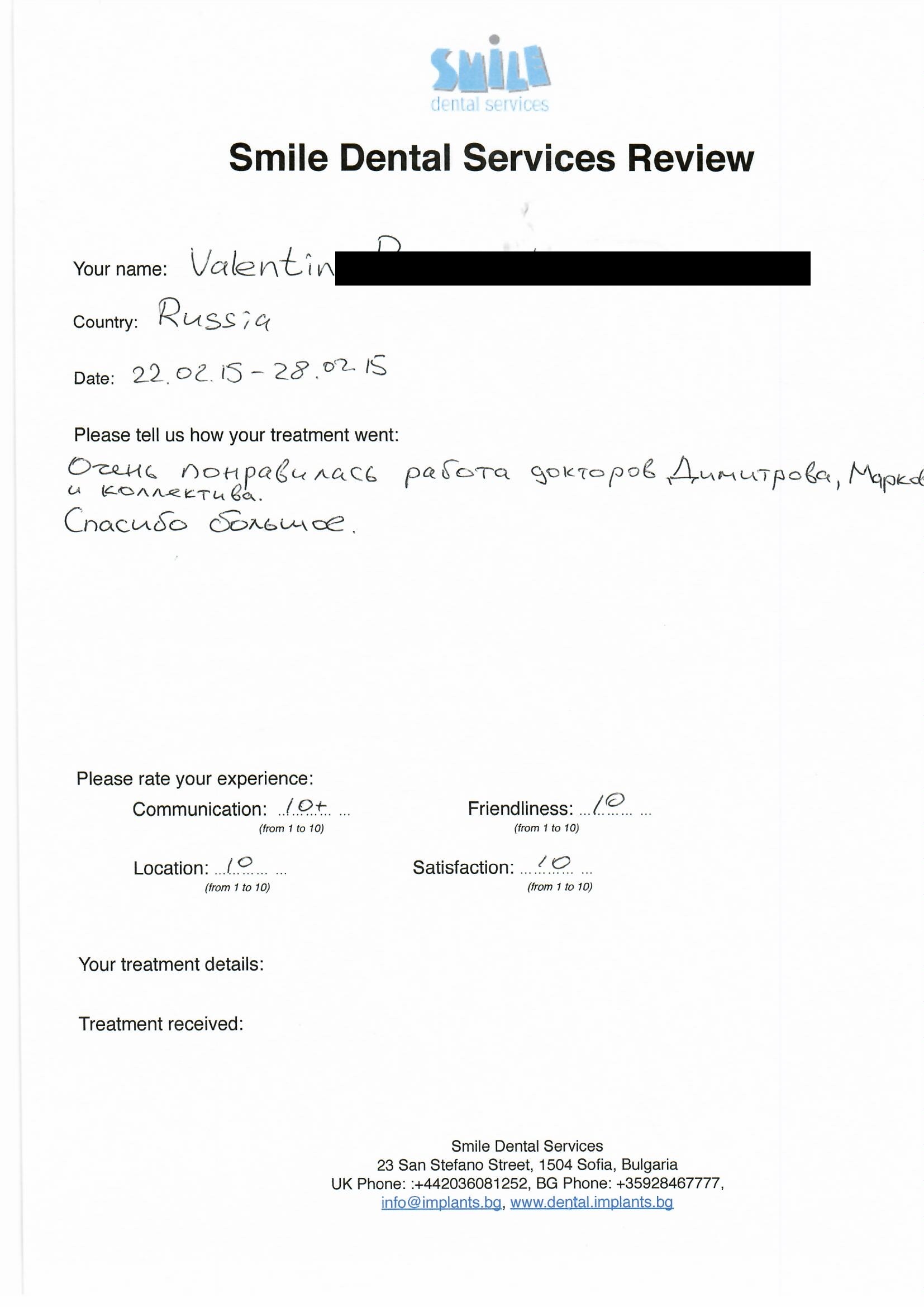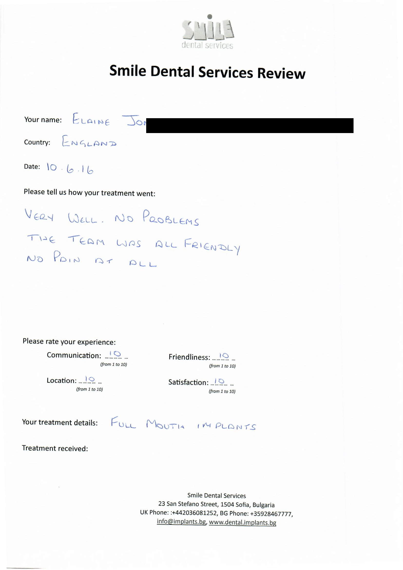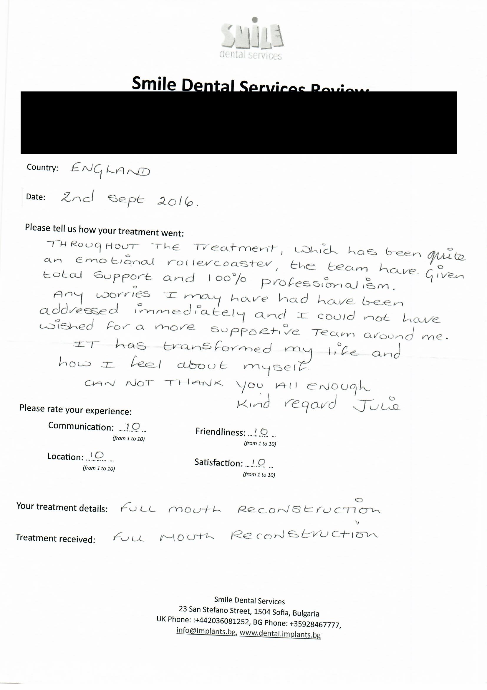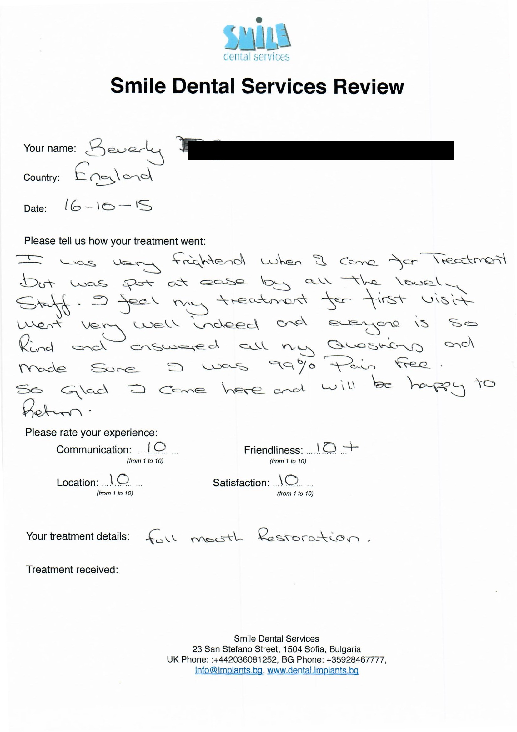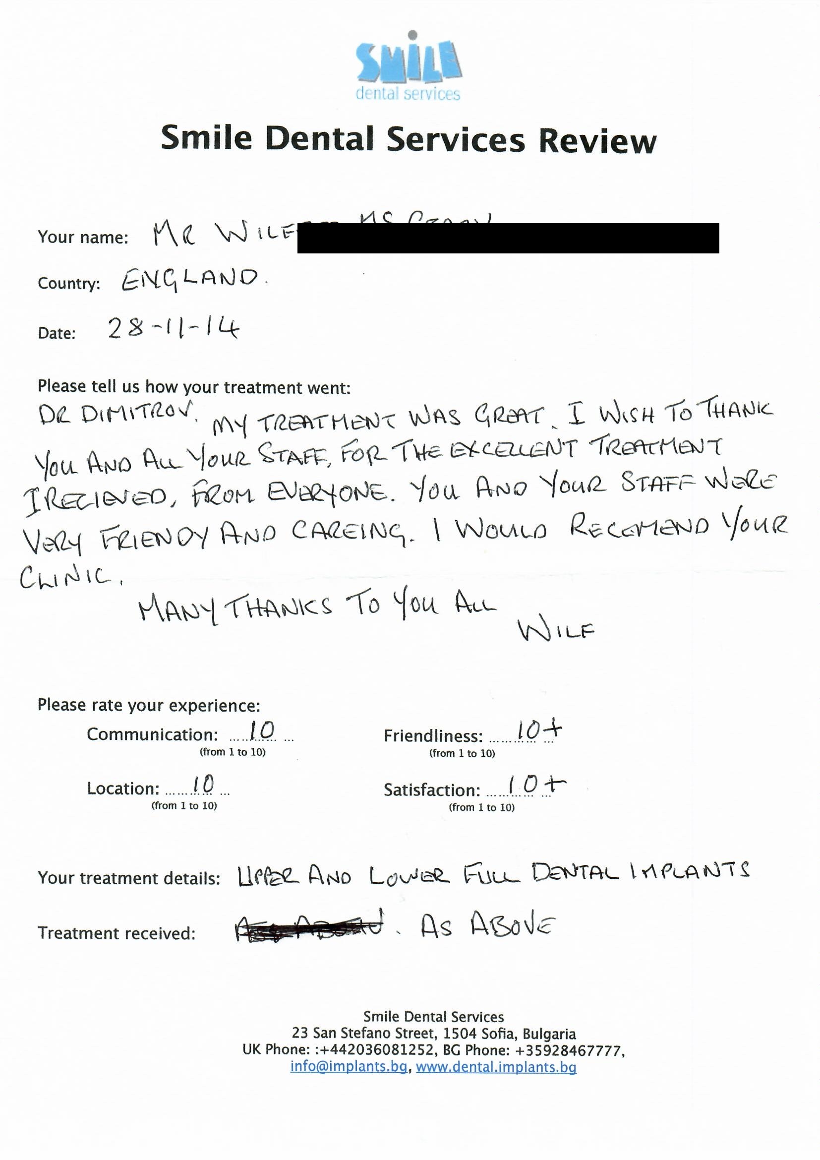 From booking my treatment till now the whole experience has been great. I suffered with poor teeth since I was a kid, dentists in the UK didn't offer much help or trust. Loads of people asked my why I was going to Bulgaria for treatment, I guess the result and the smooth handling of my case by yourself and your team are why. Are there things you could improve, yes.