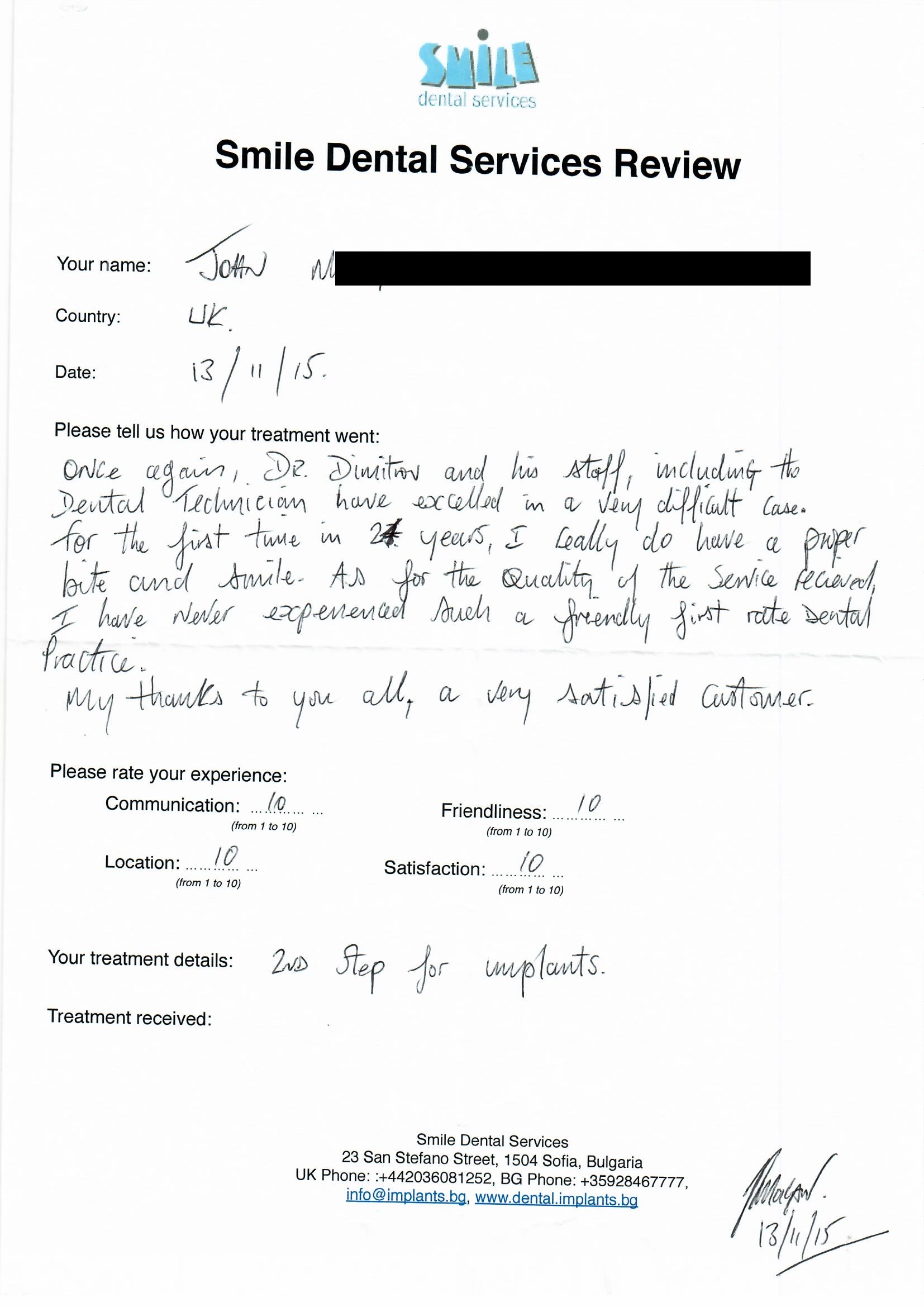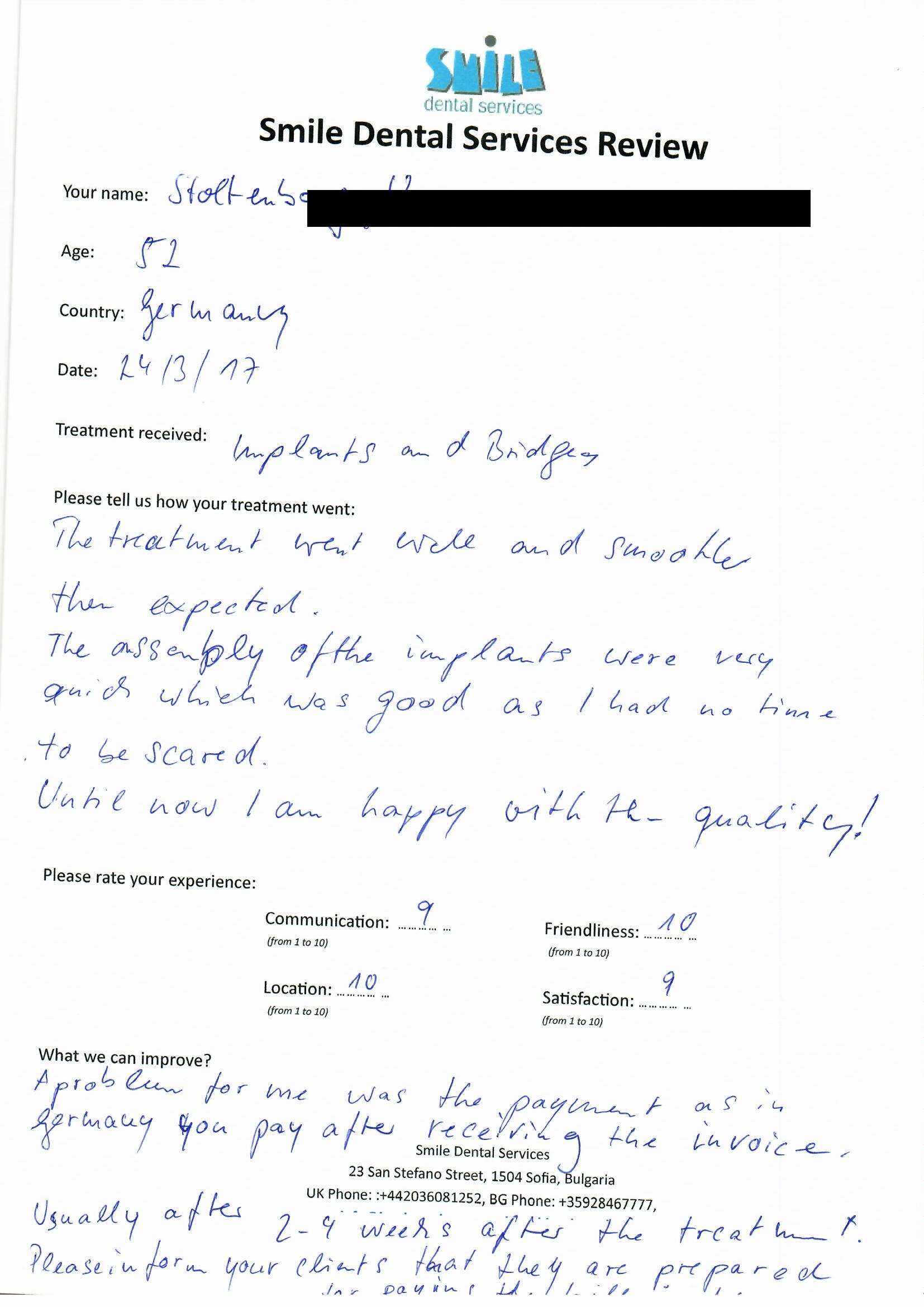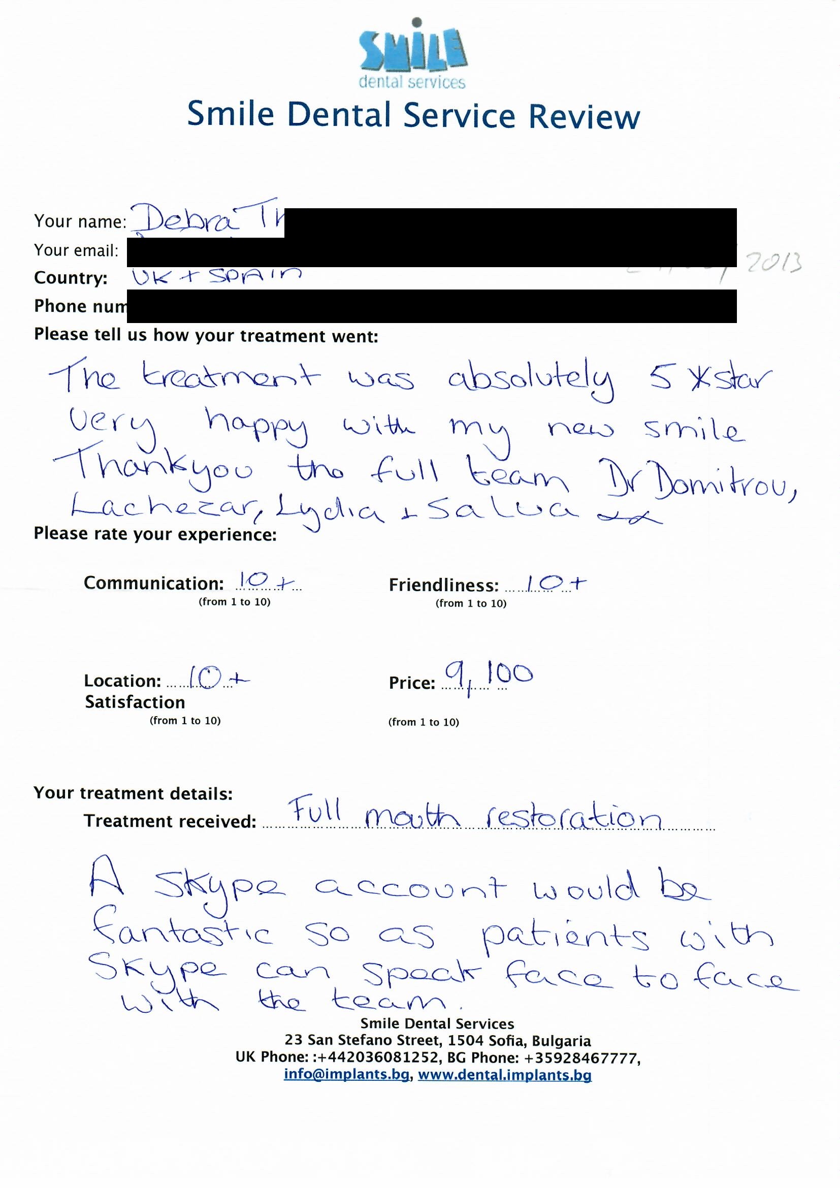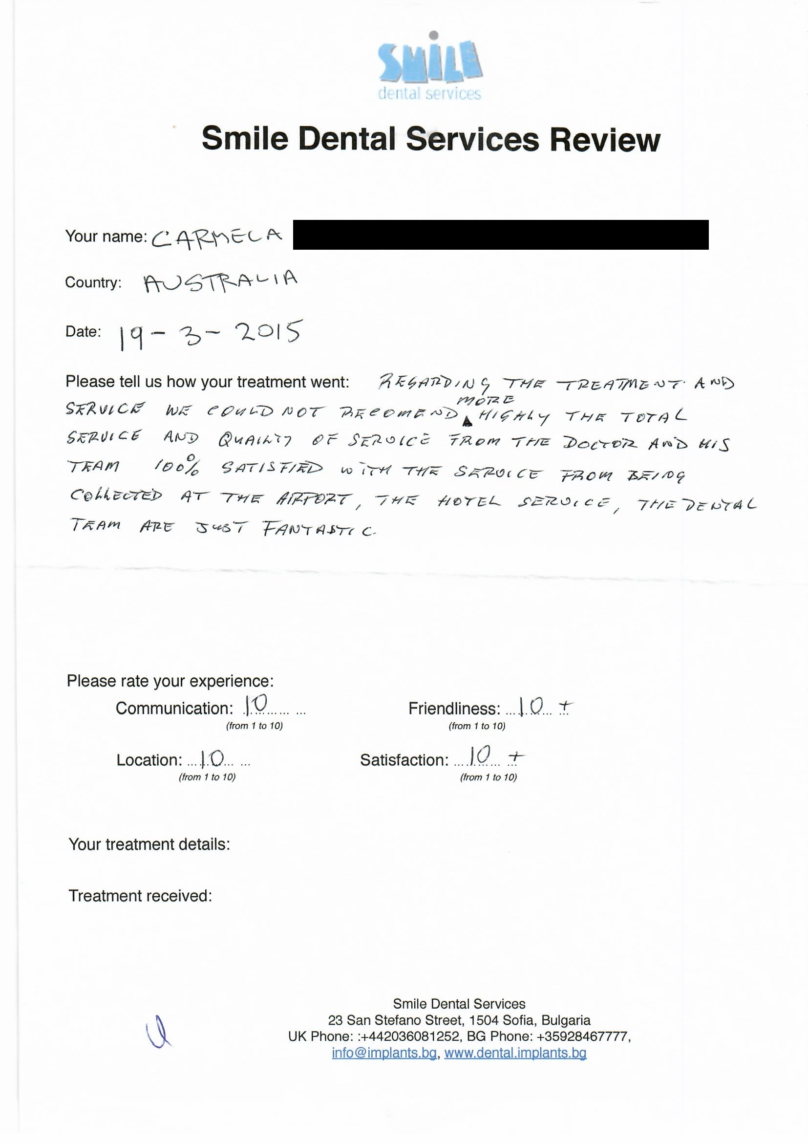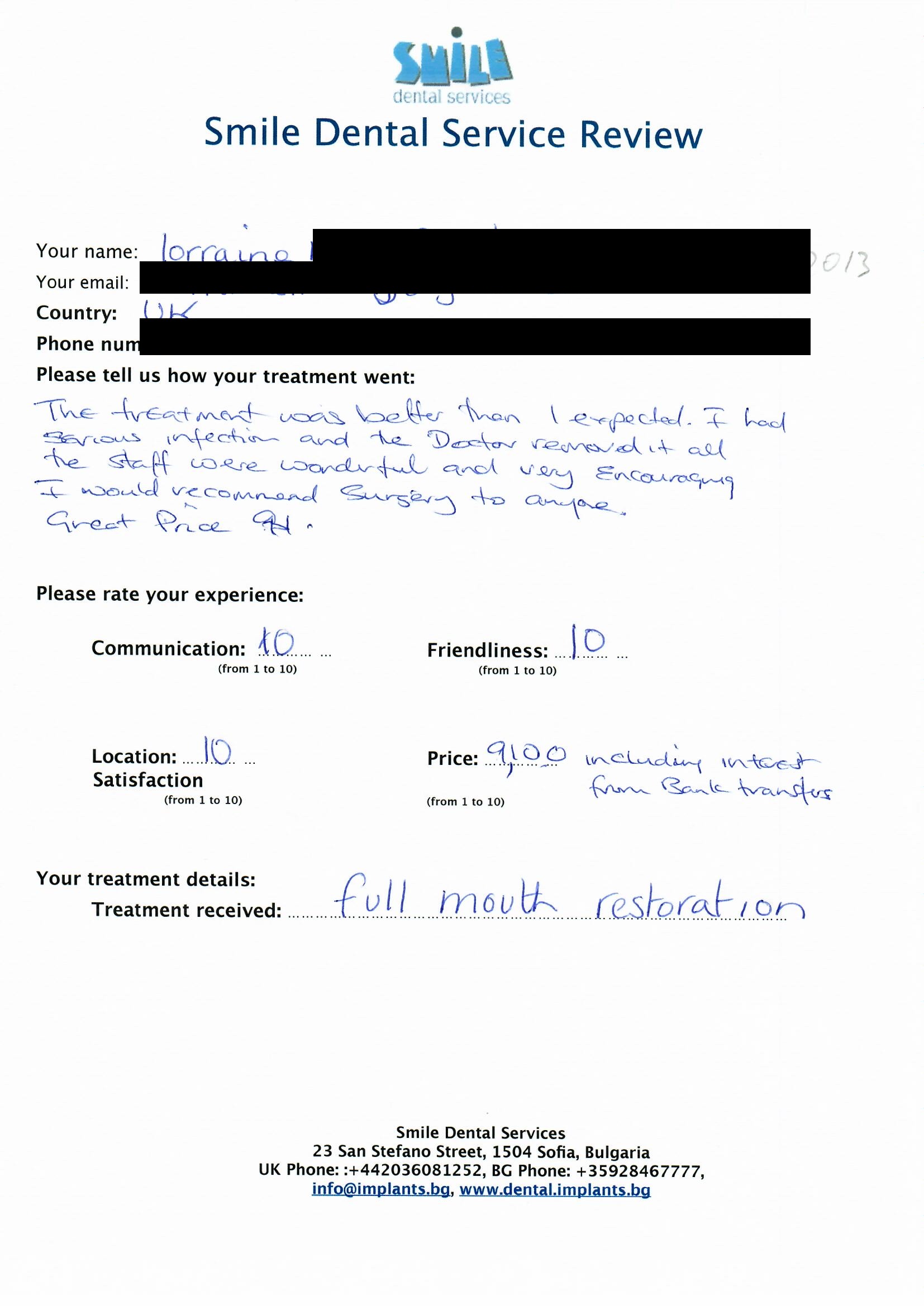 From booking my treatment till now the whole experience has been great. I suffered with poor teeth since I was a kid, dentists in the UK didn't offer much help or trust. Loads of people asked my why I was going to Bulgaria for treatment, I guess the result and the smooth handling of my case by yourself and your team are why. Are there things you could improve, yes.