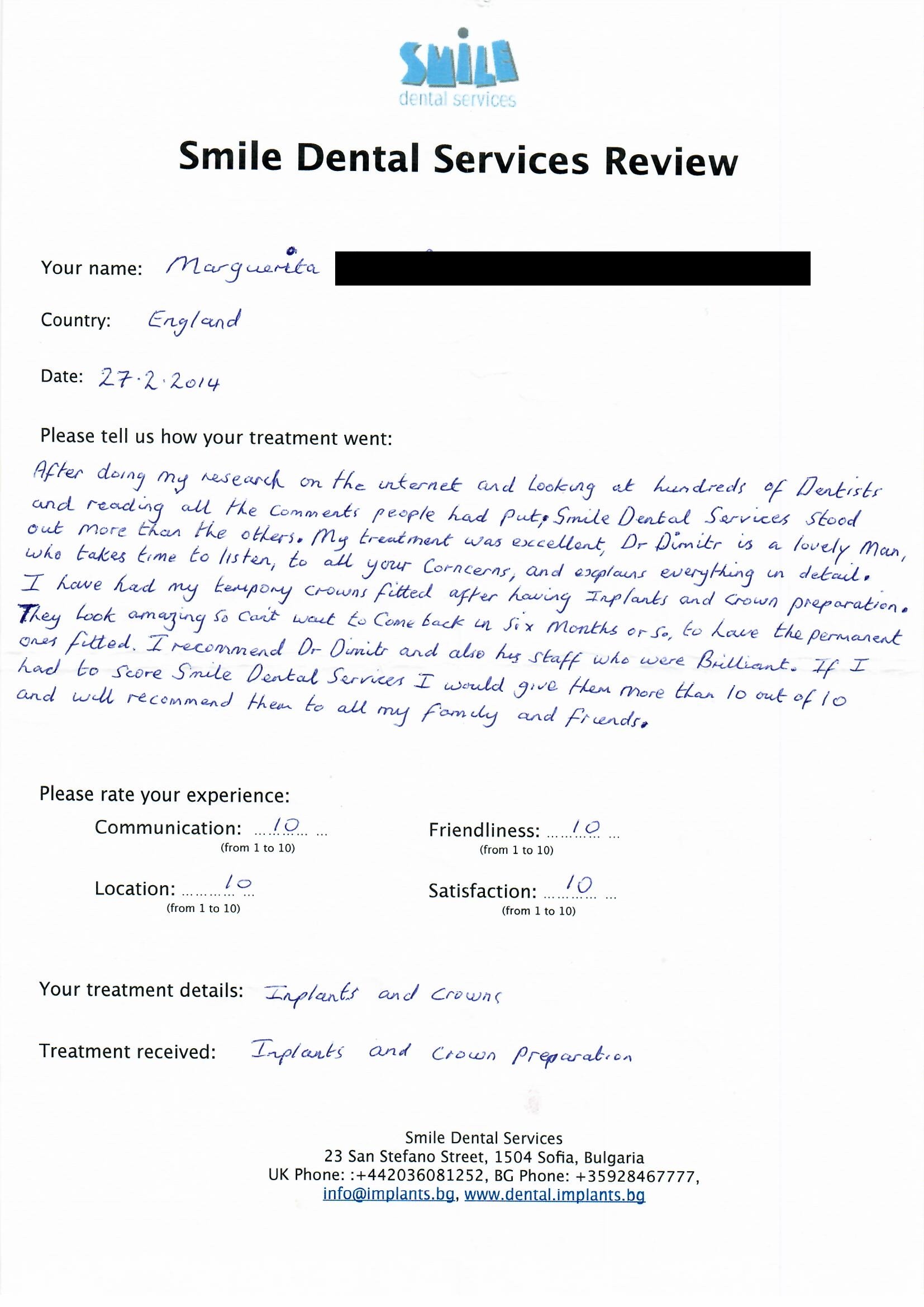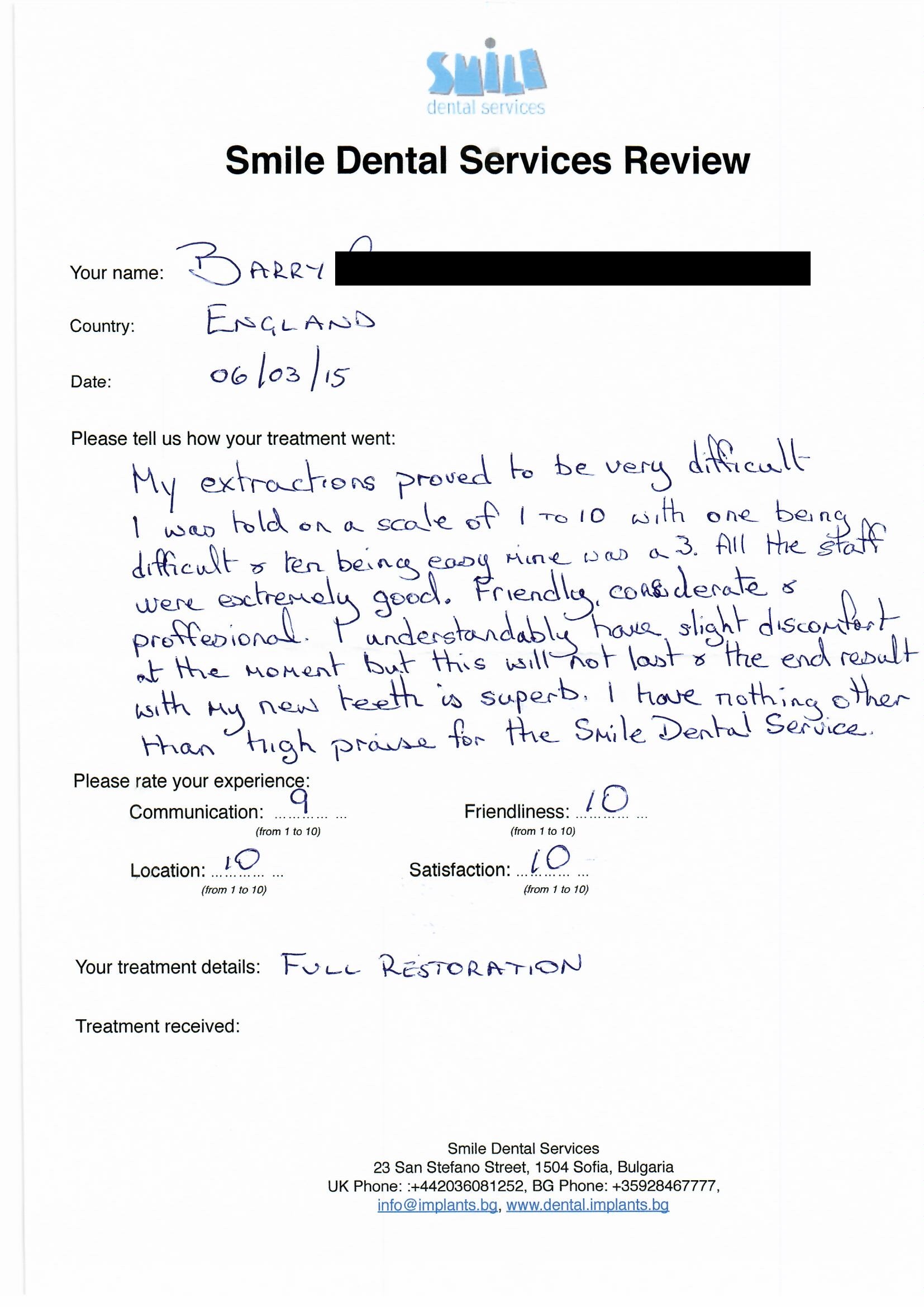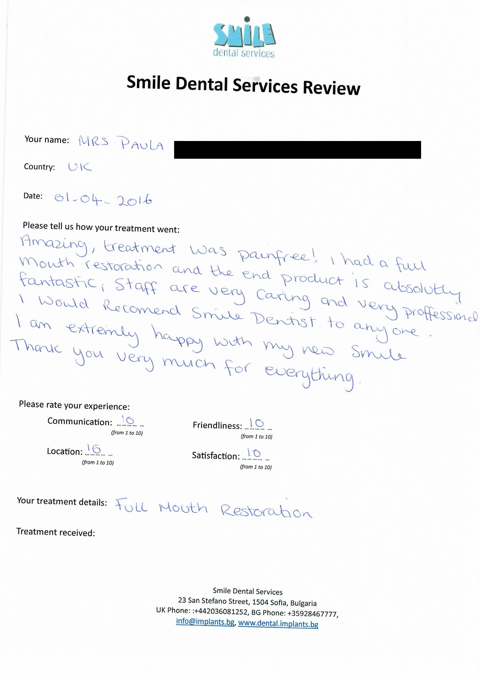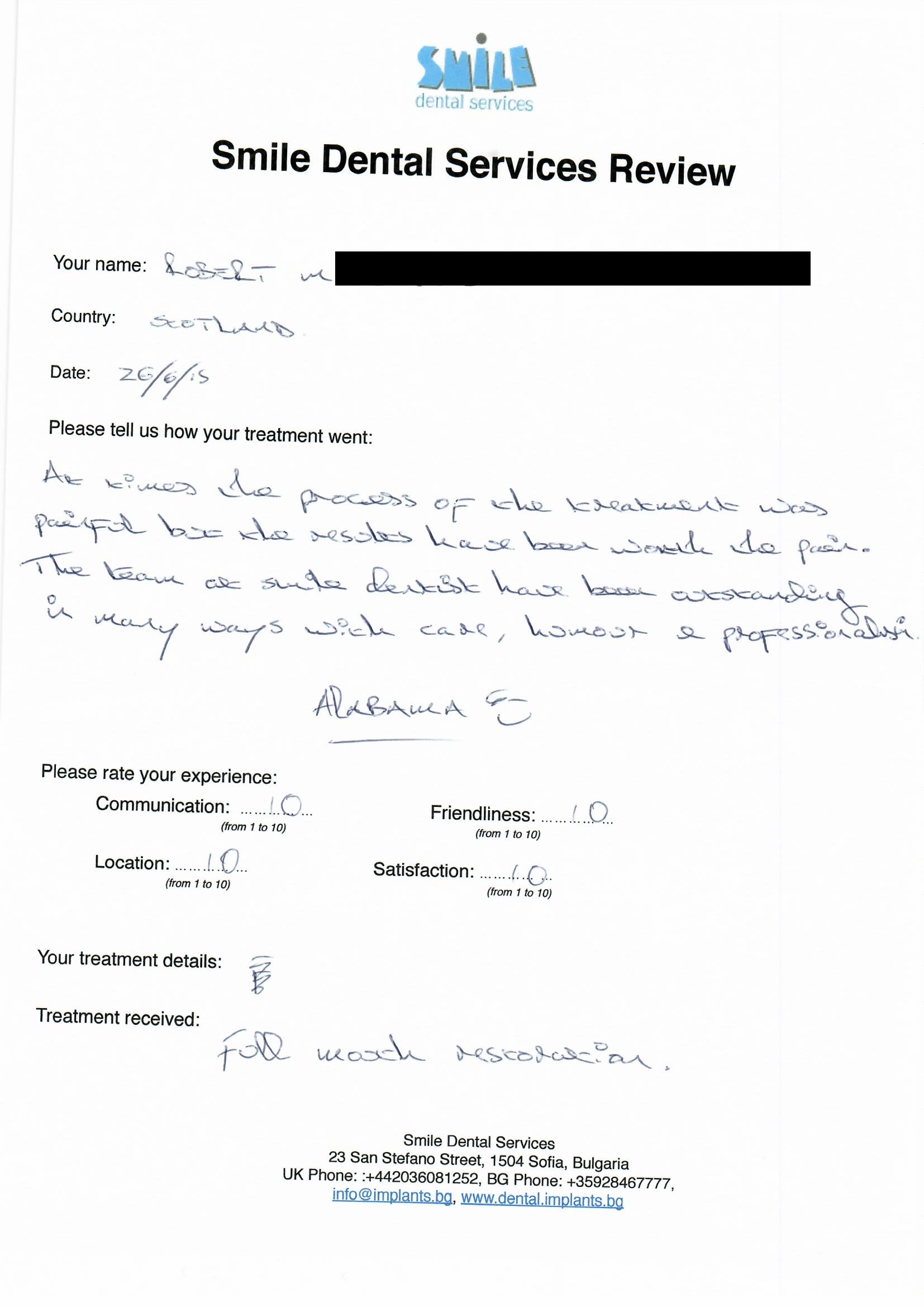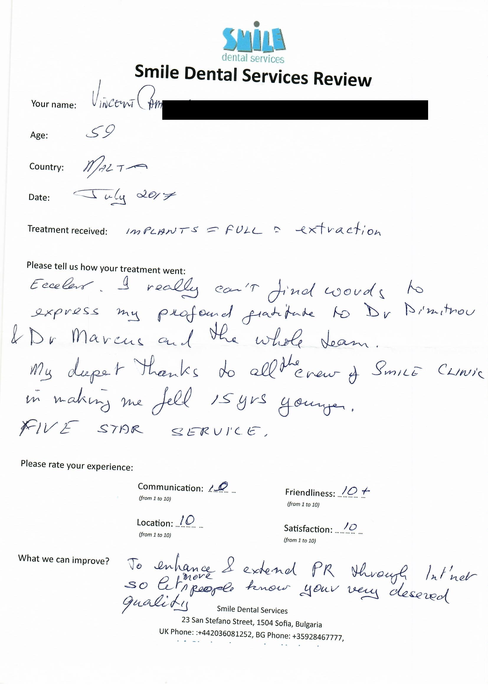 From booking my treatment till now the whole experience has been great. I suffered with poor teeth since I was a kid, dentists in the UK didn't offer much help or trust. Loads of people asked my why I was going to Bulgaria for treatment, I guess the result and the smooth handling of my case by yourself and your team are why. Are there things you could improve, yes.