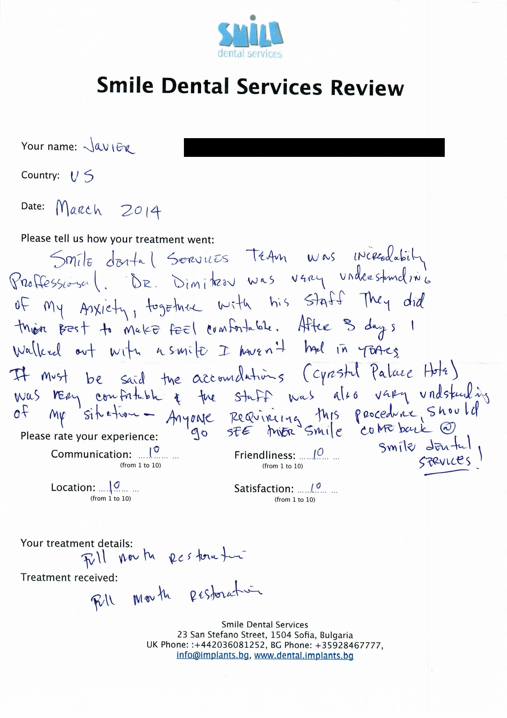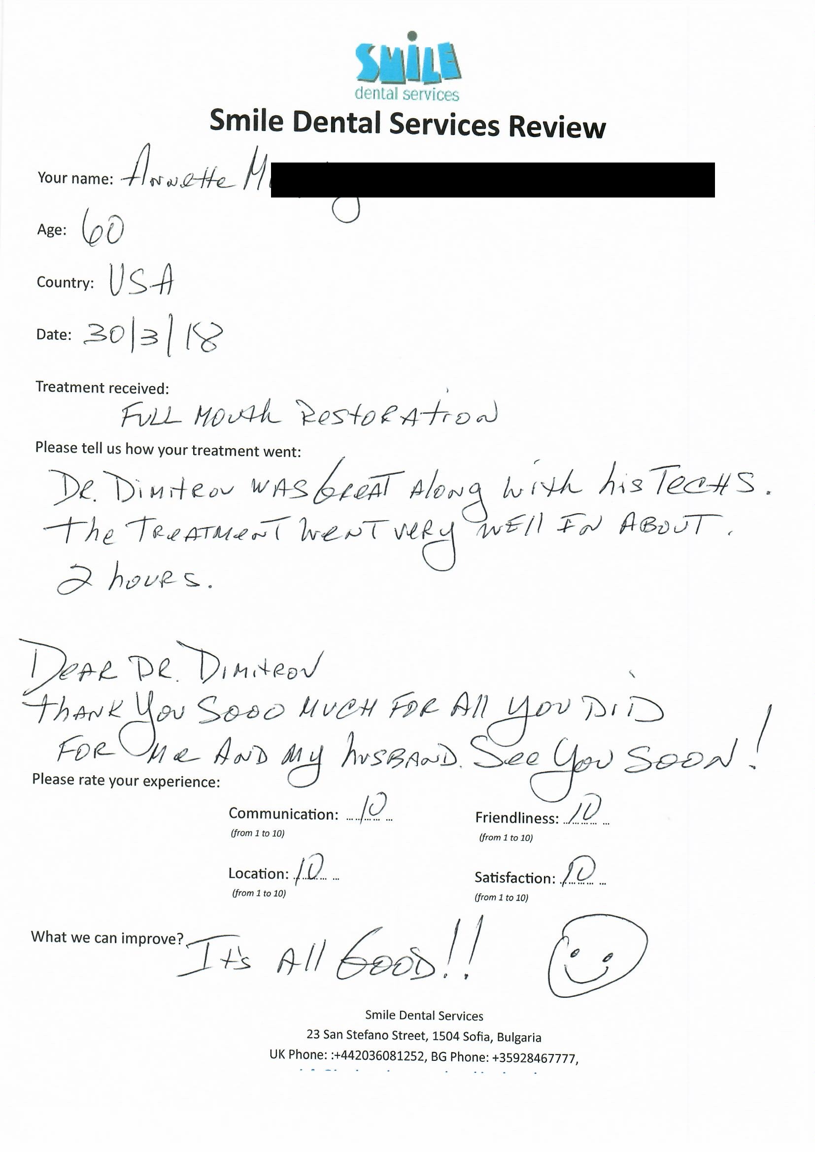 Smile Dental Services Team was incredibly proffesional. Dr. Dimitrov was very understanding of my anxiety, together with his staff. They did their best to make feel comfortable. After 3 days I walked out with a smile I haven't had in years. If must be said the accommodations (Crystal Palace Hotel) was very comfortable & the staff was also very understanding of my situation. Anyone requiring this procedure, should do it. My smile come back @