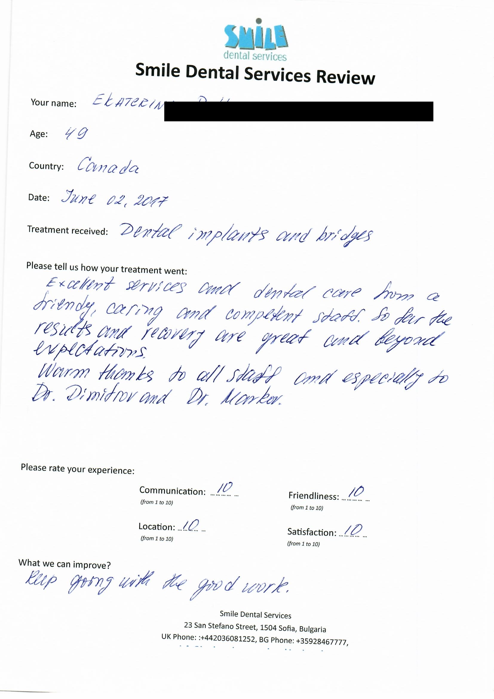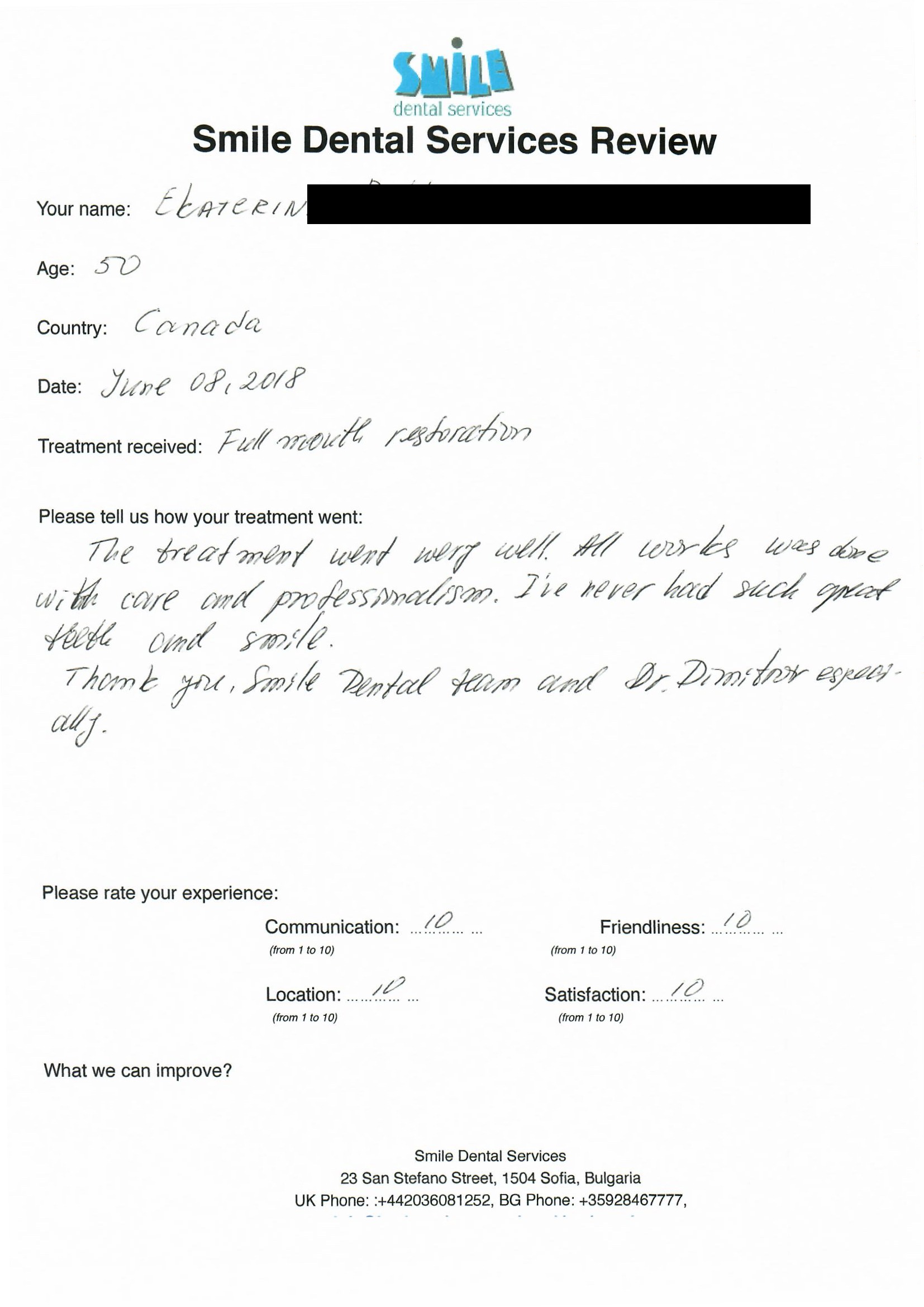 The treatment went very well. All work was done with care and professionalism. I've never had such great teeth and smile. Thank you, Smile Dental Services team and Dr. Dimitrov especially.