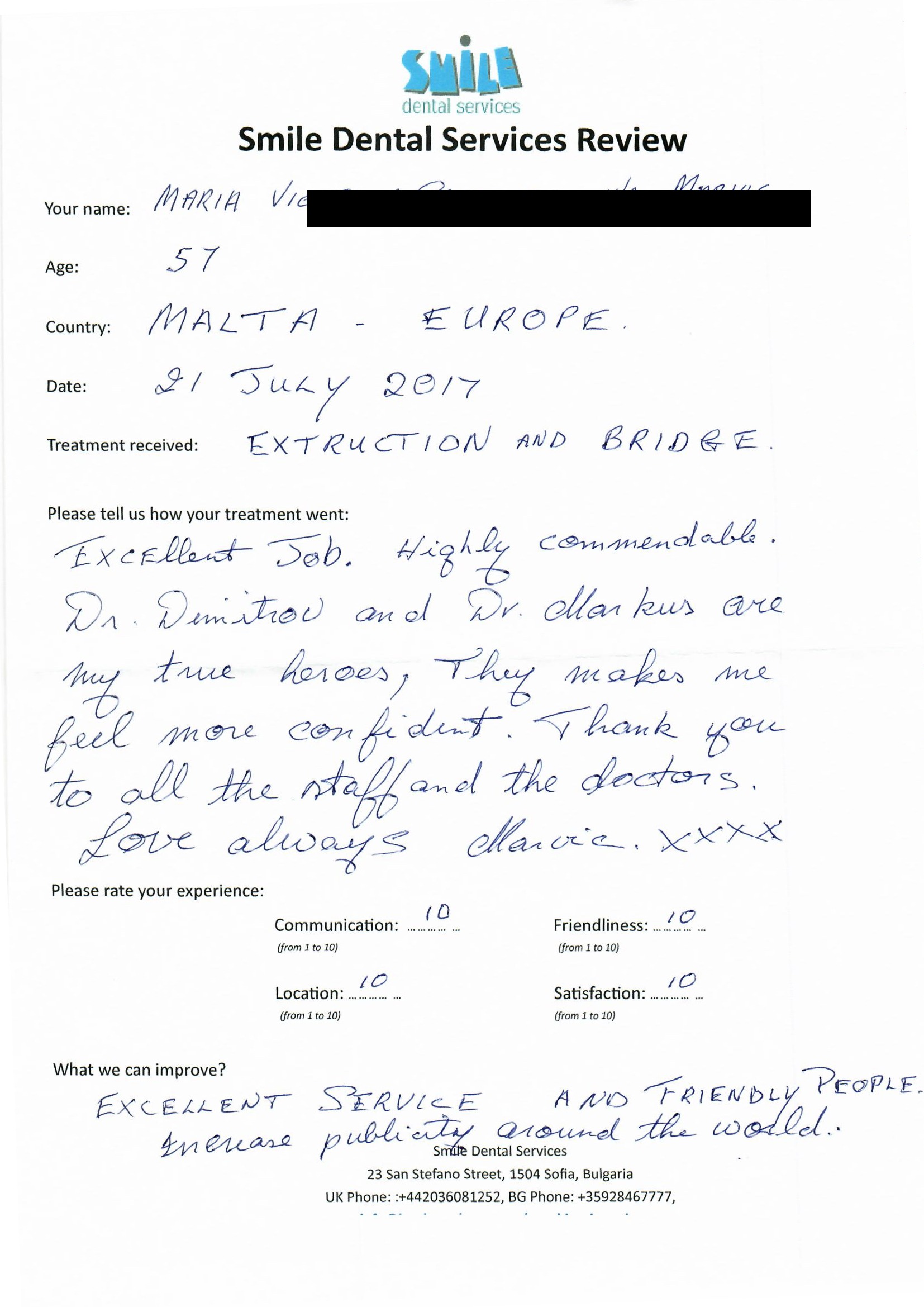 Excellent job! Highly commendable. Dr. Dimitrov and Dr. Markov are my time heroes. They made me feel more confident. Thank you to all the staff and the doctors! Love always, Maria Xxx