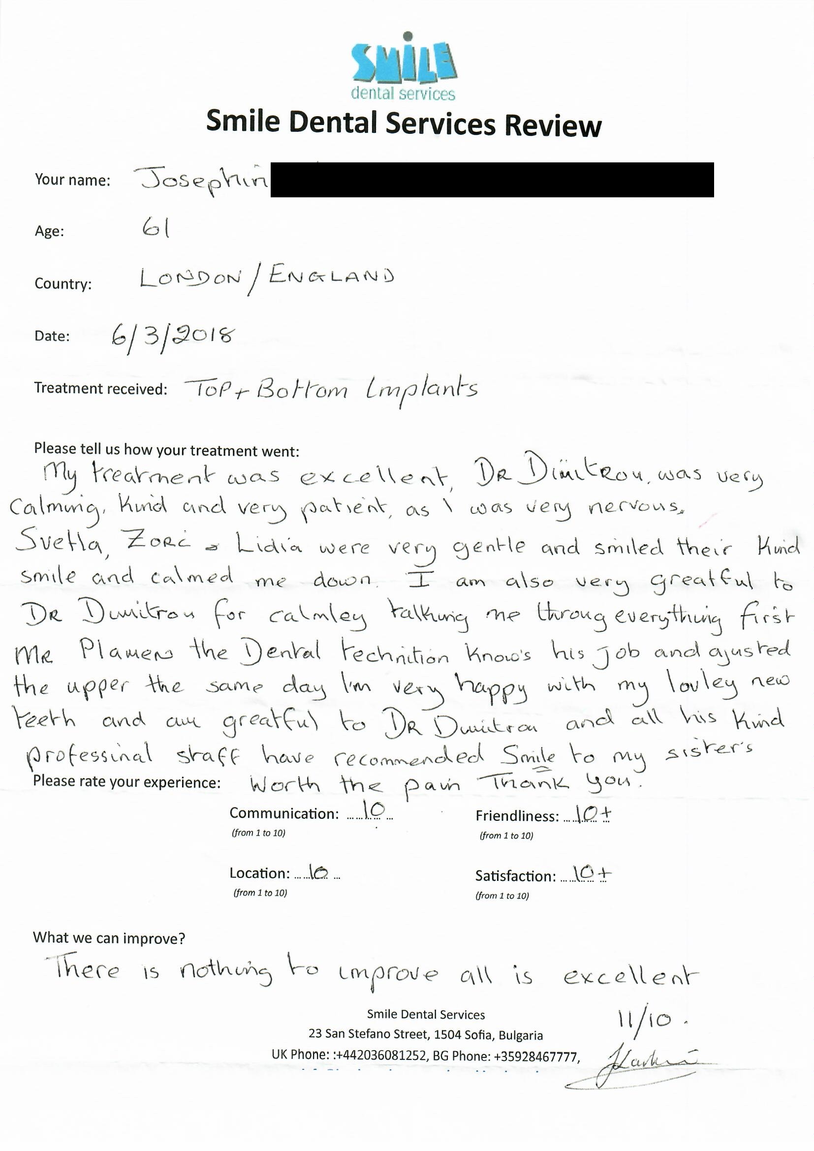 After doing my research on the internet and looking at hundreds of dentists and reading all the comments people had put, Smile Dental Services stood out more than the others. My treatment was excellent, Dr. Dimitrov is a lovely man, who takes time to listen, to all your concerns and explains everything in detail. I have had my temporary crowns fitter after having implants and crow preparation. They look amazing so can't wait to come back in six months or so to have the permanent ones fitter.