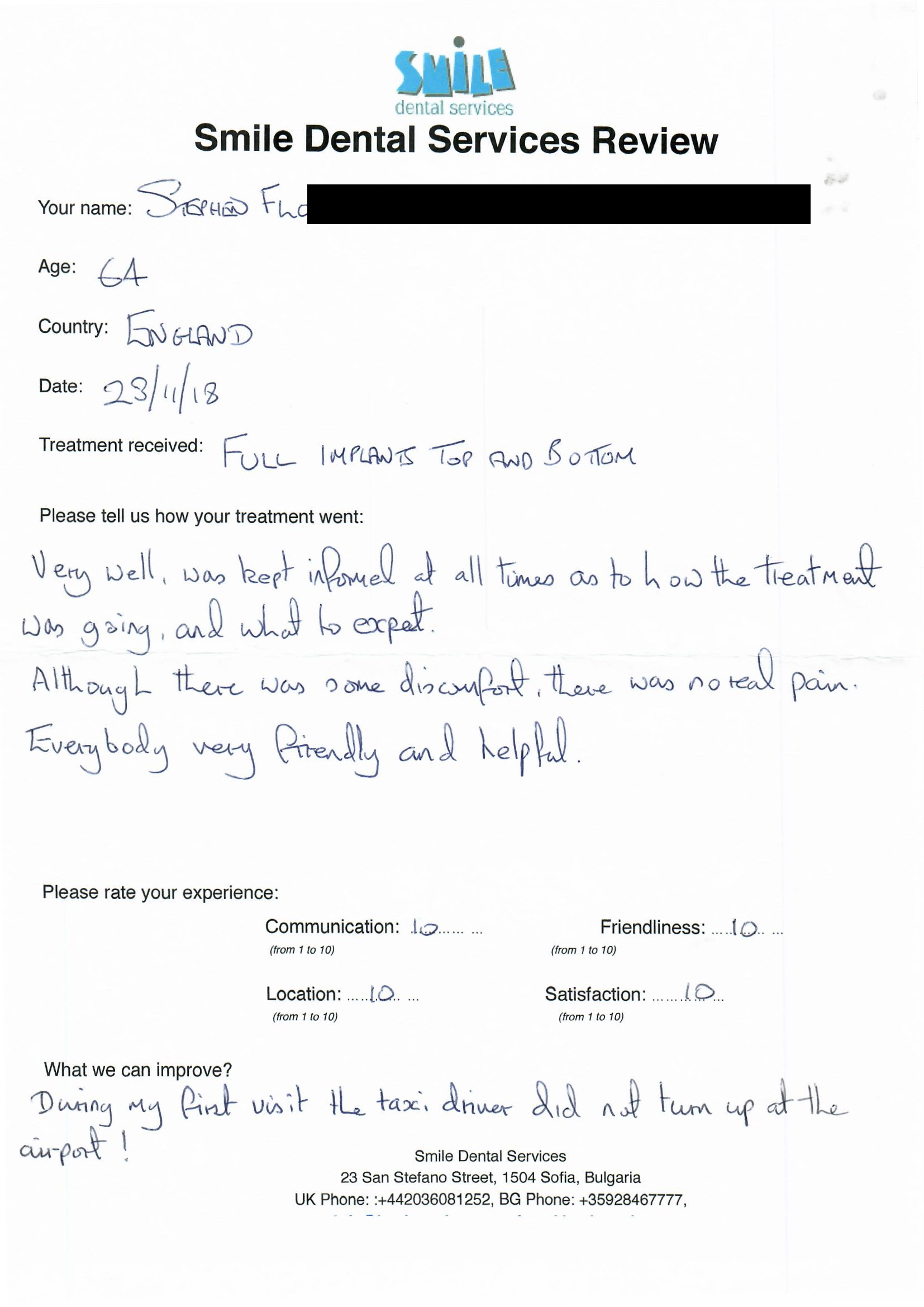 Met at the airport as arranged. Driver, English speaking and very friendly. First appointment Dr. Dimitrov was professional as always and was then referred to Dr. Markov who is as professional as “The Doctor”. Smile Team are exceptional both in service as in empathy to your own individual situation. I would recommend you DO follow up your 2nd visit as the final result is better than I could ever of imagined. You will have to accept that although you will spend 2 weeks, you do have to be available but the end result is “life changing”. Also you get to meet lots of nice people too… clients that are going through the same experience.